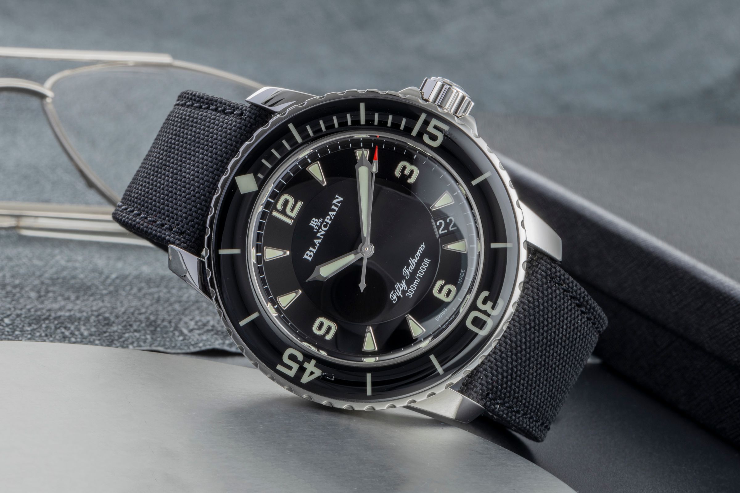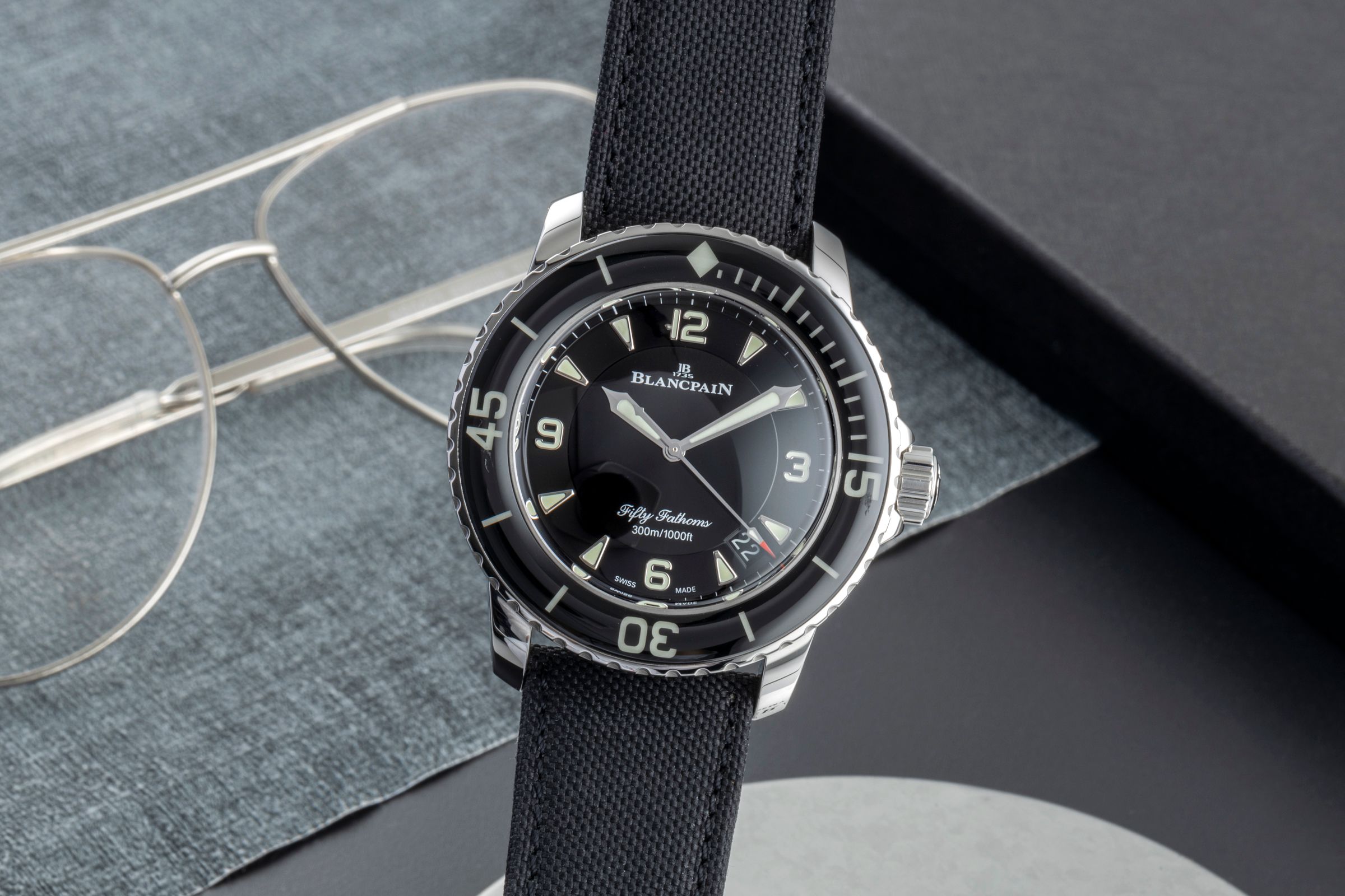 Brand: Blancpain Model: Fifty Fathoms Type: men's watch time of purchase: 08.06.2019 Functions: Date Weight: 118.00 g Movement type: automatic Caliber: 1315 Case number: 5xxx Reference number: 5015-1136-52A Case material: steel Crystal: sapphire glass Dial color: black Accessories: New box as pictured, Original papers as pictured Condition - Dial: very good condition - Crystal: very good condition - Case: very good condition - Bezel: very good condition - Case back: very good condition with minimal traces of use - Bracelet: new and unworn - Movement: fully operational / checked for performance, authenticity and functionality Case Dimensions - Diameter: 45.00 mm - Height: 15.30 mm Bracelet - Material: textile - Max. wrist circumference: 195.00 mm - Clasp: made in Germany We guarantee that the pictured item is an original Blancpain watch. Alternative title: Blancpain Fifty Fathoms Stahl Automatik Herrenuhr Ref 5015-1136-52A Papiere 2019 [2507127]