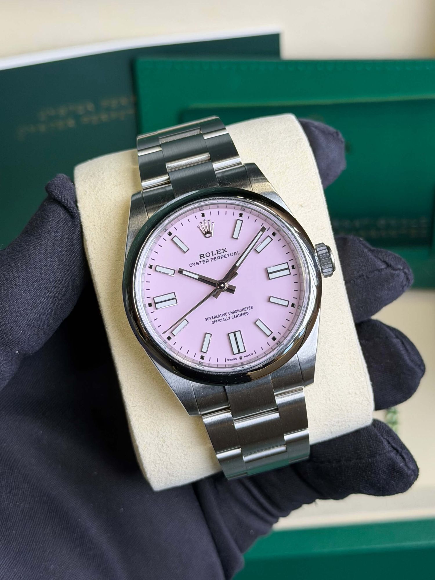 De Rolex Oyster Perpetual 41 ref. 134300 met roze wijzerplaat is een uitgesproken en moderne interpretatie van een tijdloos Rolex-icoon. Dit exemplaar is afkomstig uit 2026, verkeert in volledig ongedragen staat en wordt geleverd als full set.