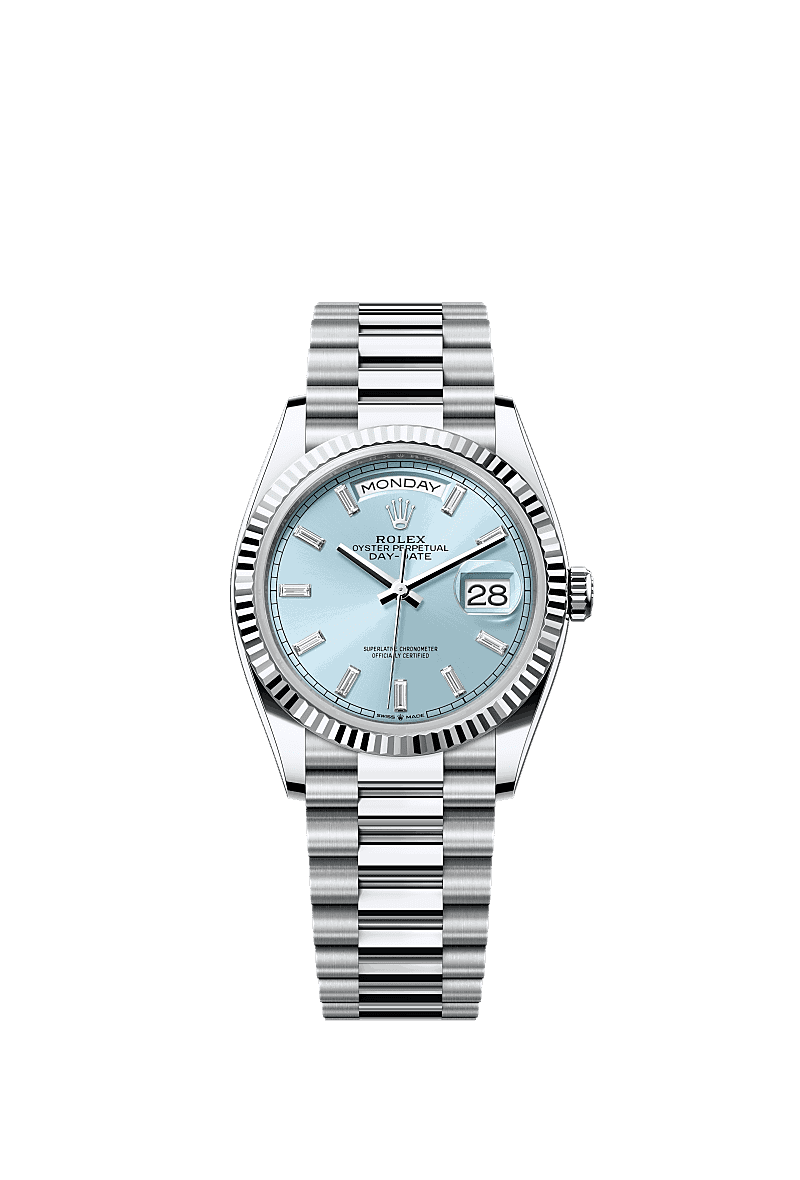 Rolex 128236-0009 Day-Date 36 Platinum - Fluted / Ice Blue - Baguette / President