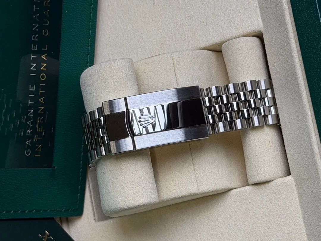 De Rolex Datejust 41 ref. 126334 met groene wijzerplaat is een moderne klassieker die elegantie en frisse stijl combineert in één horloge. Dit model heeft een 41 mm Oystersteel kast met een fluted bezel van 18 kt witgoud, wat een subtiele maar luxueuze uitstraling geeft en perfect contrasteert met de levendige mintgroene sunburst wijzerplaat die bij licht verandert van zachte pasteltonen tot dieper groen, dankzij de verfijnde afwerking. Aangedreven door het Rolex Calibre 3235 automatisch uurwerk biedt dit horloge ongeveer 70 uur gangreserve, een datumaanduiding met vergrootglas en een robuuste waterdichtheid tot 100 m, wat de Datejust tot een betrouwbare dagelijkse metgezel maakt. Met zijn tijdloze ontwerp en opvallende kleur is de 126334 groen een stijlvolle keuze voor wie klassiek en modern wil combineren in één iconisch Rolex horloge.