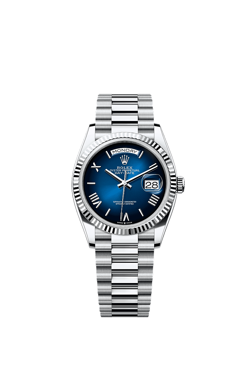 Rolex 128236-0020 - Day-Date 36 Platinum - Fluted / Blue Ombré - Roman / President
