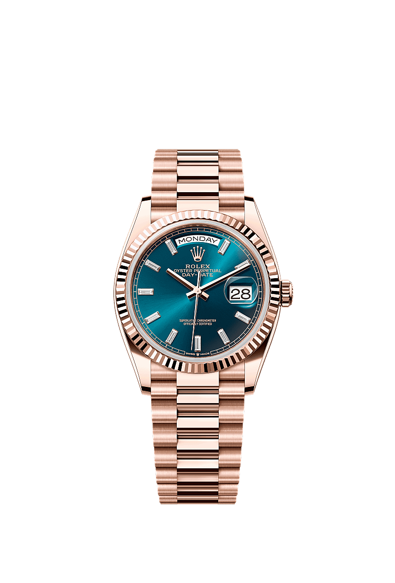 Rolex 128235-0085 - Day-Date 36 Everose Gold - Fluted / Blue-Green - Baguette / President