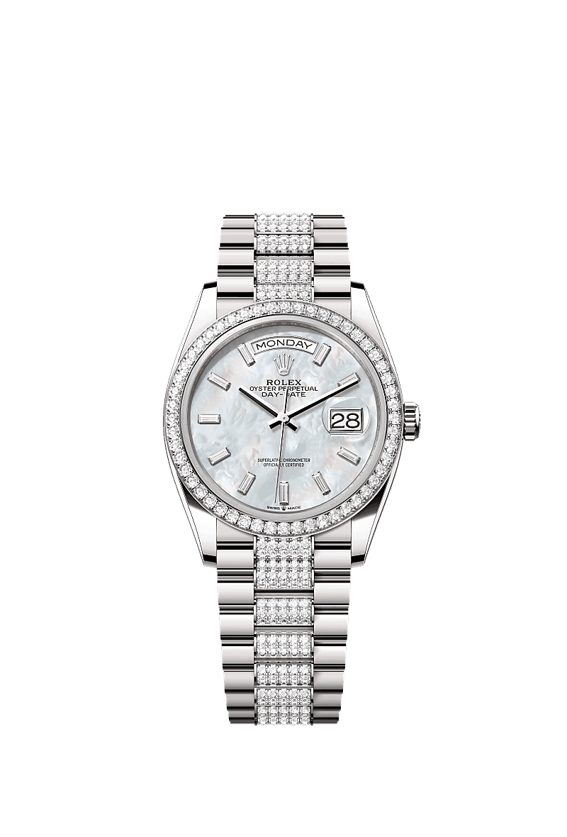 Rolex 128349RBR-0050 - Day-Date 36 White Gold - Diamond / MOP - Baguette / President - Diamond