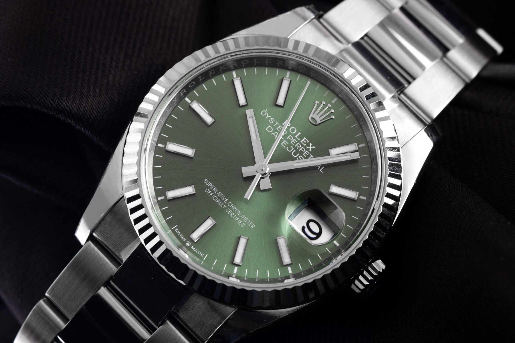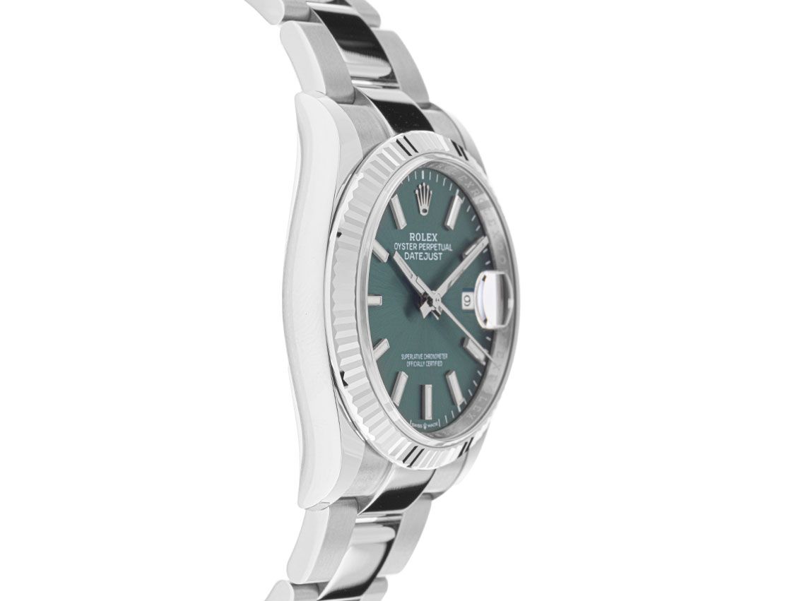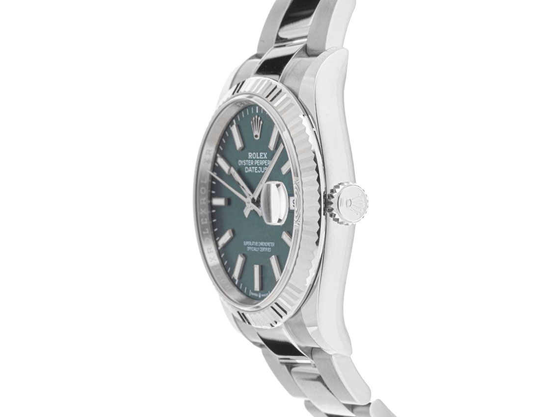 Gehuis van gepolijst en gesatineerd roestvrij staal, behuizingsdiameter zonder kroon 36mm, behuizingshoogte 11,7mm. Lunette van 18kt witgoud, geribbeld en gepolijst. Oyster armband van gepolijst en gesatineerd roestvrij staal, vouwsluiting van roestvrij staal met fabrikantlogo. Wijzerplaat mintgroen met witgouden luminescerende indexen en witgouden luminescerende wijzers. Uurwerk automatisch, chronometer met certificaat, Rolex manufacuurkaliber 3235 met 31 edelstenen, gangreserve van ongeveer 70 uur. Weergave van uur, minuut en seconde via centrale wijzers met seconde-stop voor nauwkeurige tijdinstelling, datumaanduiding met snelle aanpassing onder vergrootglas bij 3 uur. Saffierglas krasbestendig. Kroon met schroefdraad en fabrikantlogo. Achterkant van roestvrij staal, geschroefd. Gewicht van het horloge inclusief armband 127g, lengte van de armband inclusief behuizing 175mm. Waterdicht tot 10 ATM. Referentienummer: 126234, behuizingsnummer: W8L33XXX, ID: P2529190000226H-13900/9550, artikelnummer: 10000084842. Originele Rolex doos met omdoos en garantiepapieren van april 2024, nieuwe Rolex garantiekaart zonder landcode, evenals beschrijving, lederen etui, Rolex chronometerzegel en Watchregister uittreksel van februari 2026, The Watch Register certificaat / zonder vermelding (Internationale database voor verloren of gestolen horloges), Full Set. Investering met waardevermeerderingspotentieel. Als nieuw. Leveringstijd direct.