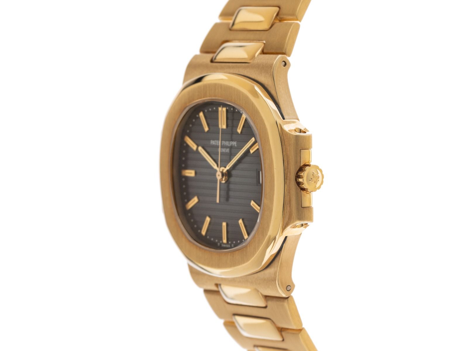 Patek Philippe Nautilus 18kt Gelbgold Automatik Armband 18kt GelbgoldGehäuse 18kt Gelbgold poliert und satiniert, Gehäusedurchmesser ohne Krone 37mm, Gehäusehöhe 7,5mm. Lünette 18kt Gelbgold poliert und satiniert. Armband 18kt Gelbgold poliert und satiniert, Doppelsicherheitsfaltschließe 18kt Gelbgold mit Hersteller-Logo. Zifferblatt schwarz matt mit Streifenguillochierung, aufgesetzten gelbgoldenen Indexen und gelbgoldenen Zeigern. Uhrwerk Automatik, Chronometer mit Genfer Siegel, Patek Philippe Manufakturkaliber 330/194 mit 30 Edelsteinen, Werknummer: 3.026.XXX. Anzeige von Stunde, Minute und Sekunde über Zeiger aus der Mitte, Datumsanzeige mit Schnellverstellung bei 3 Uhr. Saphirglas kratzfest. Krone mit Flankenschutz und Hersteller-Logo. Boden 18kt Gelbgold verschraubt. Gewicht der Uhr inklusive Armband 143g, Länge des Armbandes inklusive Gehäuse 170mm. Referenznummer: 3800/001 , Gehäusenummer: 4.058.XXX, ID: KS17981500000226H-129000, Artikelnummer: 10000084854. Mit Gangkontrolle von Februar 2026. Original Patek Philippe Box mit Umkarton und Garantie Papiere von Februar 1999 sowie Beschreibung, Ursprungsbeleg von Patek Philippe, Servicerechnung von Bucherer von Januar 2020 und Watchregister Auszug von Februar 2026, The Watch Register Zertifikat / ohne Eintrag (Internationale Datenbank für verlorene oder gestohlene Uhren), Full Set. Kapitalanlage mit Wertsteigerungspotential, extrem seltenes Sammlerstück, aus erster Hand, fast nicht getragen. Original Unpoliert. Lieferzeit sofort.