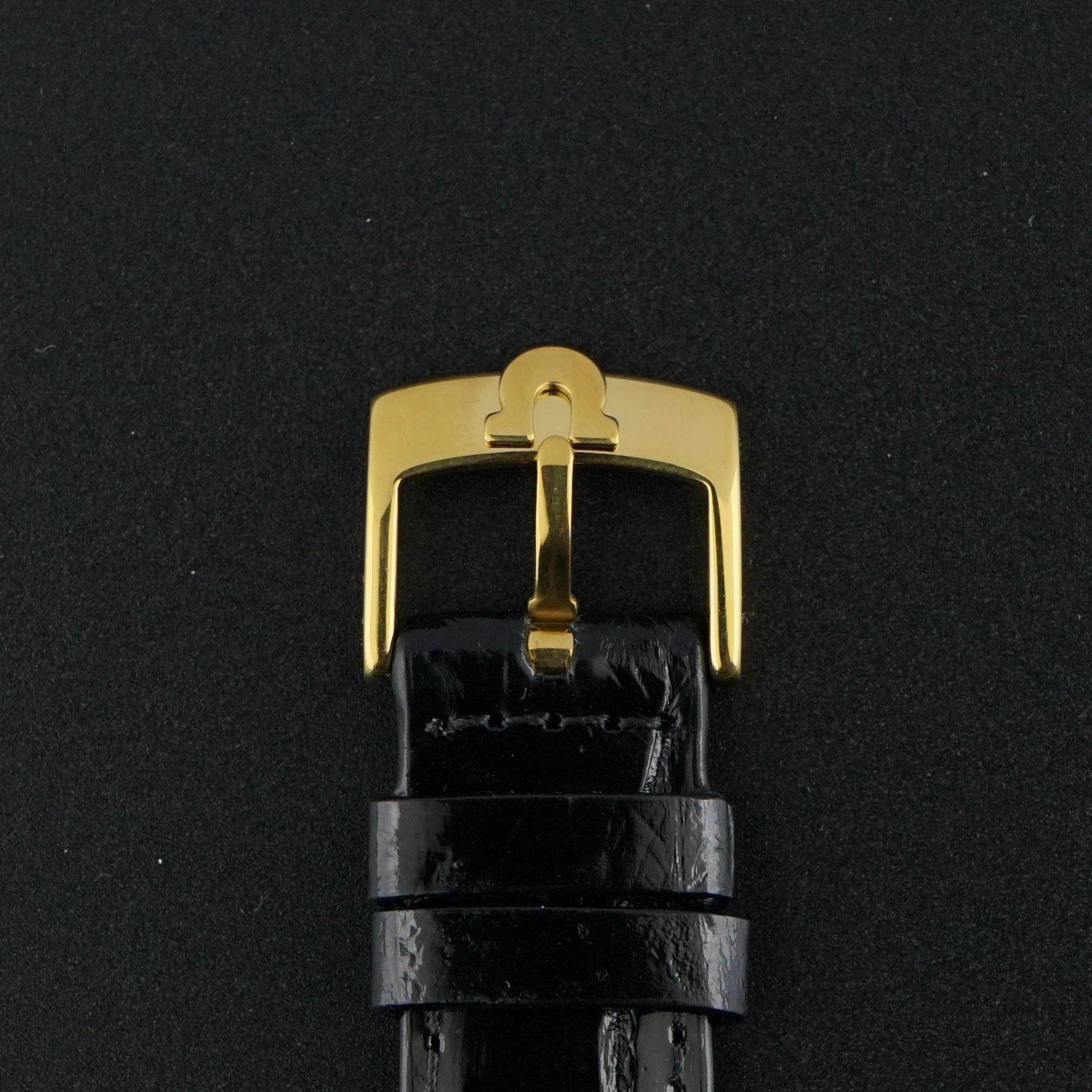De kast van 34,5 mm is aan de voorkant verguld met een stalen kastdeksel, wat de elegante en klassieke verhoudingen behoudt. Binnenin draait het automatische kaliber 552 uurwerk, dat in februari 2026 is onderhouden en momenteel uitstekend loopt en functioneert. Het horloge komt op een top-grain leren band met krokodillenmotief en een lichte glanzende afwerking in zwart.