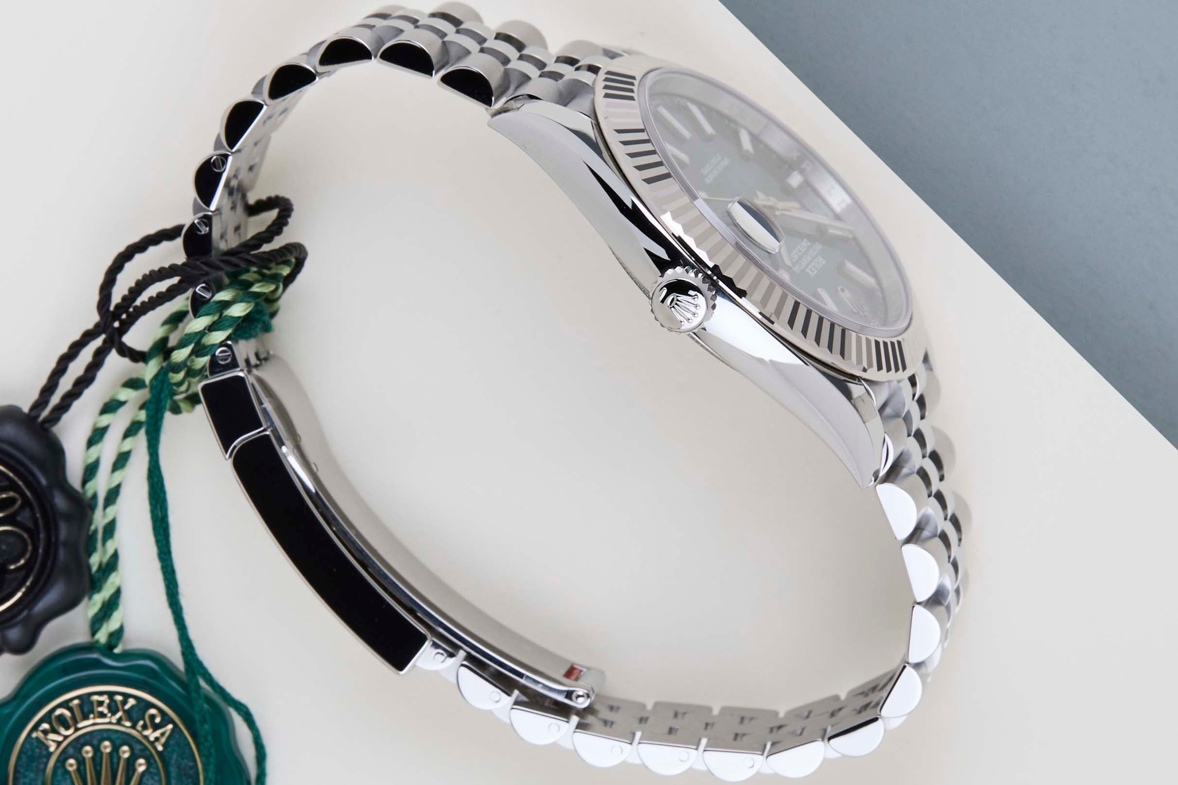 New & Unworn | Full Set | International Rolex Warranty Until February 2031 | Including Rolex White Tag.Rolex introduced the original Datejust in 1945 to celebrate the company's 40th anniversary. Due to the various case sizes and materials, the Datejust has been ingrained in Rolex's history and remains incredibly popular for 75 years.This Rolex Datejust 41 'Mint Green Dial - Jubilee' was sold for the first time in February 2026.This Datejust is made of a combination of 18k White Gold and stainless steel and is fitted with a Jubilee bracelet, which is equipped with the Easylink. This extension, allows the wearer to either extend or shorten the bracelet by 5 millimeters, improving the wearability and usability of the watch.This Rolex Datejust 41 is in New & Unworn condition and comes with the original Rolex Warranty Card and box. Furthermore, the watch still has International Rolex Warranty until February 2031.
