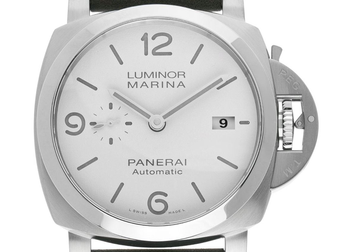 Panerai Luminor Marina Stahl Automatik Armband LederGehäuse Edelstahl satiniert, Gehäusedurchmesser ohne Krone 44mm, Gehäusehöhe 15,65mm. Lünette Edelstahl glatt und poliert. Armband Leder olivgrün mit heller Ziernaht, Anstoßbreite 24mm, Stiftschließe Edelstahl mit Hersteller-Logo. Zifferblatt weiß mit Leuchtindexen und arabischer 6, 9 und 12 sowie Edelstahl Leuchtzeigern. Uhrwerk Automatik, Chronometer mit Zeugnis, Panerai Manufakturkaliber P.9010 mit 31 Edelsteinen. Gangreserve ca. 72 Stunden. Anzeige von Stunde und Minute über Zeiger aus der Mitte, kleine Sekunde mit Sekundenstopp zur Sekundengenauen Einstellung der Uhrzeit bei 9 Uhr, Datumsanzeige mit Schnellverstellung bei 3 Uhr. Saphirglas kratzfest und bombiert. Krone mit Schutzbrücke und Sicherungshebel. Boden Edelstahl verschraubt und graviert. Gewicht der Uhr inklusive Armband 148g. Referenznummer: PAM01314, ID: ST1160129220425H-8900, Artikelnummer: 10000074730. Original Panerai Box mit Umkarton und Garantie Papiere von März 2025 sowie Bandwechselwerkzeug und Ersatzband Kautschuk, Full Set. Ungetragen. Lieferzeit sofort.