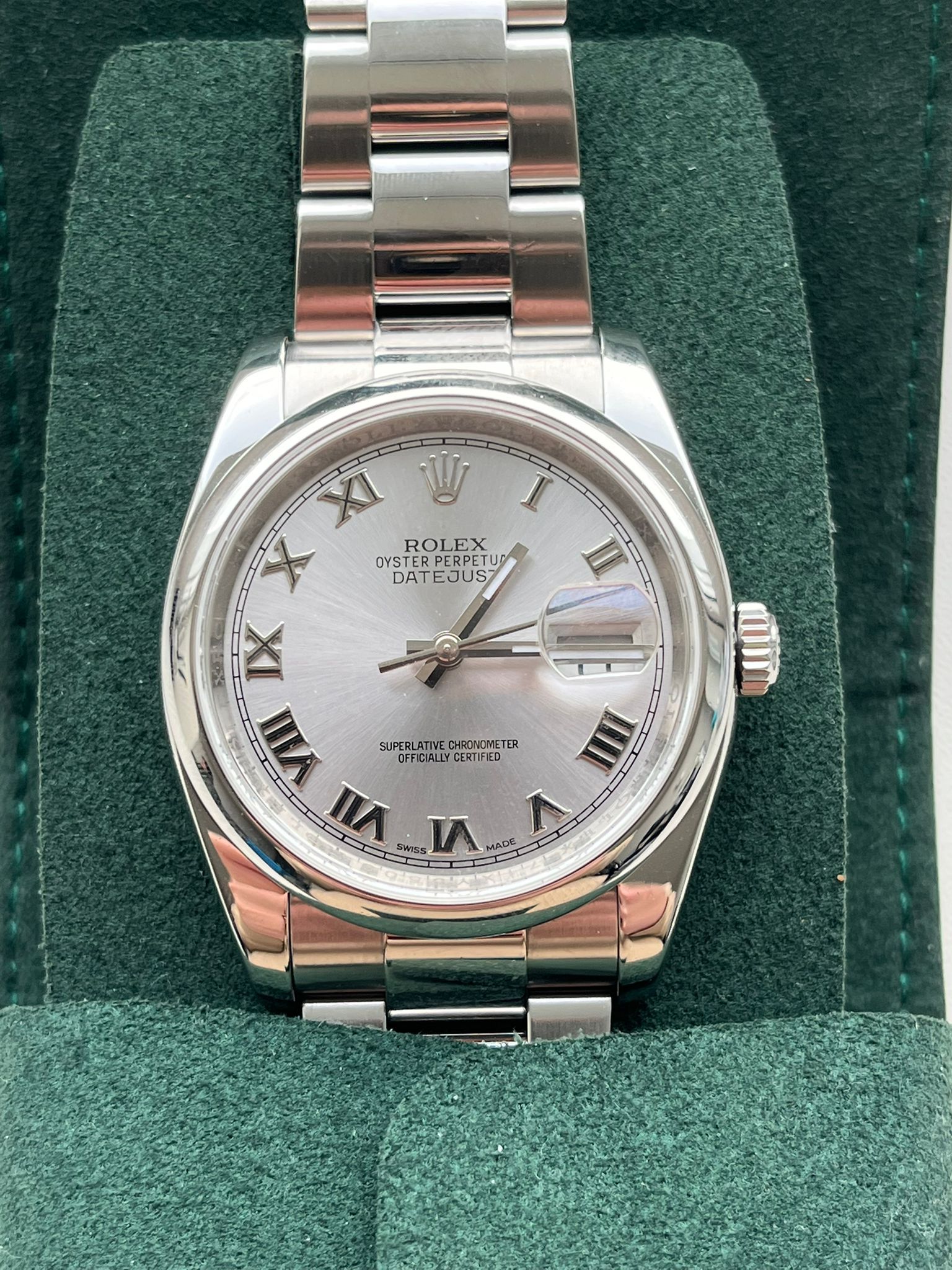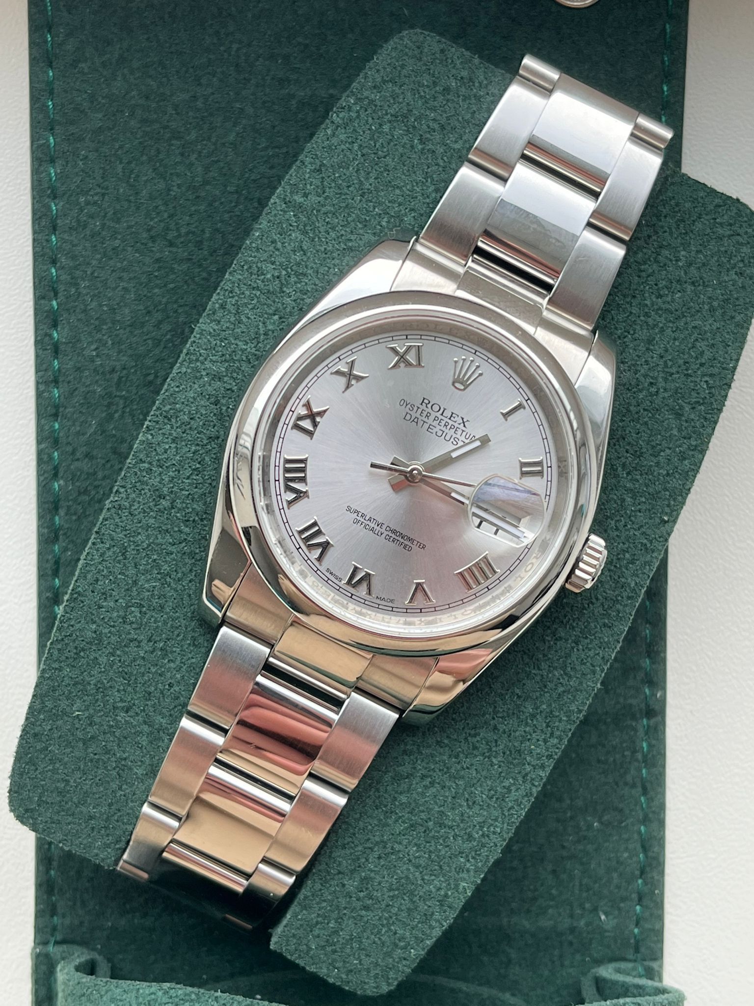 This elegant Rolex Datejust ref. 116200 is presented with the classic silver dial featuring Roman numerals, offering a timeless and refined aesthetic that perfectly embodies the essence of the Rolex Datejust collection. The combination of the 36 mm Oyster case in stainless steel, the smooth polished bezel, and the clean, balanced dial results in a versatile timepiece that seamlessly blends everyday wearability with understated sophistication. Originally sold in 2012, this example is in good condition and remains a highly attractive piece for both collectors and daily wearers.The watch is powered by the Rolex in-house caliber 3135, renowned for its precision, durability, and reliability, and is of course running within factory specifications. The Datejust has long been celebrated as one of Rolex’s most iconic and enduring models, known for its timeless design and exceptional performance.