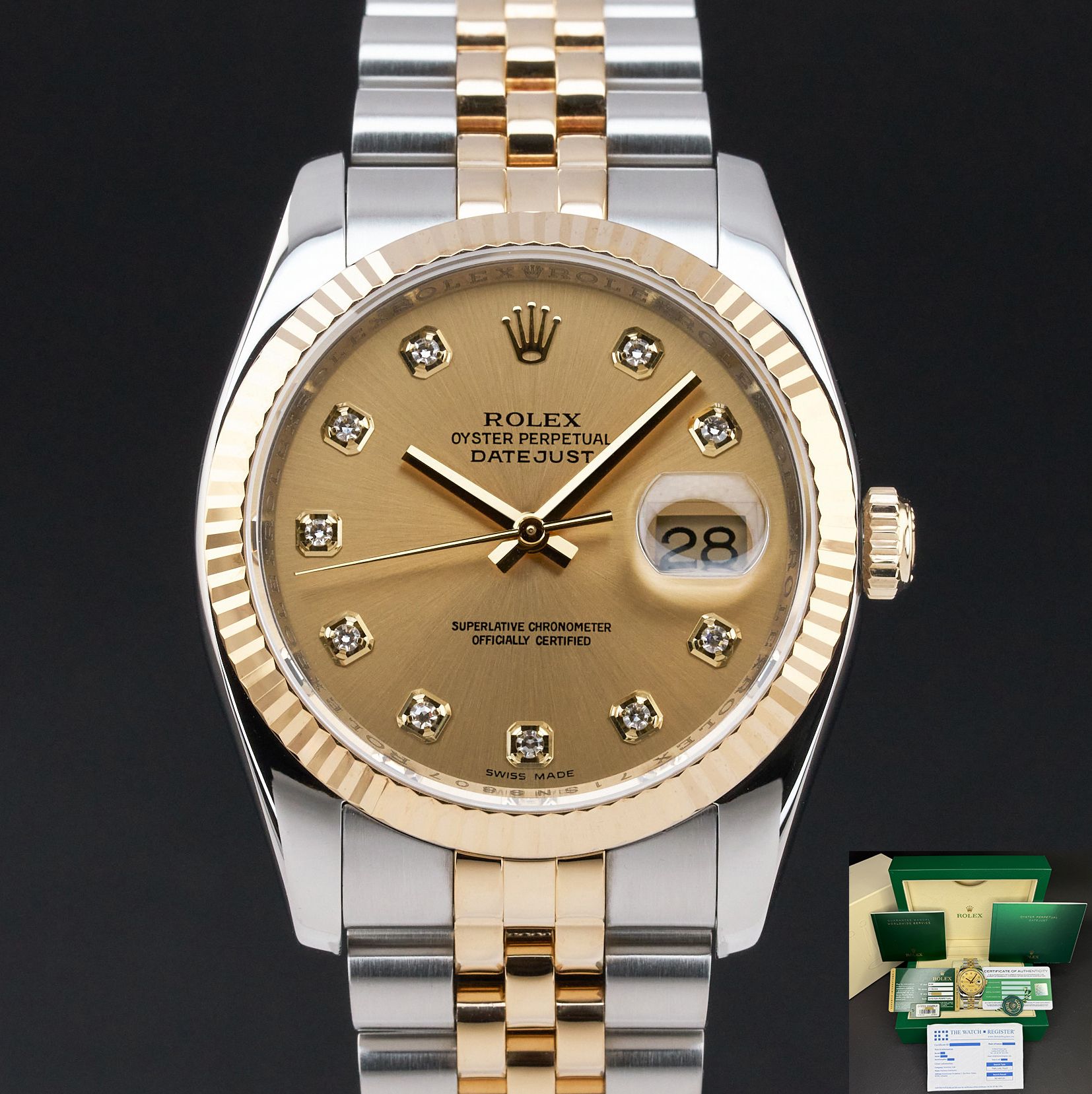 Rolex Datejust 36 Rolex Datejust, 116233, 36mm, Two-Tone, Champagne Diamond dial, Fullset, 1y warranty