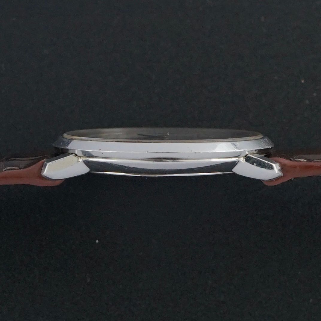 De kast van roestvrij staal heeft een breedte van 33mm en een slank, elegant profiel van slechts 6,1mm dik, waardoor hij comfortabel en discreet om de pols zit. Binnenin tikt het kaliber 625 handopwindmechanisme, dat volledig is onderhouden in februari 2026 en momenteel uitstekend loopt en functioneert.