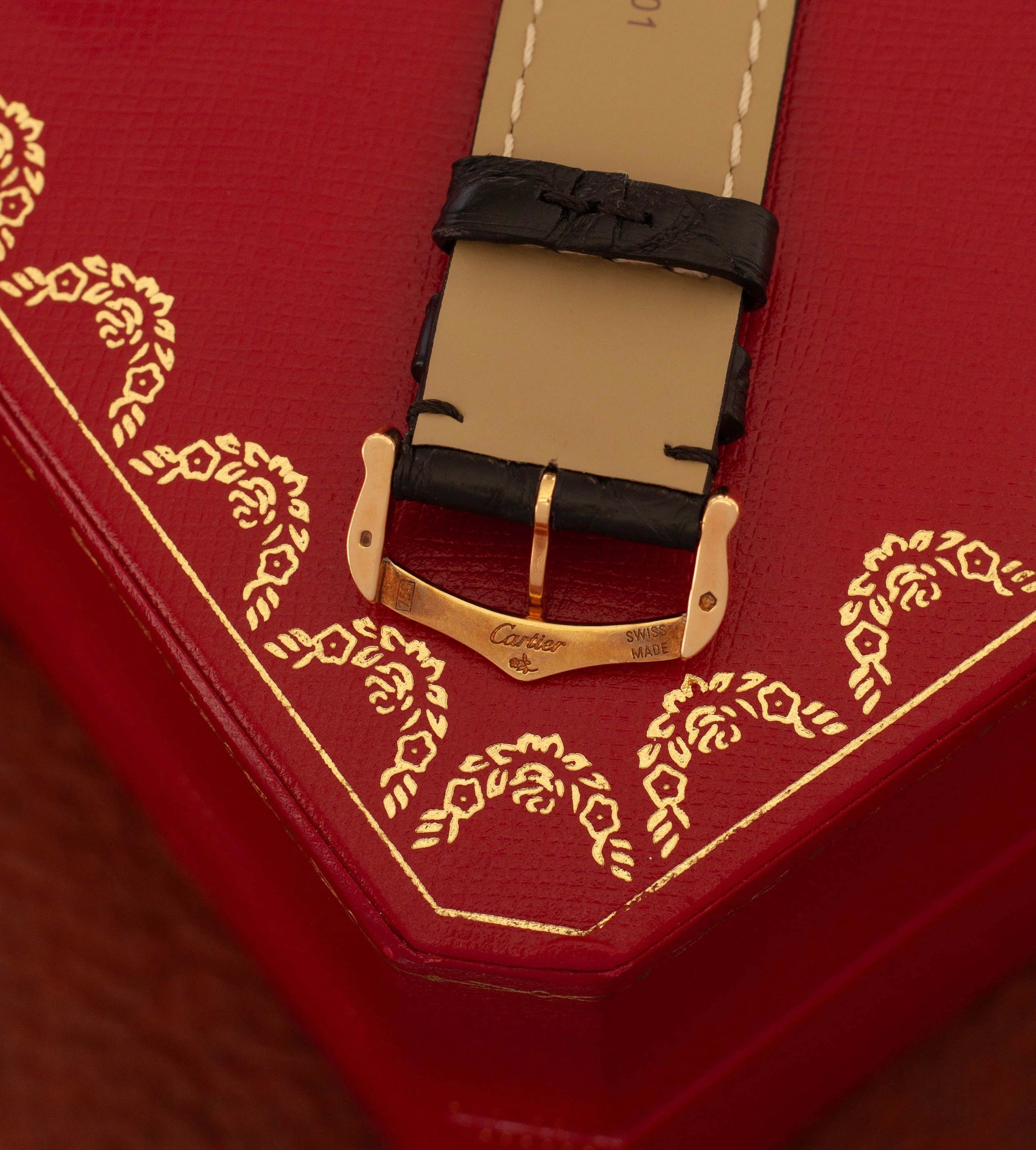Daarnaast komt deze Cartier Tank Solo Large 2742 op een zwarte leren band, met een 18K geelgouden Cartier gesp. Dit maakt het horloge ook een schitterend sieraad. Uiteraard leveren we dit klassieke Cartier Tank horloge inclusief de originele Cartier doos. Het is kenmerkend dat de binnenkussen en de binnenkant van Cartier dozen uit deze periode iets sneller slijten. Dit specifieke stuk vertoont enkele lichte tekenen van veroudering op het kussen en de binnenkant van de doos. We hebben het witte kussen vervangen door een nieuw vervangend kussen. Natuurlijk komt deze Cartier Tank Solo Large met 24 maanden garantie op het uurwerk.