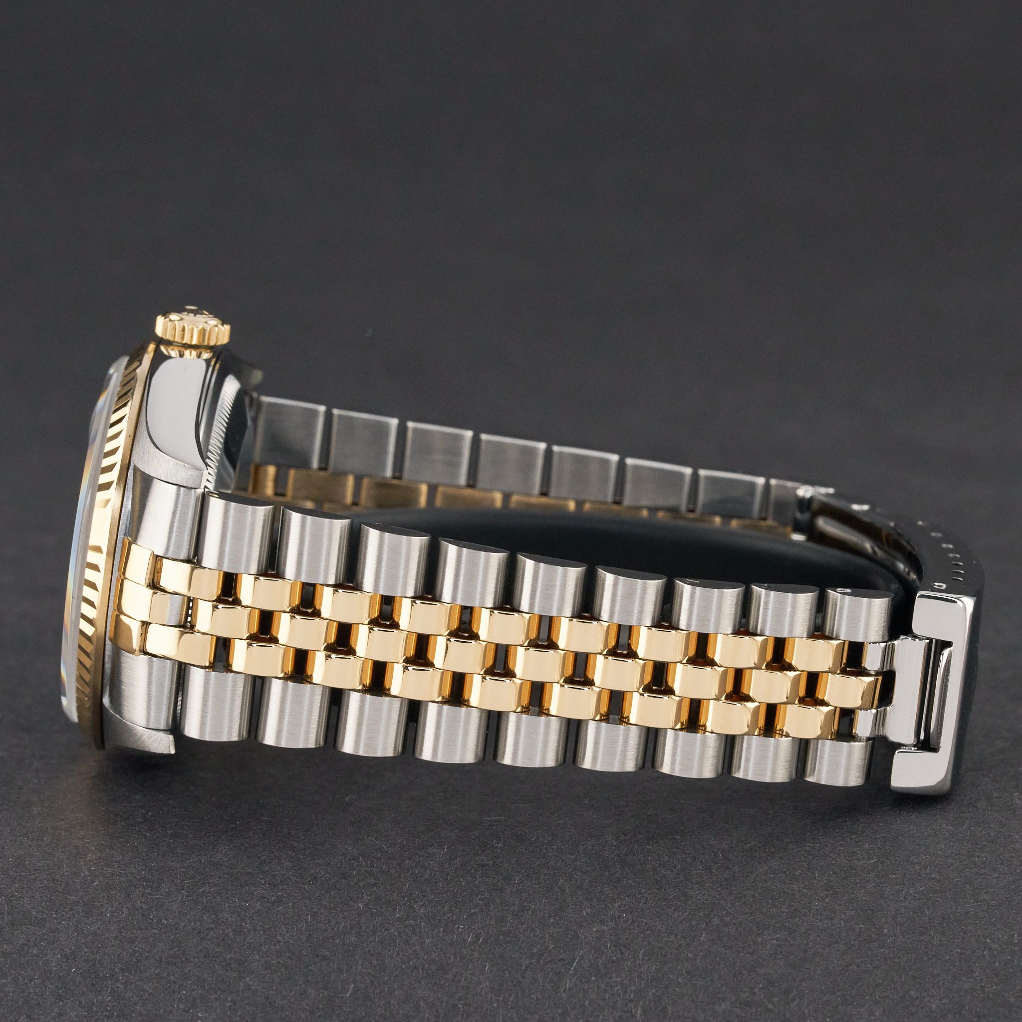 This Rolex Datejust 16233 features a Black Roman dial and is crafted from 18K yellow gold and stainless steel, with a production year of 1996.Case No: T64XXXX