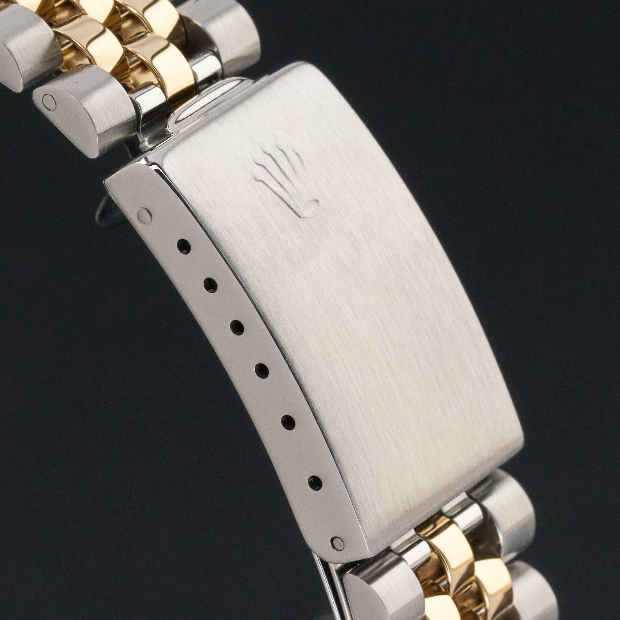 Deze Rolex Datejust 16233 heeft een zwarte grote diamanten wijzerplaat en is vervaardigd uit 18K geelgoud en roestvrij staal, met een productiejaar van 1995.