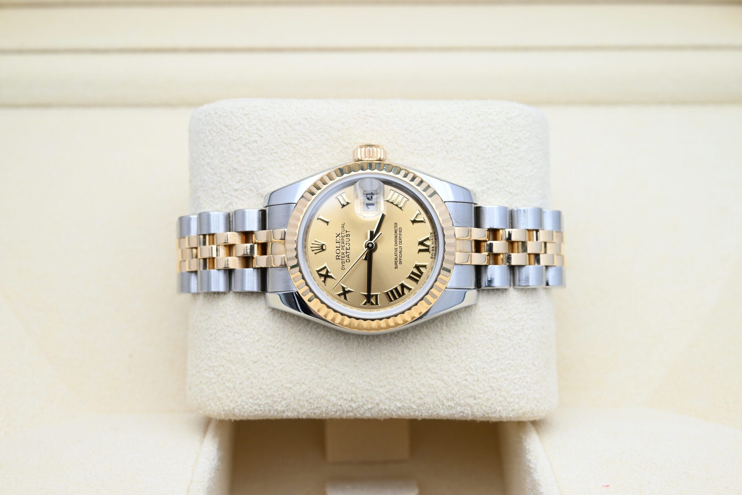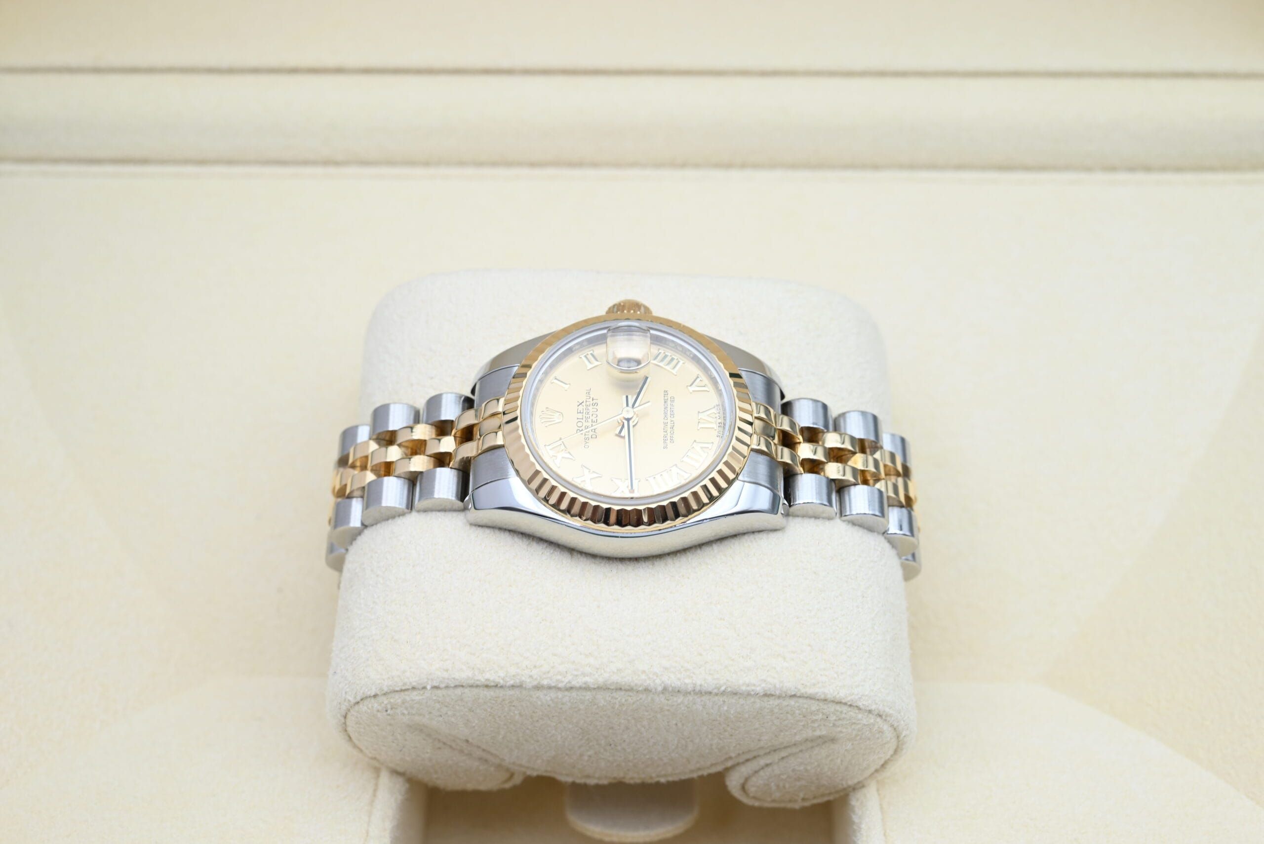 Rolex Lady-Datejust 179173 with the gold roman dial from 2012 in excellent condition, comes complete with the full set.All of our watches have been thoroughly checked by our own watchmaker and serviced when needed.