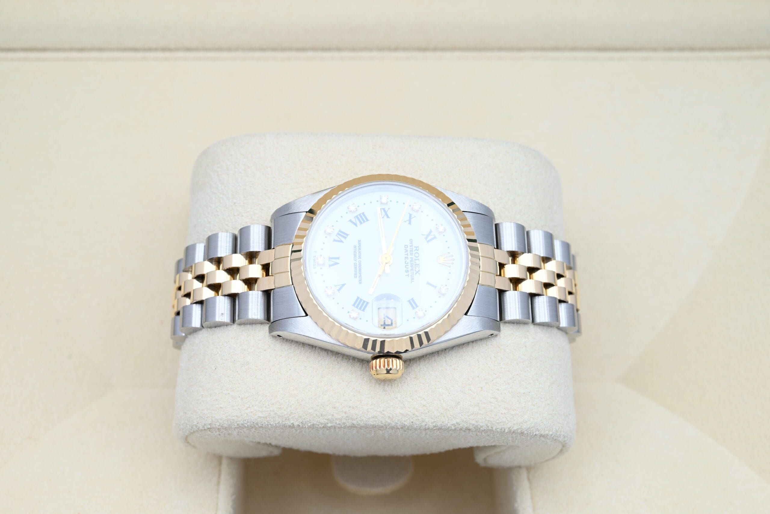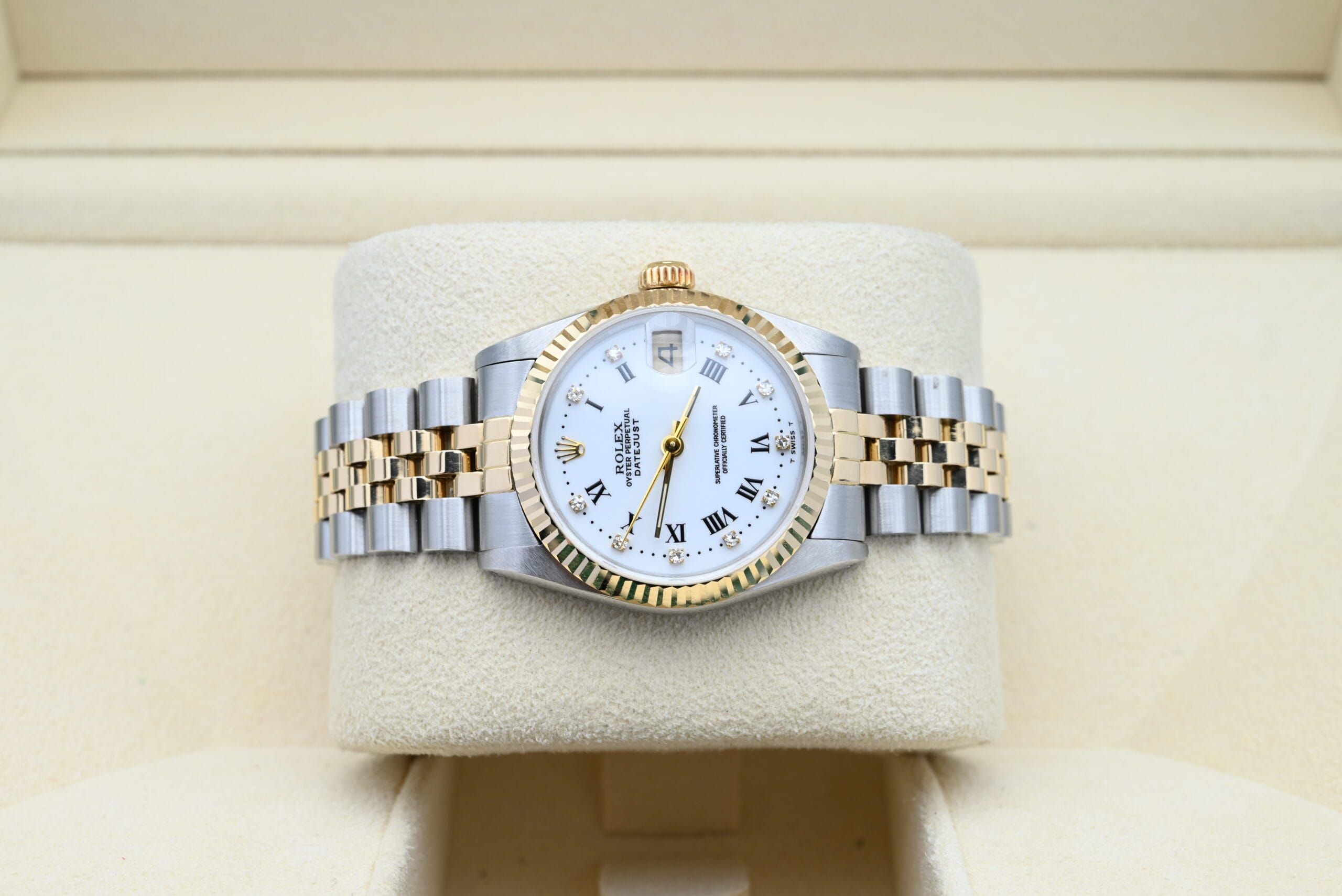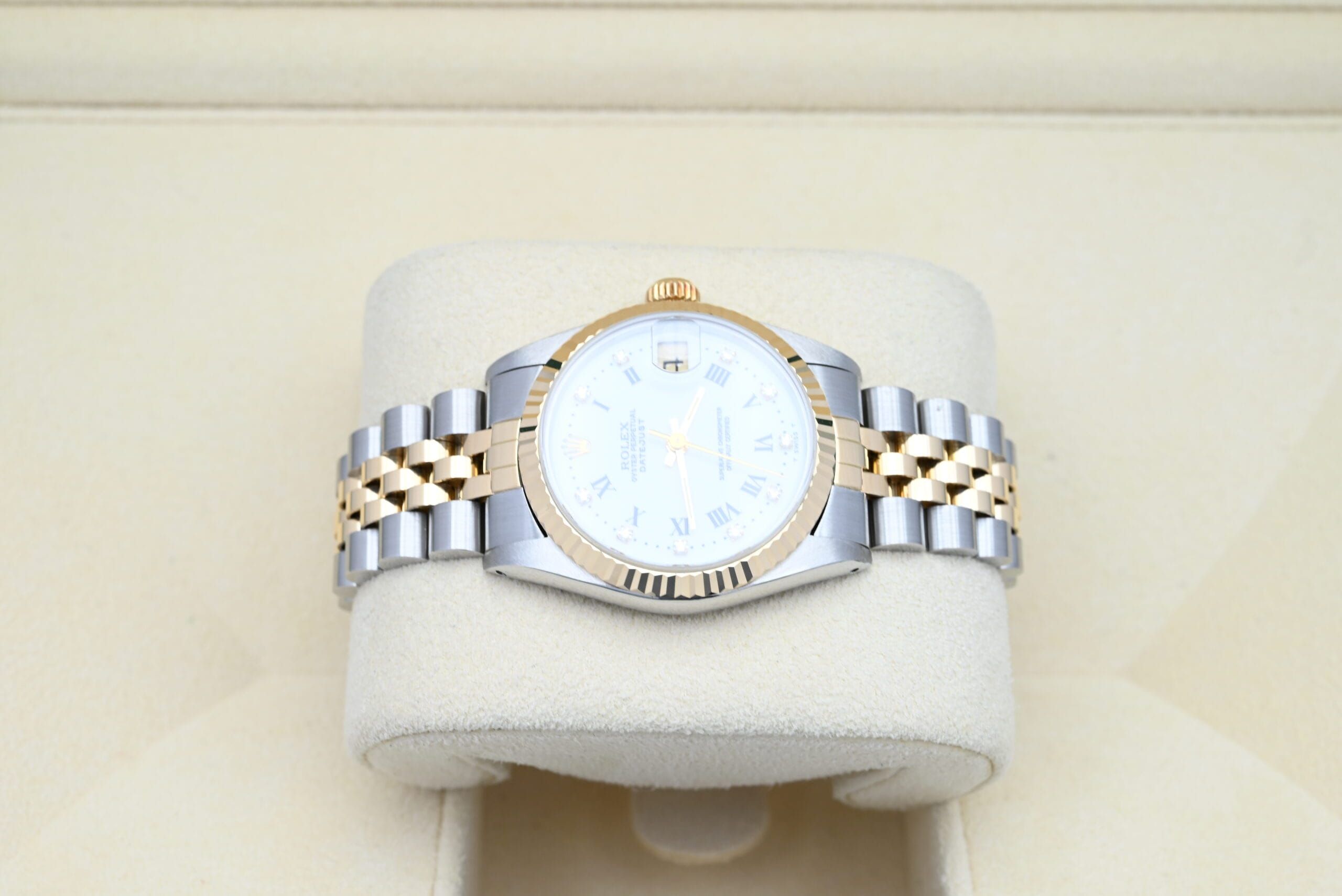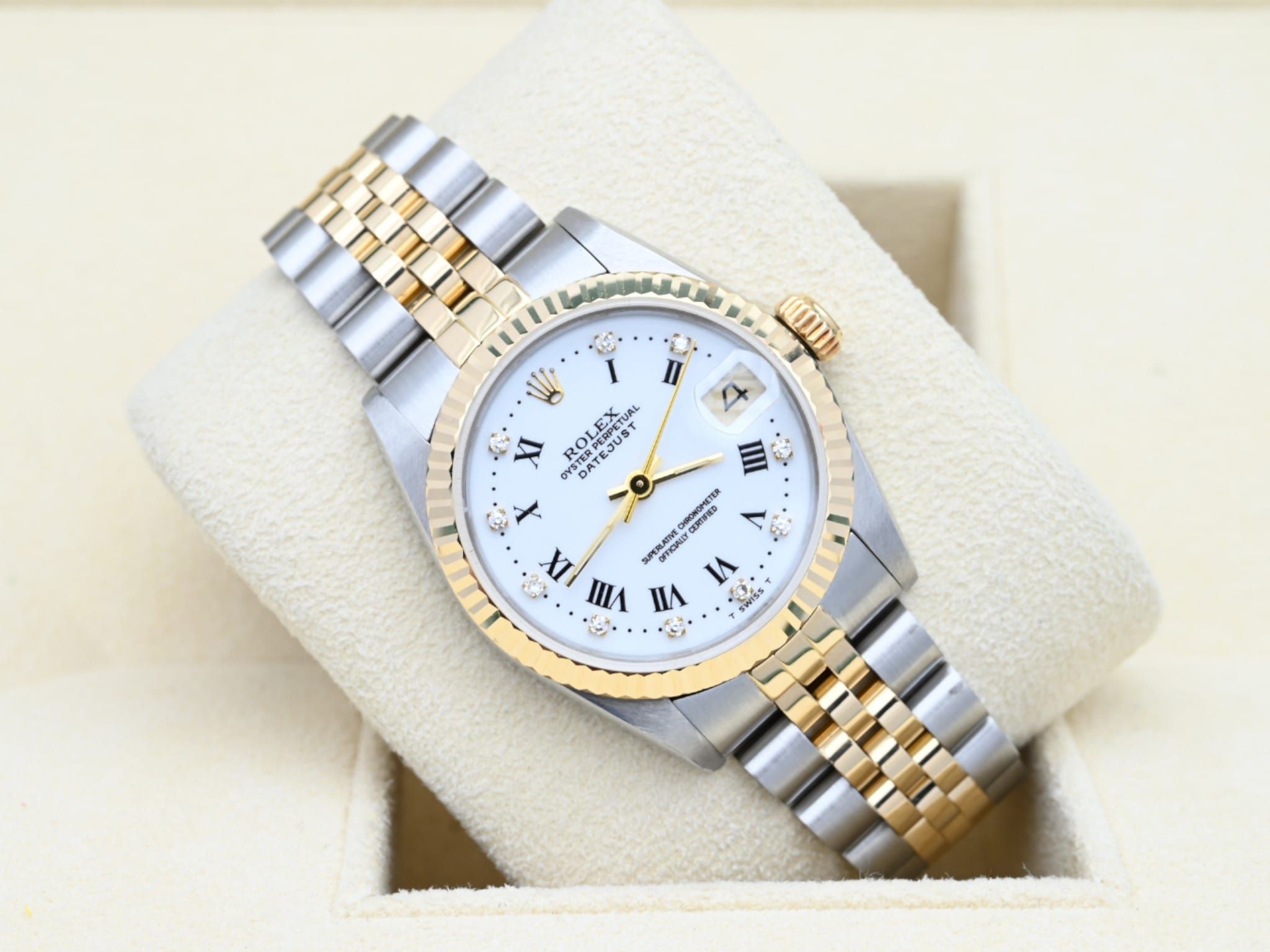 Rolex Datejust 68273 uit 1989 met de witte diamanten wijzerplaat in uitstekende staat, inclusief de originele doos en papieren. Al onze horloges zijn grondig gecontroleerd door onze eigen horlogemaker en waar nodig onderhouden.