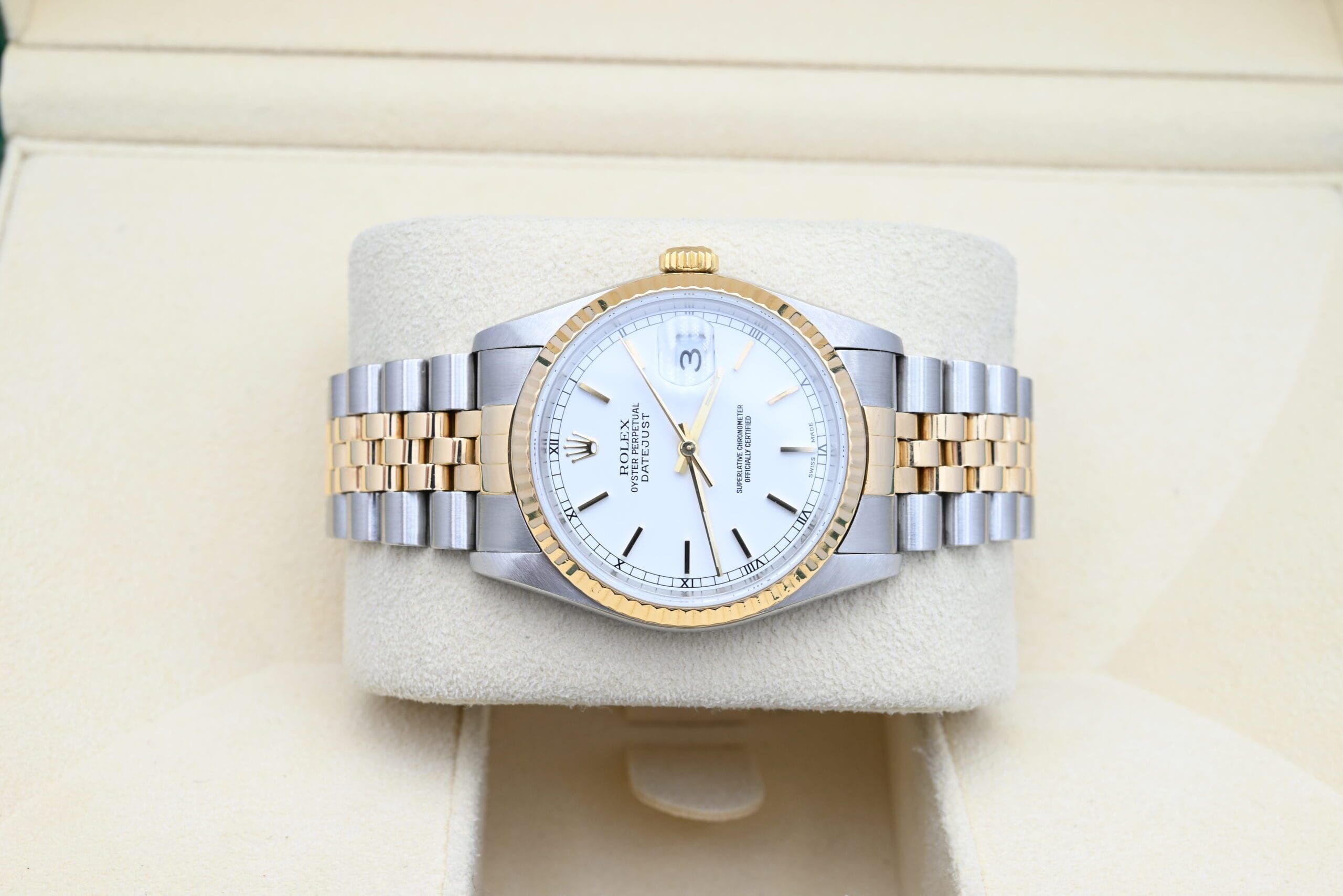 Rolex Datejust Ref. 16233 from 1990 with the white dial in excellent condition, including the original box and papers.All of our watches have been thoroughly checked by our own watchmaker and serviced when needed.