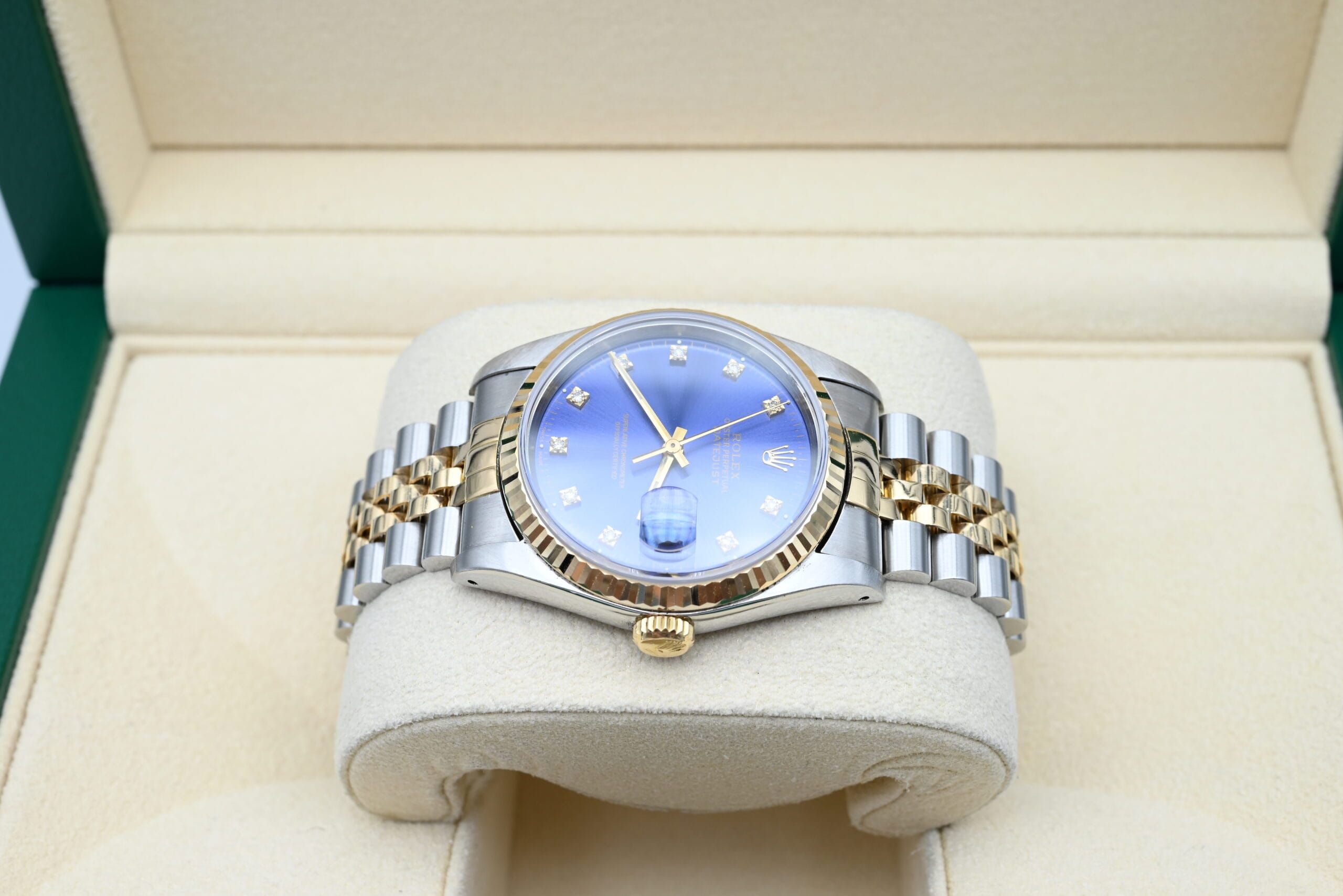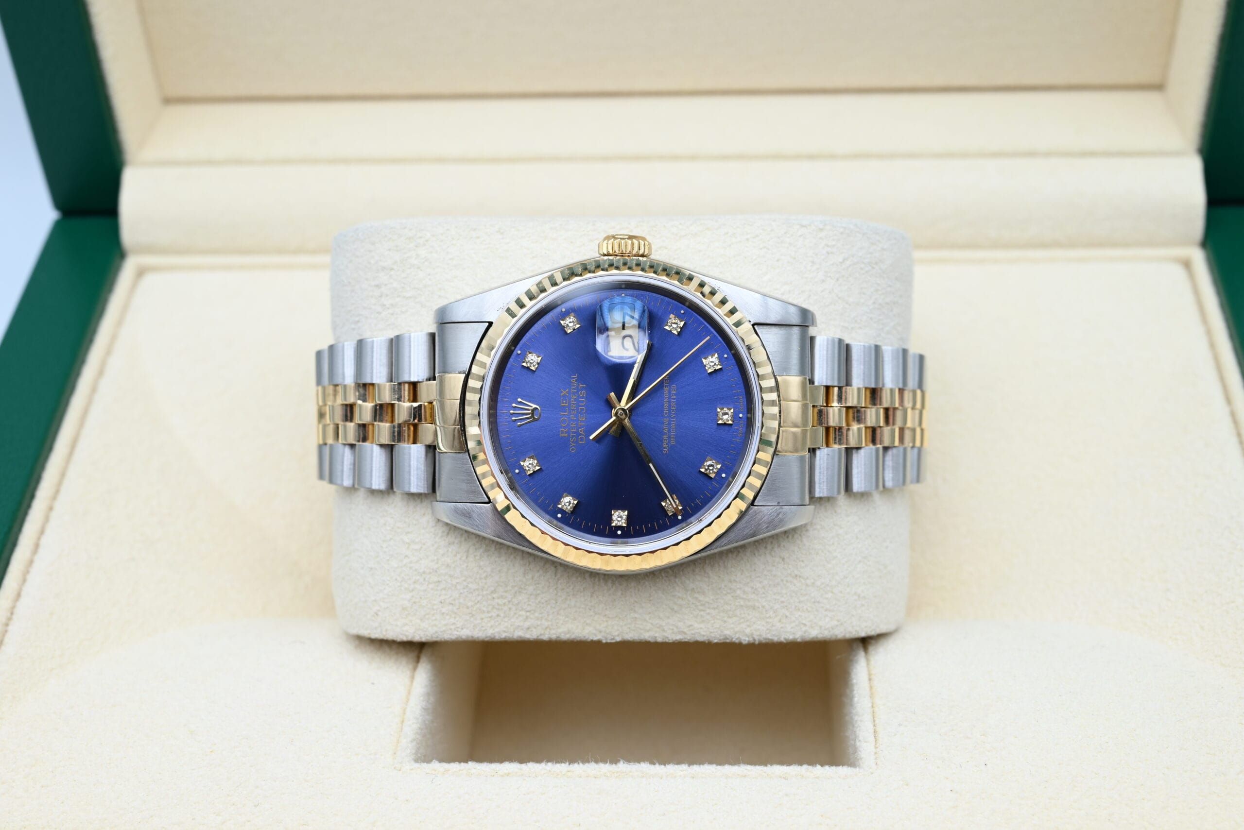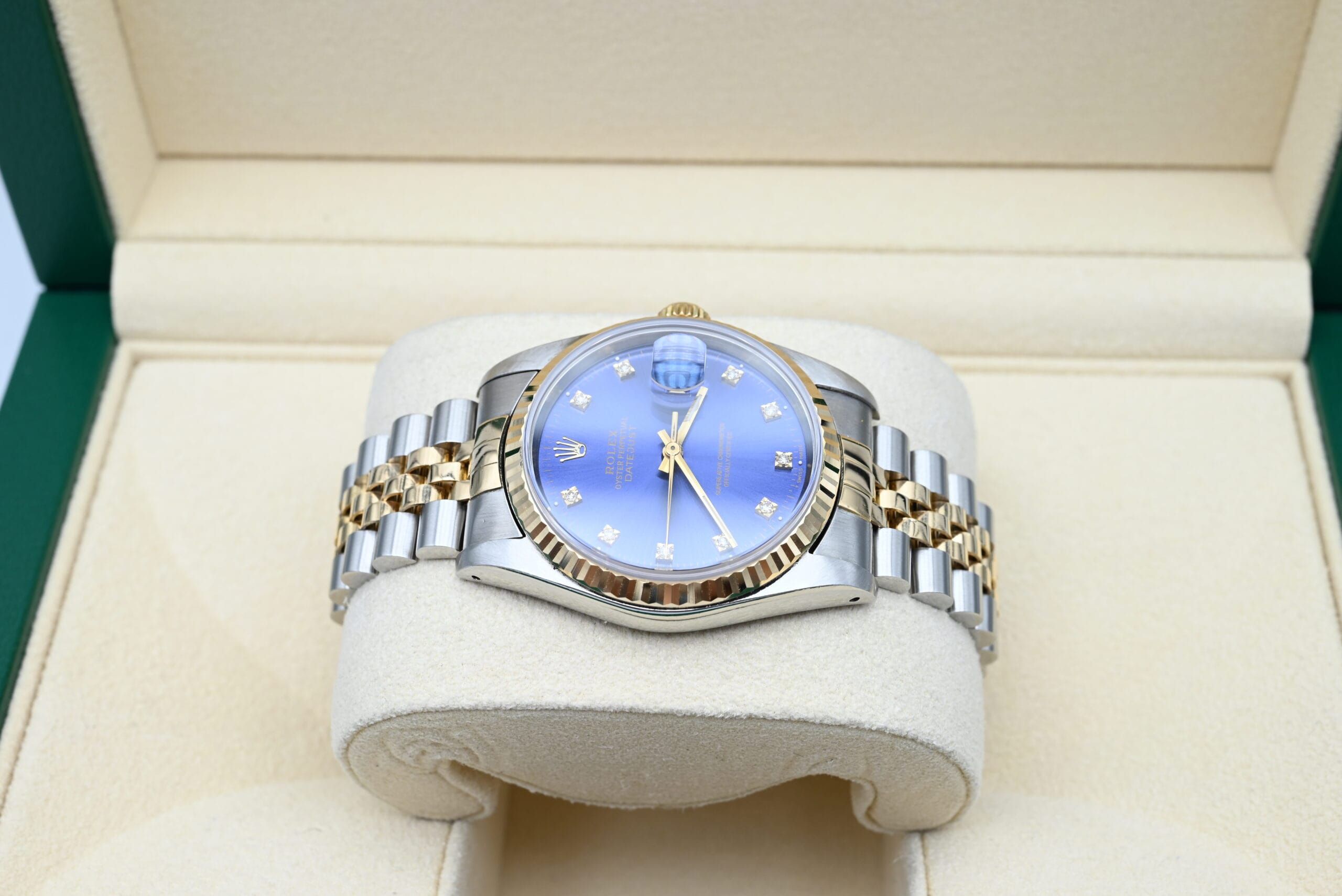 Rolex Datejust Ref. 16233 uit 1990 met de blauwe diamanten wijzerplaat in uitstekende staat, inclusief de originele doos en papieren. Al onze horloges zijn grondig gecontroleerd door onze eigen horlogemaker en waar nodig onderhouden.