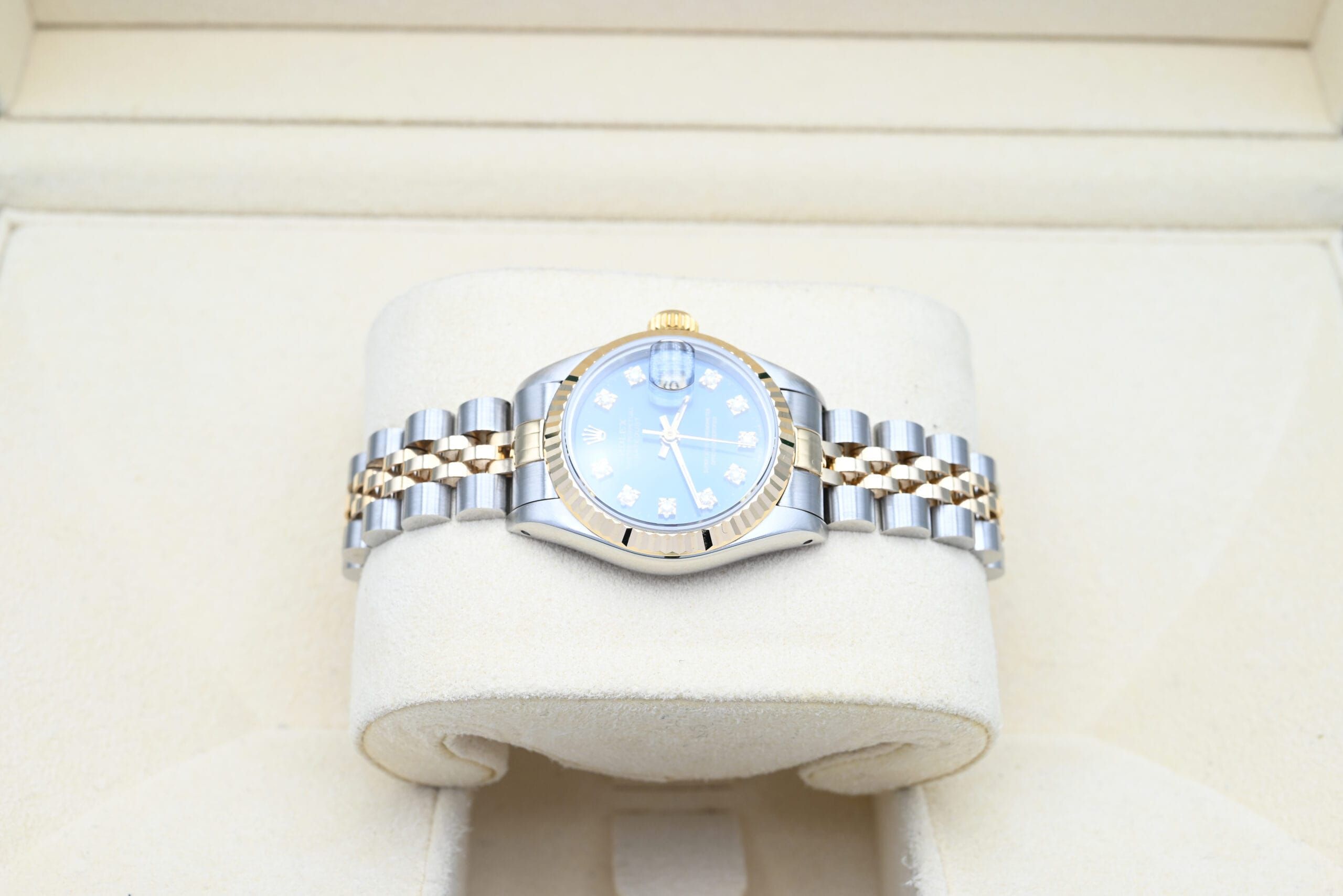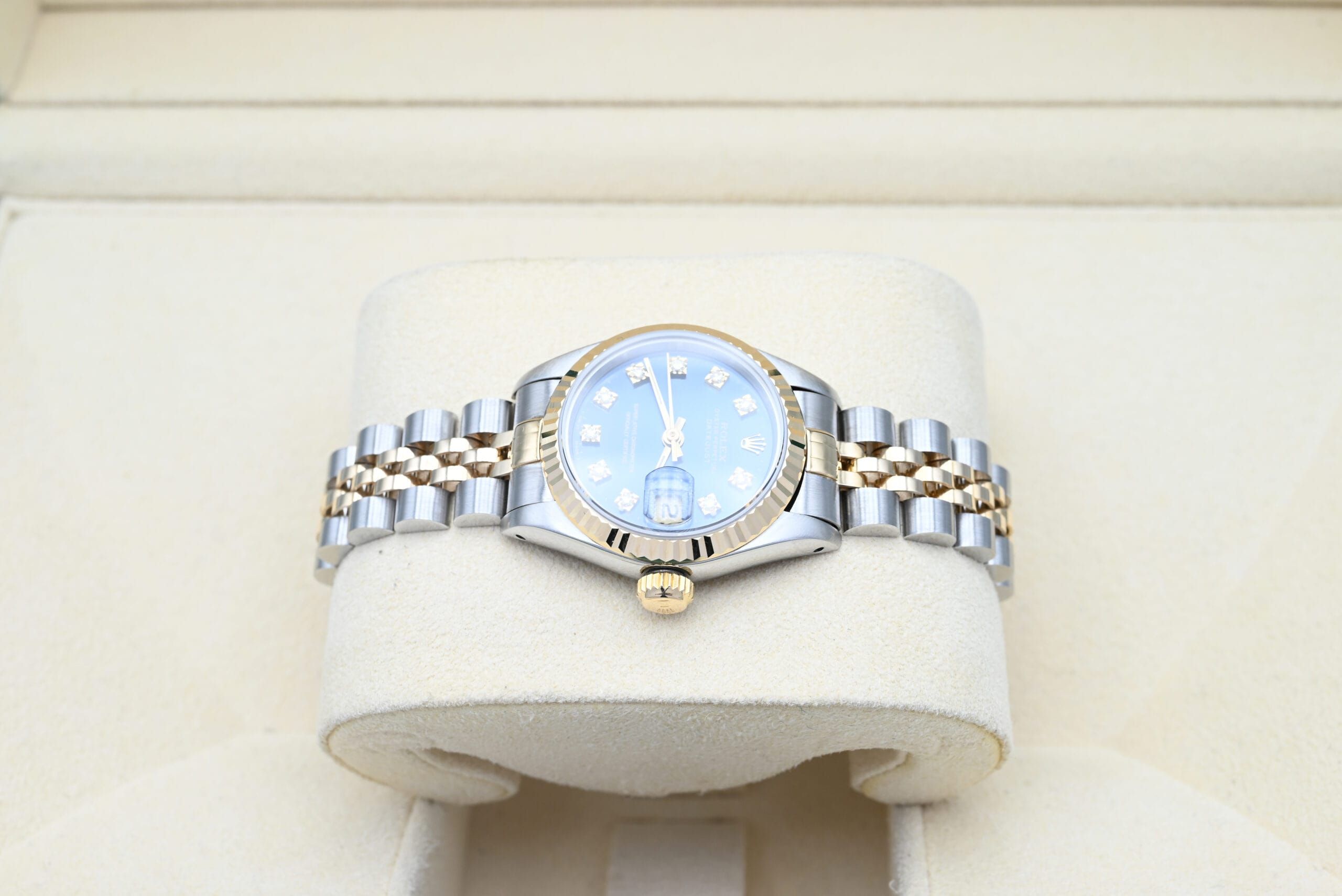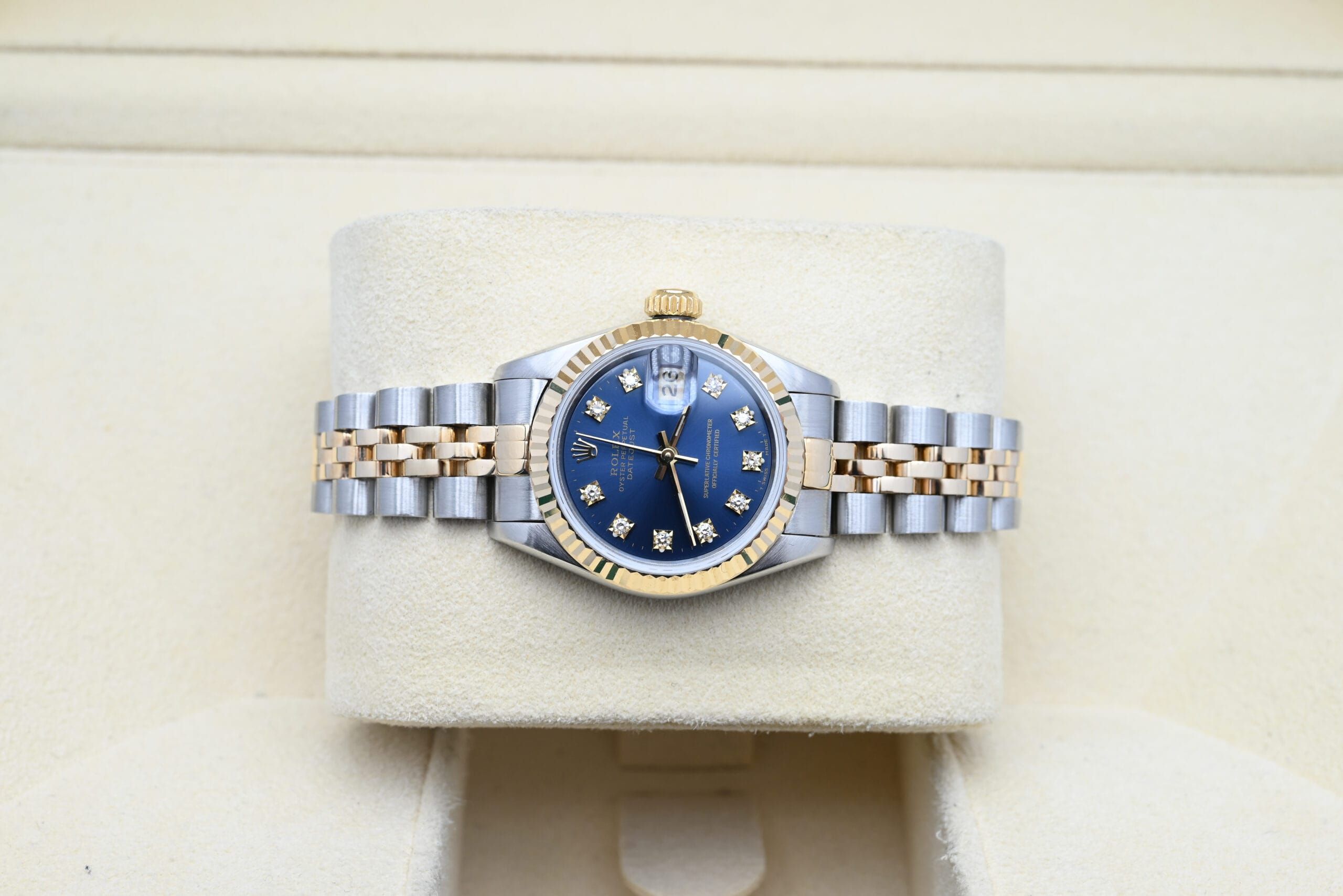 Rolex Lady-Datejust 69173 with the blue diamond dial from 1988 in excellent condition, comes complete with the full set.All of our watches have been thoroughly checked by our own watchmaker and serviced when needed.