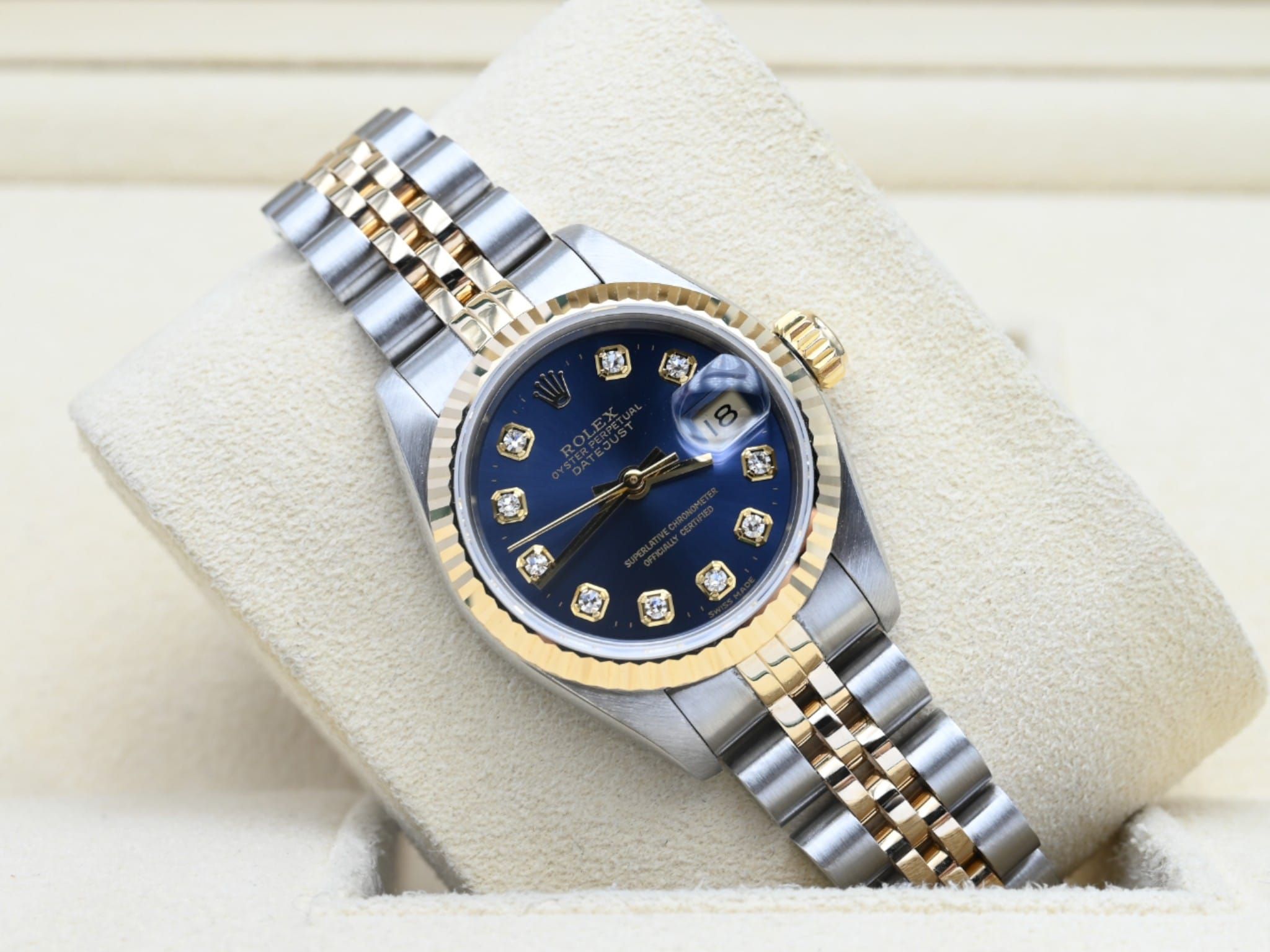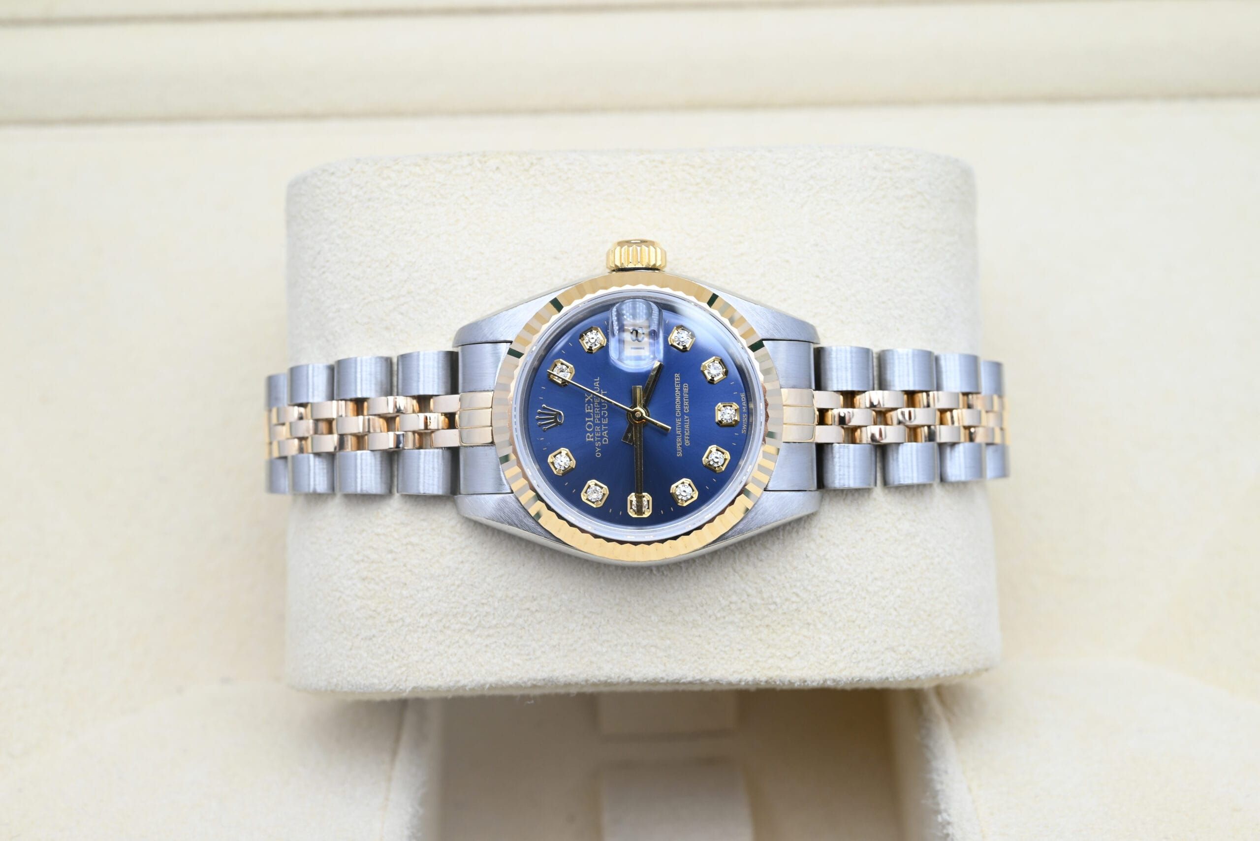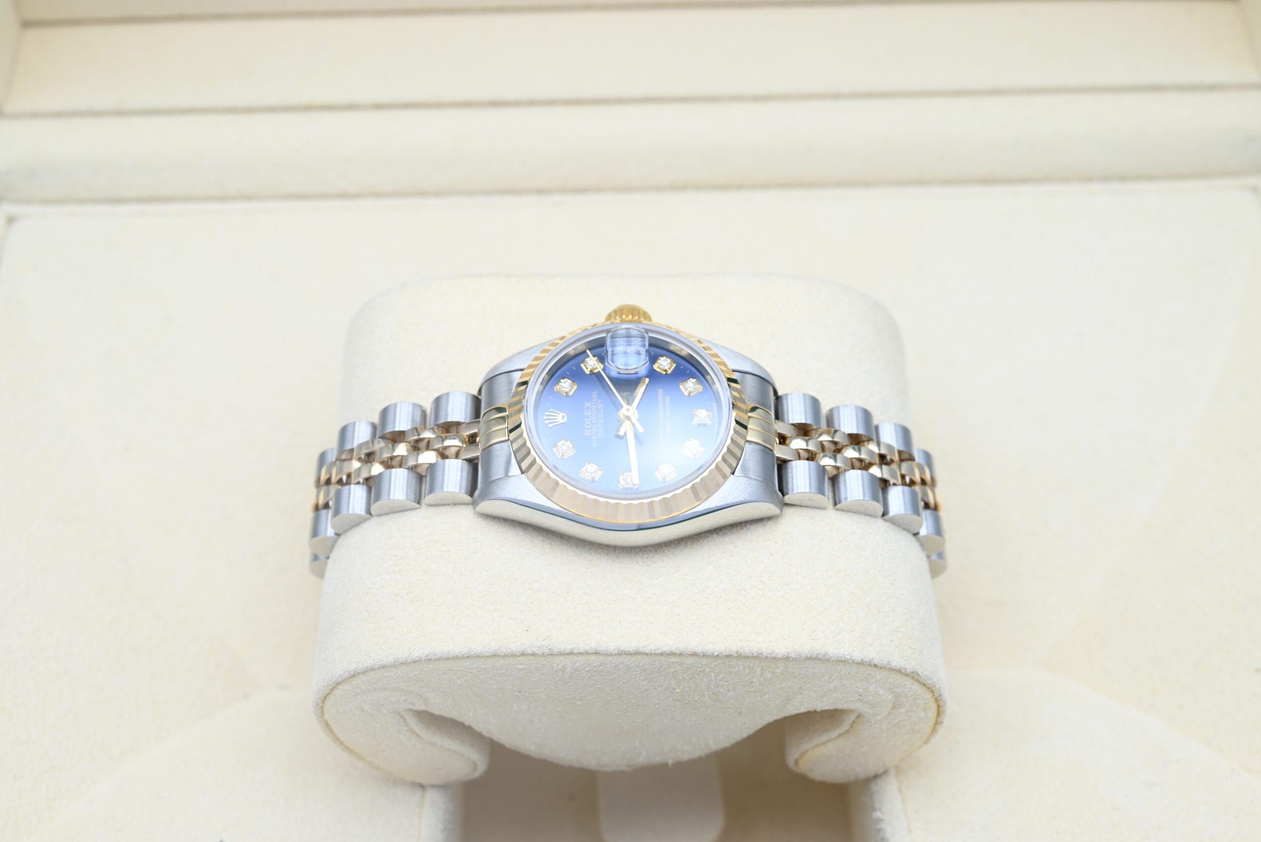 Rolex Lady-Datejust 69173 with the blue diamond dial from 1994 in excellent condition, including the original box and papers.All of our watches have been thoroughly checked by our own watchmaker and serviced when needed.