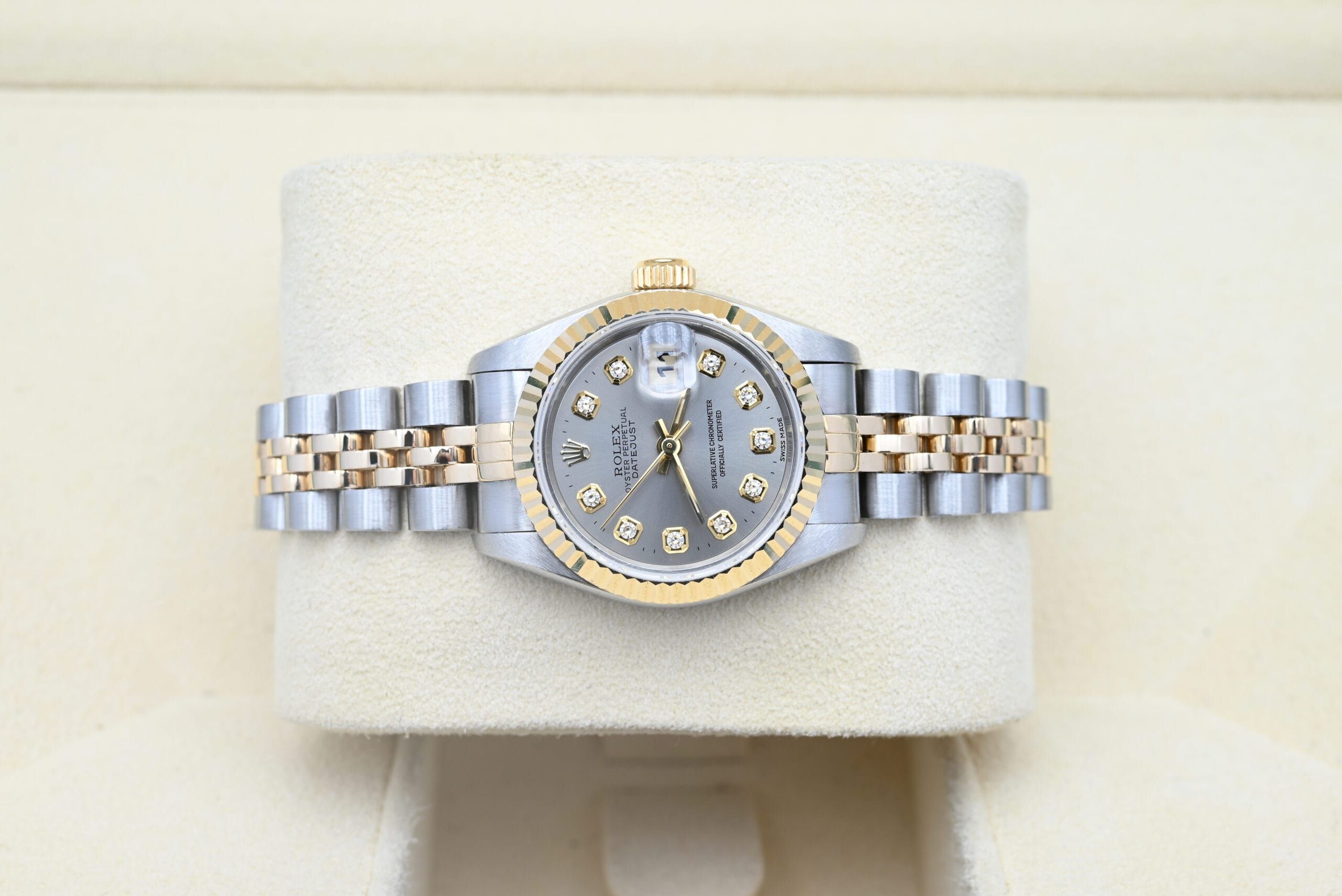 Rolex Lady-Datejust 69173 met de grijze diamanten wijzerplaat uit 1994 in uitstekende staat, inclusief de originele doos en papieren. Al onze horloges zijn grondig gecontroleerd door onze eigen horlogemaker en waar nodig onderhouden.