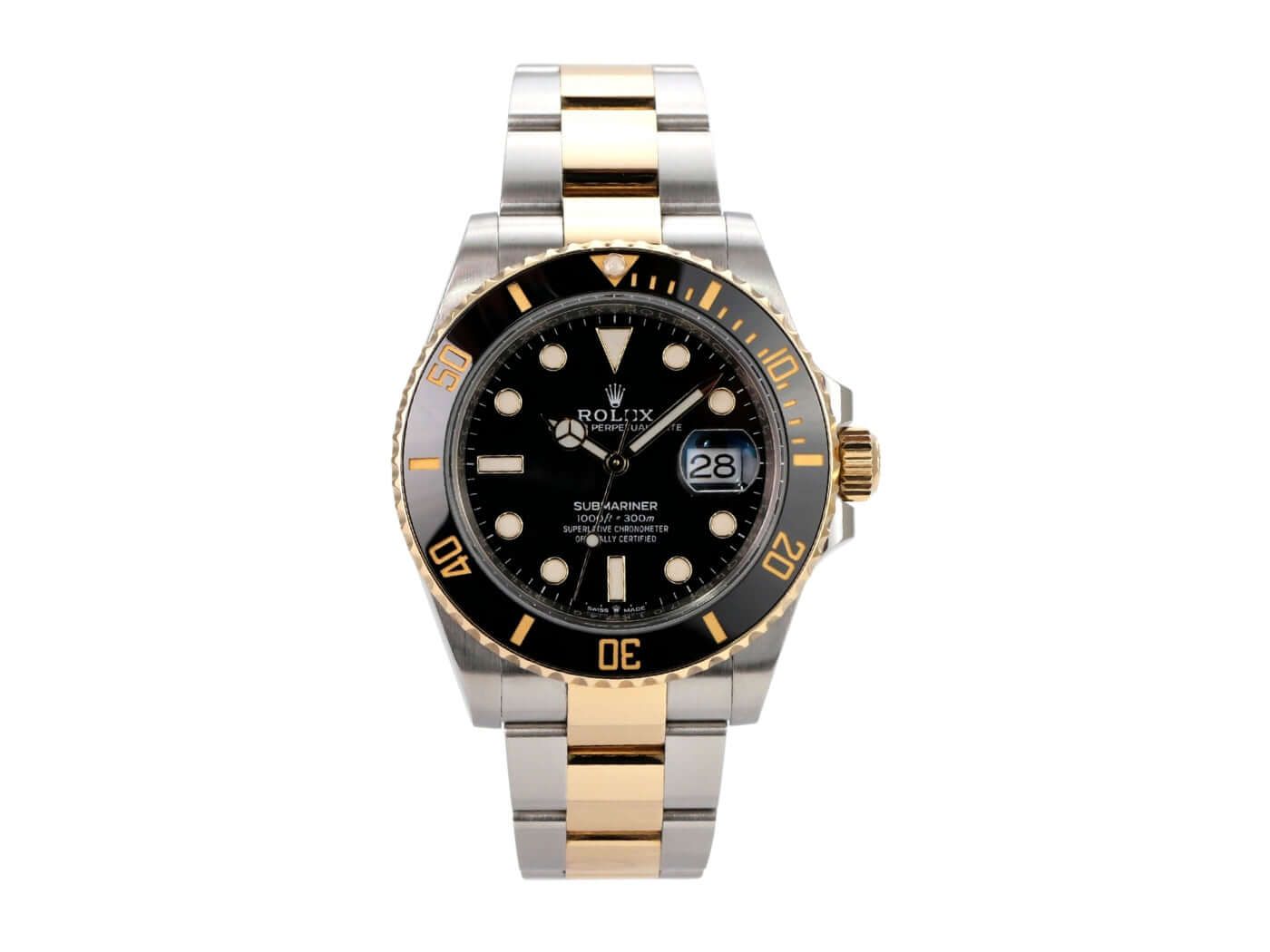 Rolex Submariner Date 41 Stainless Steel / Yellow Gold 126613LN from 2021Case made of polished and satin-finished stainless steel, case diameter 41 mm, case height 12.5 mm, 18-carat yellow gold fluted bezel with black ceramic insert, 60-minute scale and luminous dot, rotatable, Oyster stainless steel / 18-carat yellow gold bracelet polished and satin-finished with safety folding clasp, black dial with applied luminous indices and luminous dots, luminous hands, automatic movement, Rolex caliber 3235 with 31 jewels, 28,800 A/h, 70-hour power reserve, date display with quick adjustment and magnifier, chronometer, sapphire crystal, screw-down crown with crown guards, screw-down stainless steel case back, water-resistant up to 30 bar.