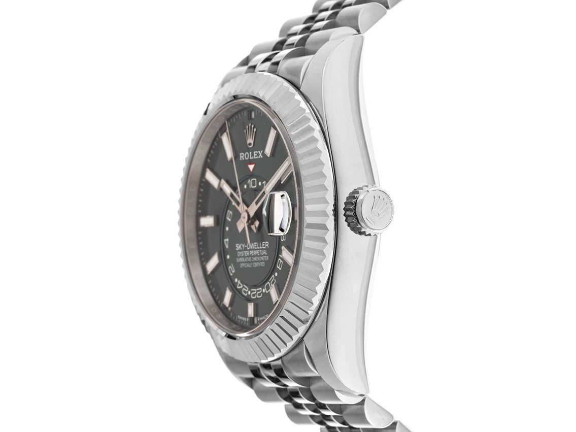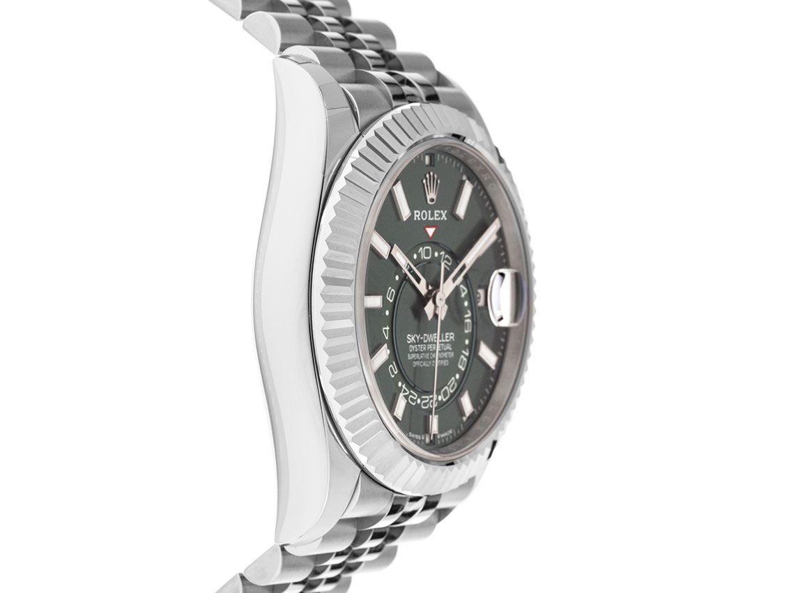 Rolex Sky-Dweller Stahl 18kt Weißgold Automatik Armband JubiléGehäuse Edelstahl poliert und satiniert, Gehäusedurchmesser ohne Krone 42mm, Gehäusehöhe 14,1mm. Lünette 18kt Weißgold poliert, geriffelt und beidseitig drehbar zur Steuerung der Funktionen. Armband Jubilé Edelstahl poliert und satiniert, Rolex Faltschließe mit Hersteller-Logo. Zifferblatt mintgrün mit aufgesetzten weißgoldenen Leuchtindexen und weißgoldenen Leuchtzeigern. Uhrwerk Automatik, Chronometer mit Zeugnis, Rolex Manufakturkaliber 9002 mit 40 Edelsteinen, Parachrom-Breguet-Spirale, Glucydur-Unruh, Gangreserve ca. 72 Stunden. Anzeige von Stunde, Minute und Sekunde über Zeiger aus der Mitte mit Sekundenstopp zur sekundengenauen Einstellung der Uhrzeit, Datumsanzeige mit Schnellverstellung unter Glaslupe bei 3 Uhr, zweite Zeitzone (zusätzliche 24 Stunden Anzeige) aus der Mitte, Monatsanzeige in zwölf Sichtfenstern am Außenrand des Zifferblatts. Saphirglas kratzfest. Krone verschraubbar mit Hersteller-Logo. Boden Edelstahl verschraubt. Gewicht der Uhr inklusive Armband 171g, Länge des Armbandes inklusive Gehäuse 180mm. Wasserdicht bis 10 ATM. Referenznummer: 336934 , ID: P2590436000326H-26500/17300, Artikelnummer: 10000084945. Original Rolex Box mit Umkarton und Garantie Papiere von Januar 2026, neue Rolex Garantie Karte ohne Ländercode sowie Beschreibung, Ledermäppchen, Rolex Chronometer-Siegel und Watchregister Auszug von März 2026, The Watch Register Zertifikat / ohne Eintrag (Internationale Datenbank für verlorene oder gestohlene Uhren), Full Set. Superschnäppchen, Kapitalanlage mit Wertsteigerungspotential, aus erster Hand, Tresoruhr. Ungetragen. Lieferzeit sofort.