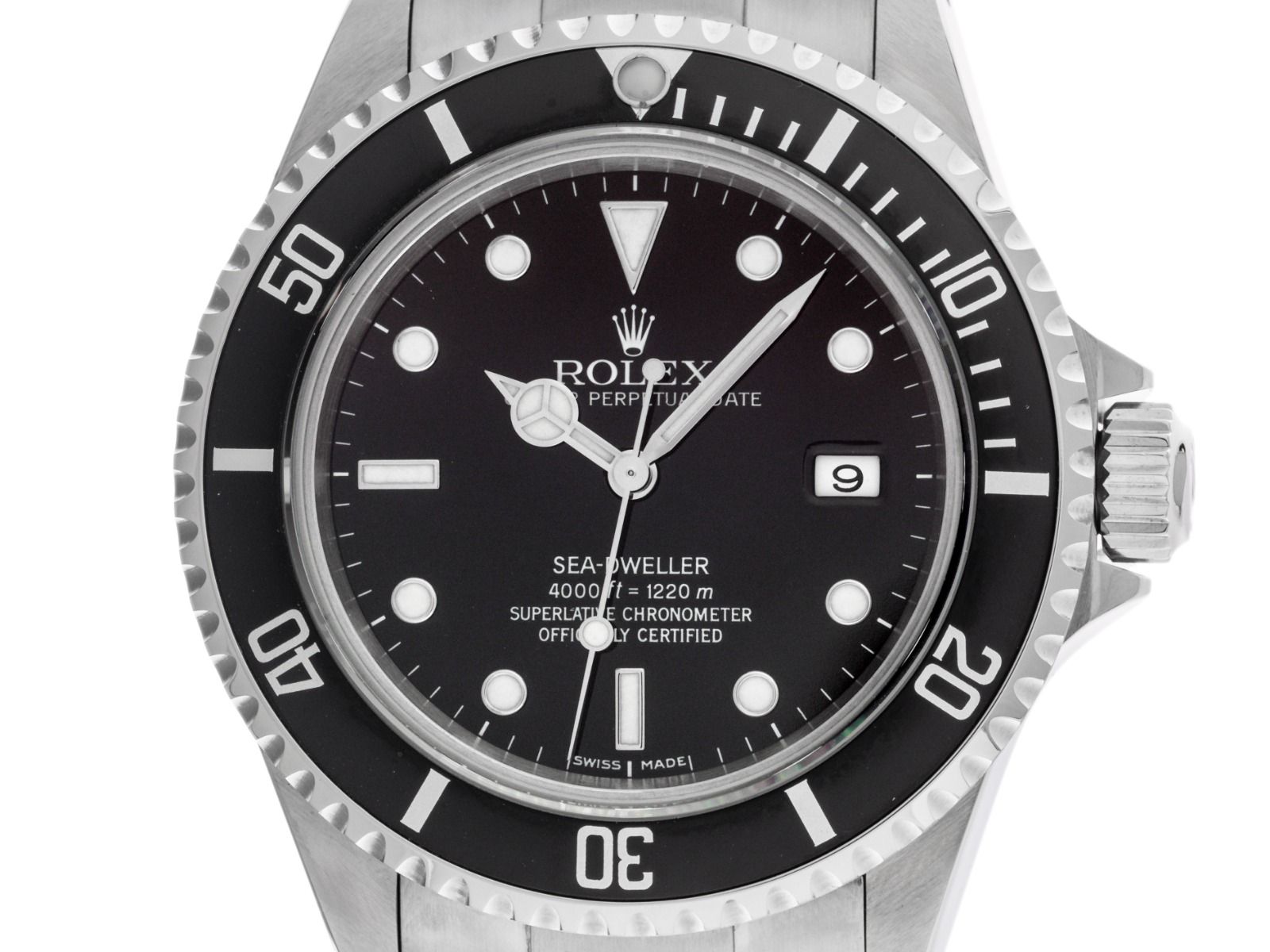 Rolex Sea-Dweller Stahl Automatik Armband OysterGehäuse Edelstahl poliert und satiniert, Gehäusedurchmesser ohne Krone 40mm, Gehäusehöhe 14,5mm. Lünette Edelstahl mit schwarzem Inlay und 60-Minuten-Skala, Flat 4, einseitig drehbar. Heliumventil bei 9 Uhr. Armband Oyster Edelstahl poliert und satiniert, Sicherheitsfaltschließe Edelstahl mit Hersteller-Logo. Zifferblatt schwarz mit aufgesetzten weißgoldenen Indexen und weißgoldenen Zeigern. Uhrwerk Automatik, Chronometer mit Zeugnis, Rolex Manufakturkaliber 3135 mit 31 Edelsteinen. Anzeige von Stunde, Minute und Sekunde über Zeiger aus der Mitte mit Sekundenstopp zur sekundengenauen Einstellung der Uhrzeit, Datumsanzeige mit Schnellverstellung bei 3 Uhr. Saphirglas kratzfest. Krone verschraubbar mit Flankenschutz und Hersteller-Logo. Boden Edelstahl verschraubt und graviert. Gewicht der Uhr inklusive Armband 142g, Länge des Armbandes inklusive Gehäuse 160mm. Referenznummer: 16600, Gehäusenummer: K122XXX, ID: KA1804182740226H-13200, Artikelnummer: 10000084914. Mit Gangkontrolle und kompletter äußerlicher Aufarbeitung von März 2026. Original Rolex Box mit Umkarton und Garantie Papiere von August 2001, LC 888 / Hong Kong sowie Beschreibung, Ledermäppchen, Rolex Chronometer-Siegel und Watchregister Auszug von März 2026, The Watch Register Zertifikat / ohne Eintrag (Internationale Datenbank für verlorene oder gestohlene Uhren), Full Set. Superschnäppchen, Kapitalanlage mit Wertsteigerungspotential, sehr seltenes Sammlerstück. Sehr guter Zustand. Lieferzeit sofort.