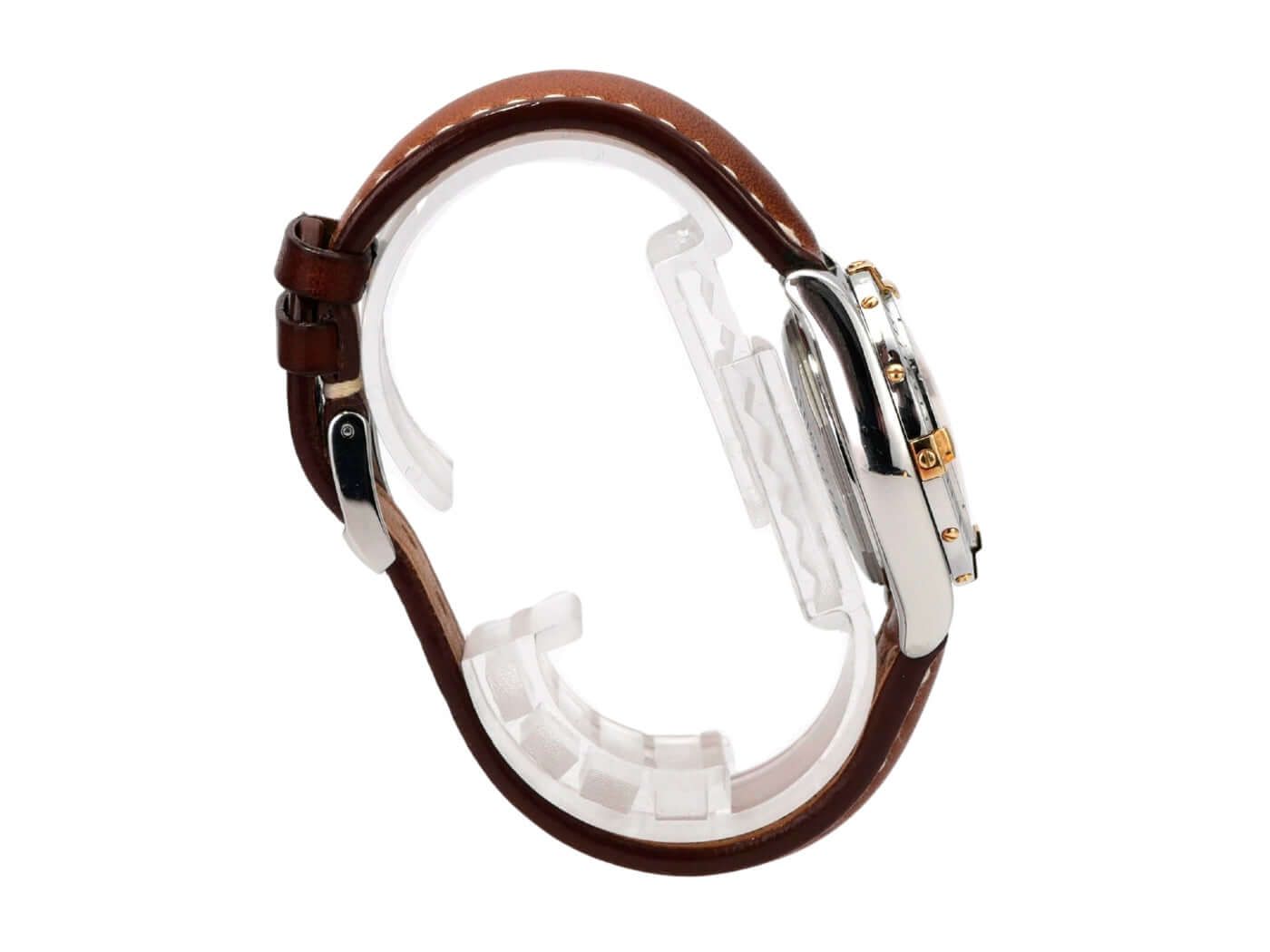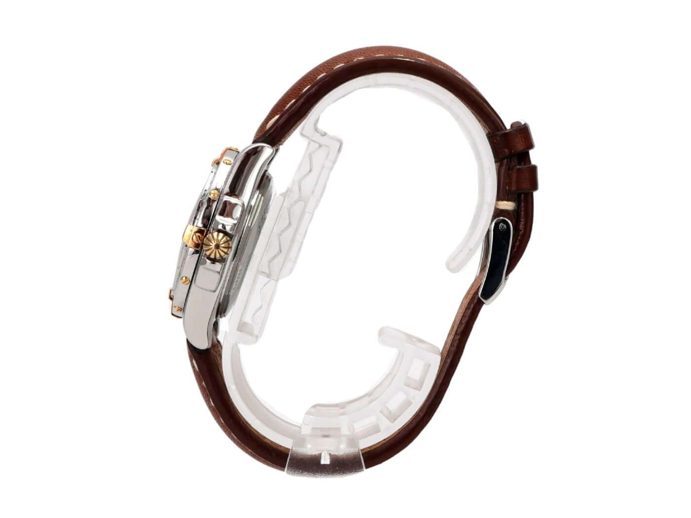 Breitling Cockpit Lady Ref. B71356-041 from 2004 Polished stainless steel case, case diameter 31.8 mm, case height 12.7 mm, polished stainless steel / yellow gold bezel, brown leather strap with pin buckle, silver-colored dial with applied Roman numerals, luminous hands, quartz, chronometer, date display, sapphire crystal, screwed and engraved stainless steel case back, water-resistant up to 10 bar. Pre-owned watch, very good condition, complete with box and papers, German delivery from 2004.