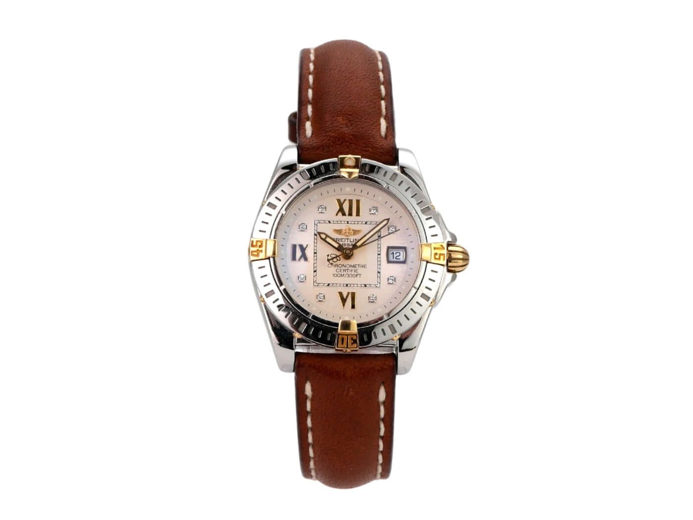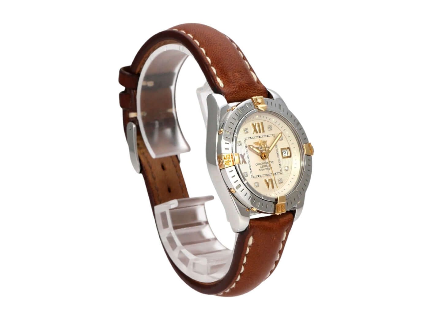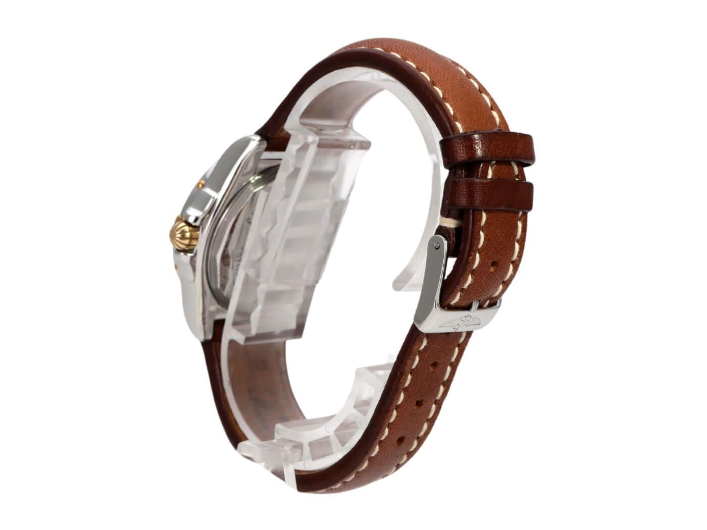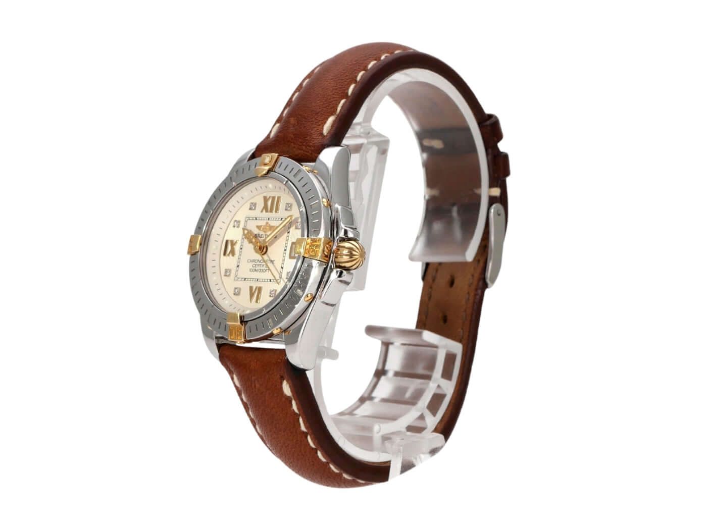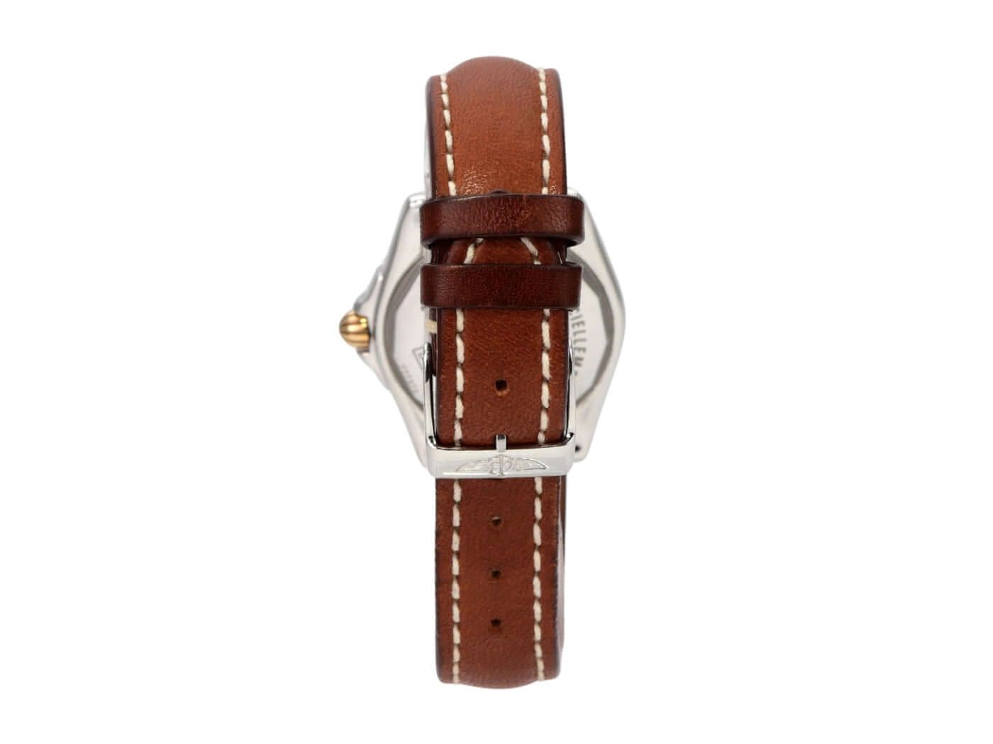 Breitling Cockpit Lady Ref. B71356-041 uit 2004 Gepolijst roestvrijstalen kast, kastdiameter 31,8 mm, kasthoogte 12,7 mm, gepolijste roestvrijstalen / geelgouden bezel, bruine leren band met pin-buckle, zilverkleurige wijzerplaat met aangebrachte Romeinse cijfers, luminescente wijzers, quartz, chronometer, datumaanduiding, saffierglas, geschroefd en gegraveerd roestvrijstalen kastdeksel, waterbestendig tot 10 bar. Tweedehands horloge, zeer goede staat, compleet met doos en papieren, Duitse levering uit 2004.