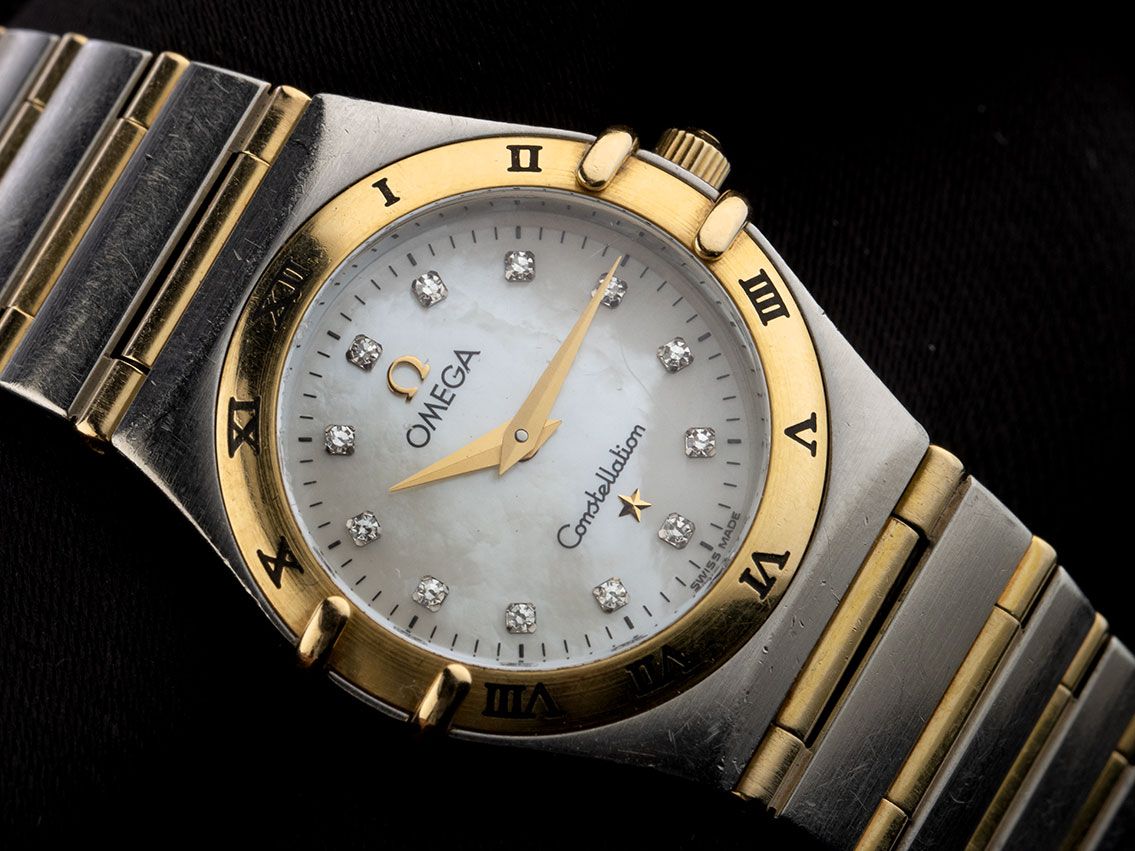 Omega Constellation Lady Stahl Gelbgold Perlmutt Diamanten Quarz Armband Stahl GelbgoldGehäuse Edelstahl poliert, Gehäusedurchmesser ohne Krone 25mm, Gehäusehöhe 7,5mm. Lünette Gelbgold satiniert mit schwarzen römischen Ziffern. Armband Edelstahl / Gelbgold poliert und satiniert, Sicherheitsfaltschließe Edelstahl mit Hersteller-Logo. Zifferblatt Perlmutt hell mit aufgesetzten gelbgoldenen Diamantindexen und gelbgoldenen Zeigern. Uhrwerk quarzgesteuert, Kaliber Omega 1456 mit 6 Edelsteinen. Anzeige von Stunde und Minute über Zeiger aus der Mitte. Saphirglas kratzfest und gewölbt. Krone geriffelt mit Hersteller-Logo. Boden Edelstahl graviert. Gewicht der Uhr inklusive Armband 58g, Länge des Armbandes inklusive Gehäuse 175mm. Referenznummer: 795.1202, Gehäusenummer: 59857XXX, Baujahr: 1998, ID: KH180019000226HW-4100, Artikelnummer: 10000084875. Original Omega Box mit Umkarton sowie Beschreibung und Watchregister Auszug von März 2026, The Watch Register Zertifikat / ohne Eintrag (Internationale Datenbank für verlorene oder gestohlene Uhren). Original unpoliert, kann auf Wunsch kostenlos aufgearbeitet werden. Lieferzeit sofort.