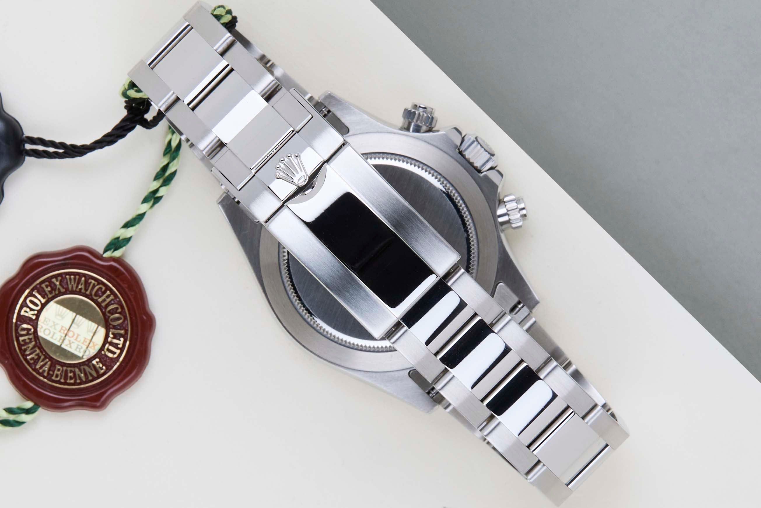 Full Set | Rare APH Chromalight Dial The reference 116520 is the first generation of the Daytona with an in-house movement by Rolex, Calibre 4130. The new calibre was the result of five years of innovation, refinement, and technical improvement resulting in a better and more reliable calibre.This highly-sought after Rolex Daytona has been sold for the first time in June 2014.This collectable Rolex Daytona is fitted with a rare 'APH - Chromalight' Dial.This rare 'APH' Dial can be recognised by the gap in the spacing of the letters that say 'COSMOGR' and 'APH'. This 'error' dial, which is a rarity on its own for the brand of perfection, is what gives this dial its nickname and makes it extremely desirable for watchcollectors.The Chromalight can be recognised by the lume, which lights up in blue. This is contrary to the earlier Rolex Daytona versions, which were delivered with Superluminova applied on the dial, which lights up in a green colour.This Rolex Daytona 116520 is in Mint condition and comes with the original Rolex Warranty Card and original box. Furthermore, the watch has been serviced by our watchmaker, and therefore it comes with one year of Steiner warranty.