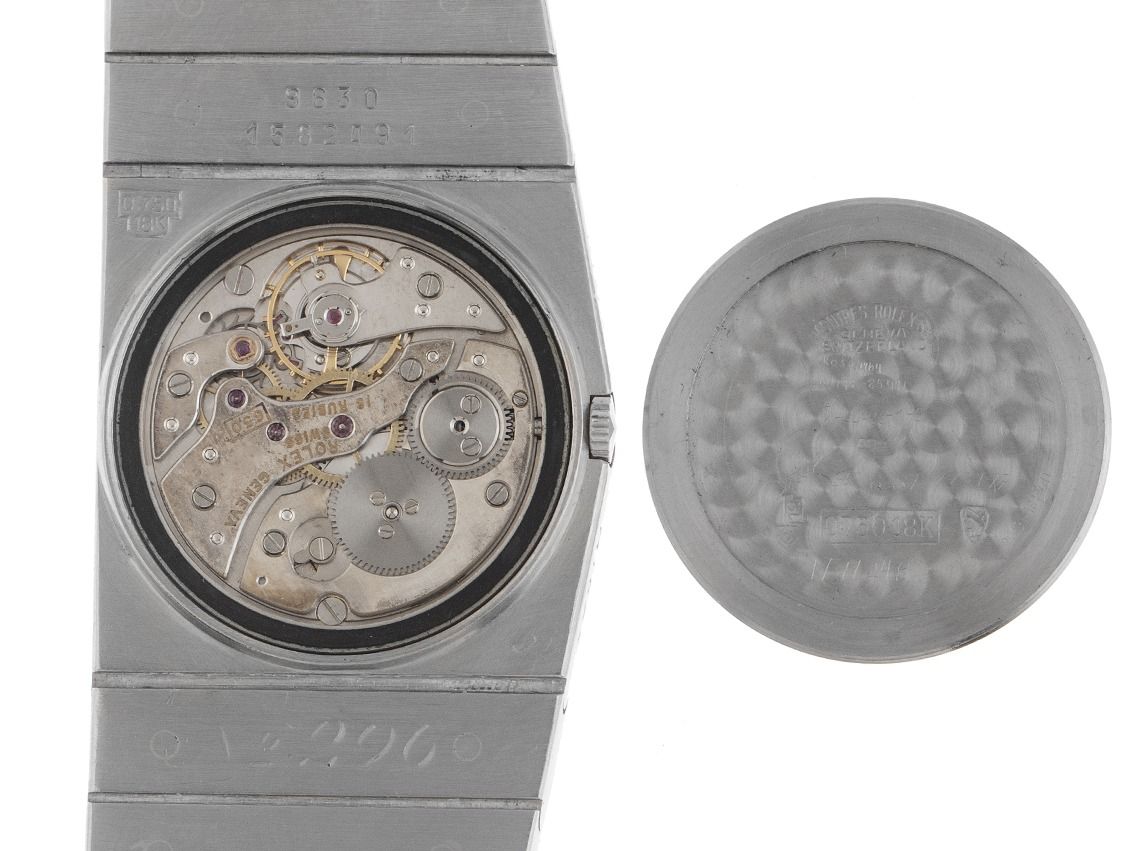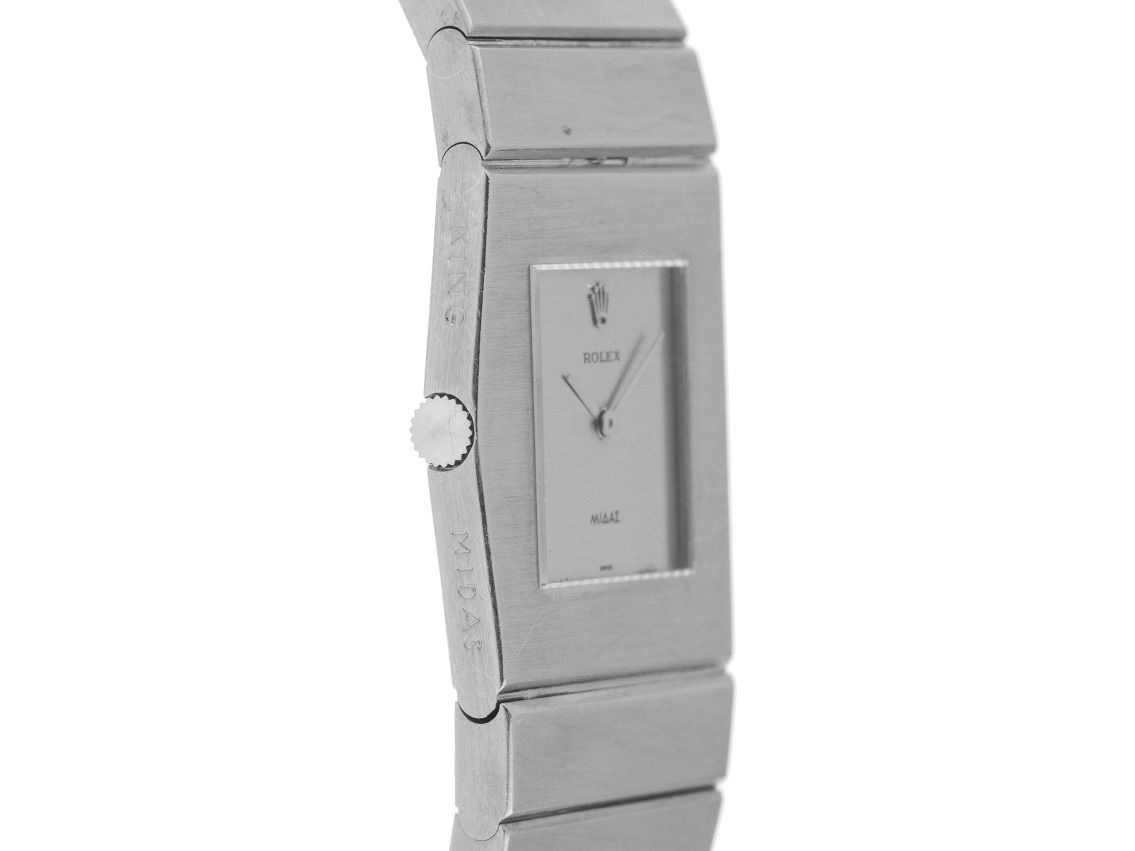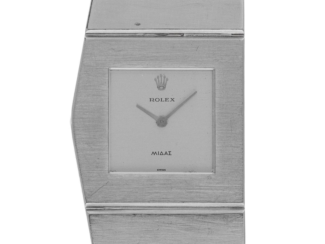 Behuizing 18kt Witte goud gematteerd, met gravure King Midas op de linker behuizingsflank, behuizingsafmetingen zonder kroon (L x B x H) 27 x 27 x 4,6mm. Armband 18kt Witte goud gematteerd, zonder spanningsverlies, Rolex dubbele vouwsluiting 18kt Witte goud met fabrikantlogo. Wijzerplaat zilverkleurig met gepolijste wijzers. Uurwerk Handaufzug, Rolex manufakturkaliber 650 met 18 edelstenen en 5 aanpassingen. Weergave van uur en minuut via wijzers vanuit het midden. Saffierglas krasbestendig. Kroon links in de behuizing verzonken. Achterkant 18kt Witte goud geschroefd. Gewicht van het horloge inclusief armband 189g, lengte van de armband inclusief behuizing 185mm. Referentienummer: 9630, behuizingsnummer: 1582XXX, bouwjaar: 1967, ID: KH18131160000326H-105000, artikelnummer: 10000085043. Met nieuwe uurwerk revisie en reiniging van maart 2026. Originele Rolex doos zwart hoogglans met omdoos en beschrijving, lederen etui, vertaalboekje, poetsdoek en datum evenals uittreksel van het Watchregister van maart 2026, The Watch Register certificaat / zonder vermelding (Internationale database voor verloren of gestolen horloges). Kapitaalinvestering met waardestijgingspotentieel, extreem zeldzaam verzamelobject. Originele staat. Leveringstijd direct.