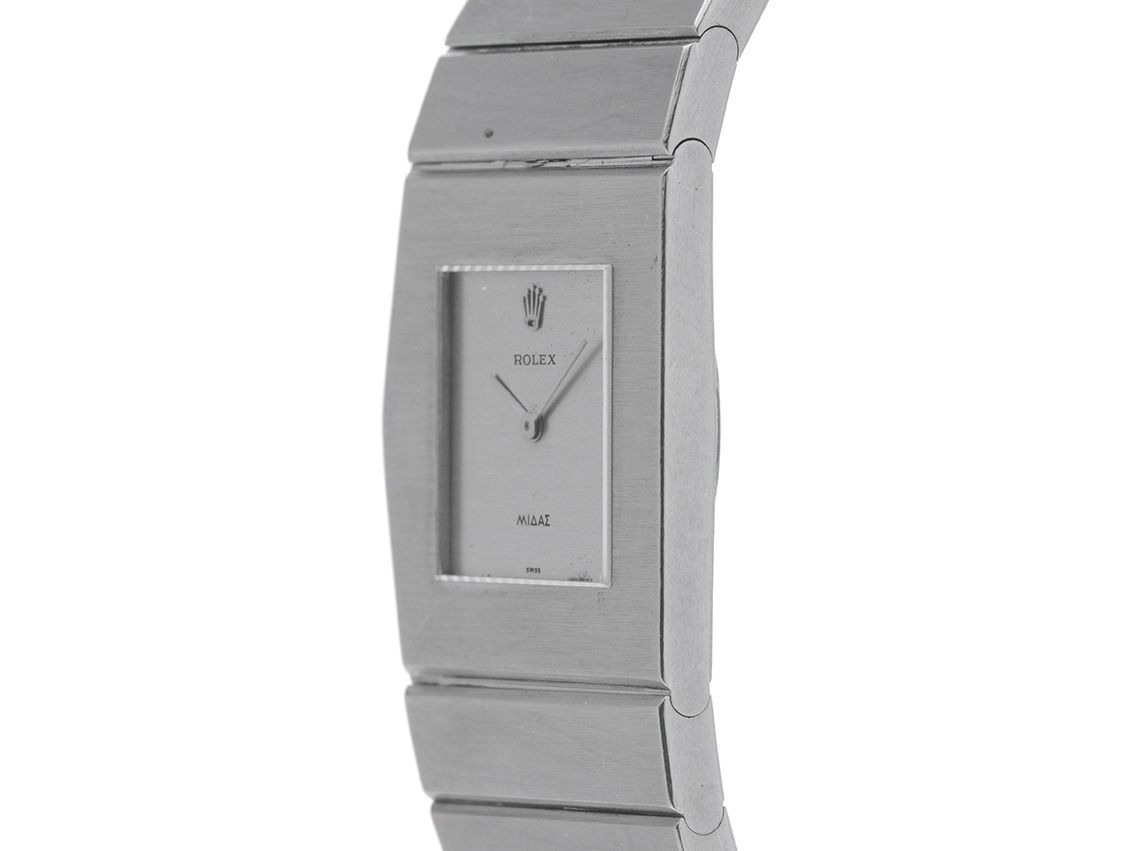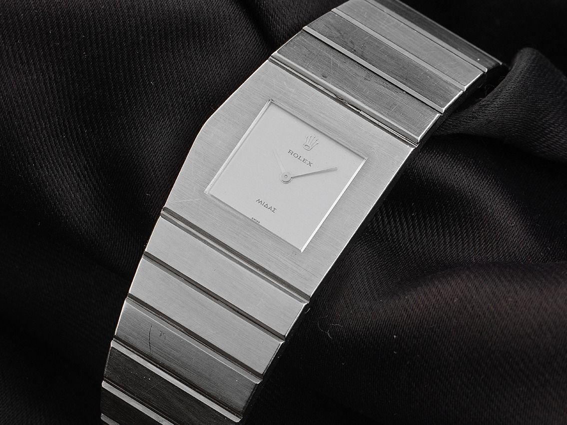 Rolex King Midas Krone links Weißgold 189g Handaufzug Armband 18kt WeißgoldZwischen 1962 und 1972 stelle Rolex 144 King Midas aus Weißgold her und es ist die Rolex, die man verschenkt: Elvis Presley für ausverkaufte Show; John Wayne für einen Blockbuster; Sir Jackie Stewart für die F1-Meisterschaft 1969; Rene-Paul Jeanneret für seine Rolle als Hans Wilsdorfers rechte Hand; und viele mehr. Jede einzelne Rolex Midas erzählt eine eigene, tiefgründige Geschichte.