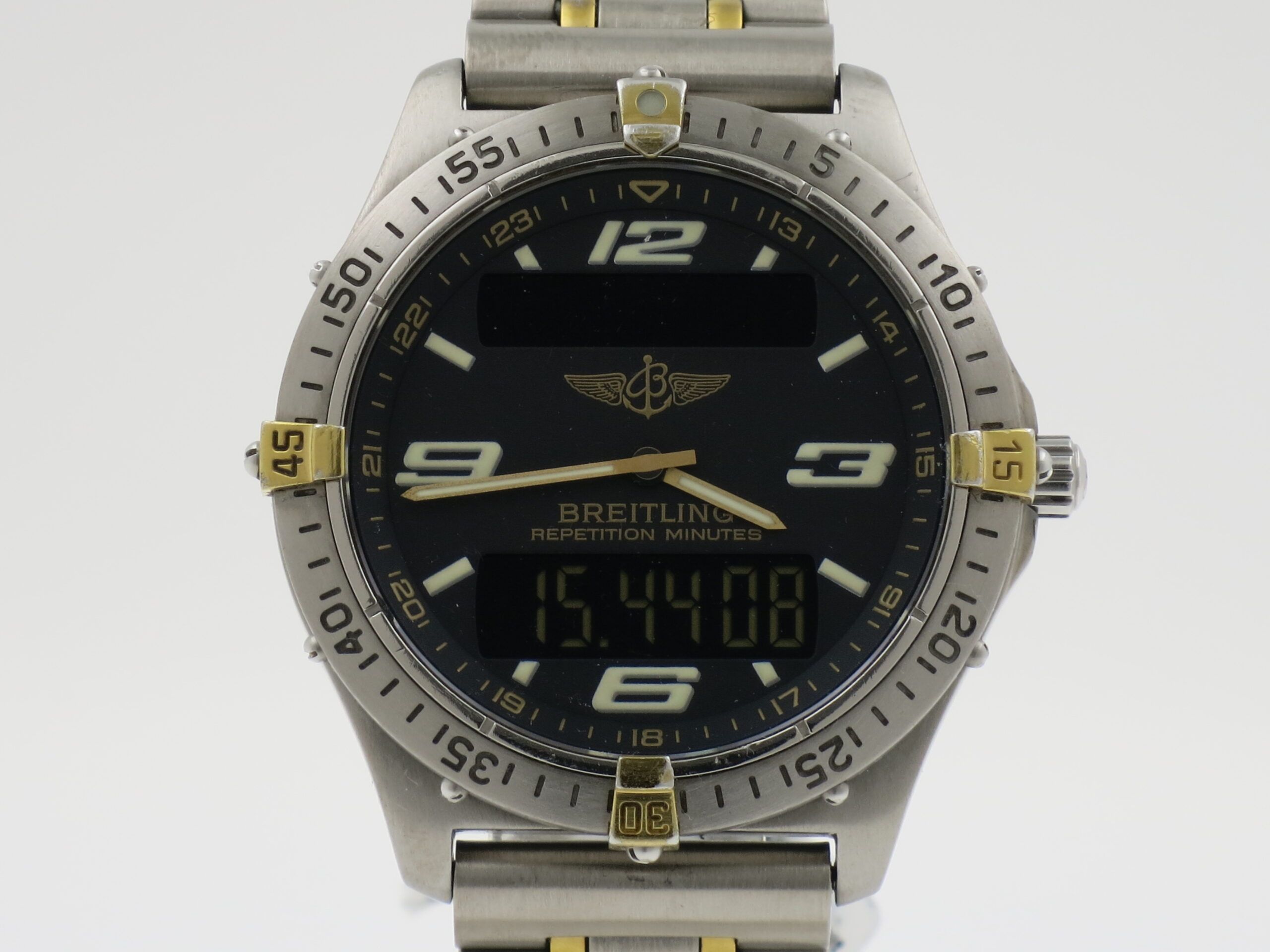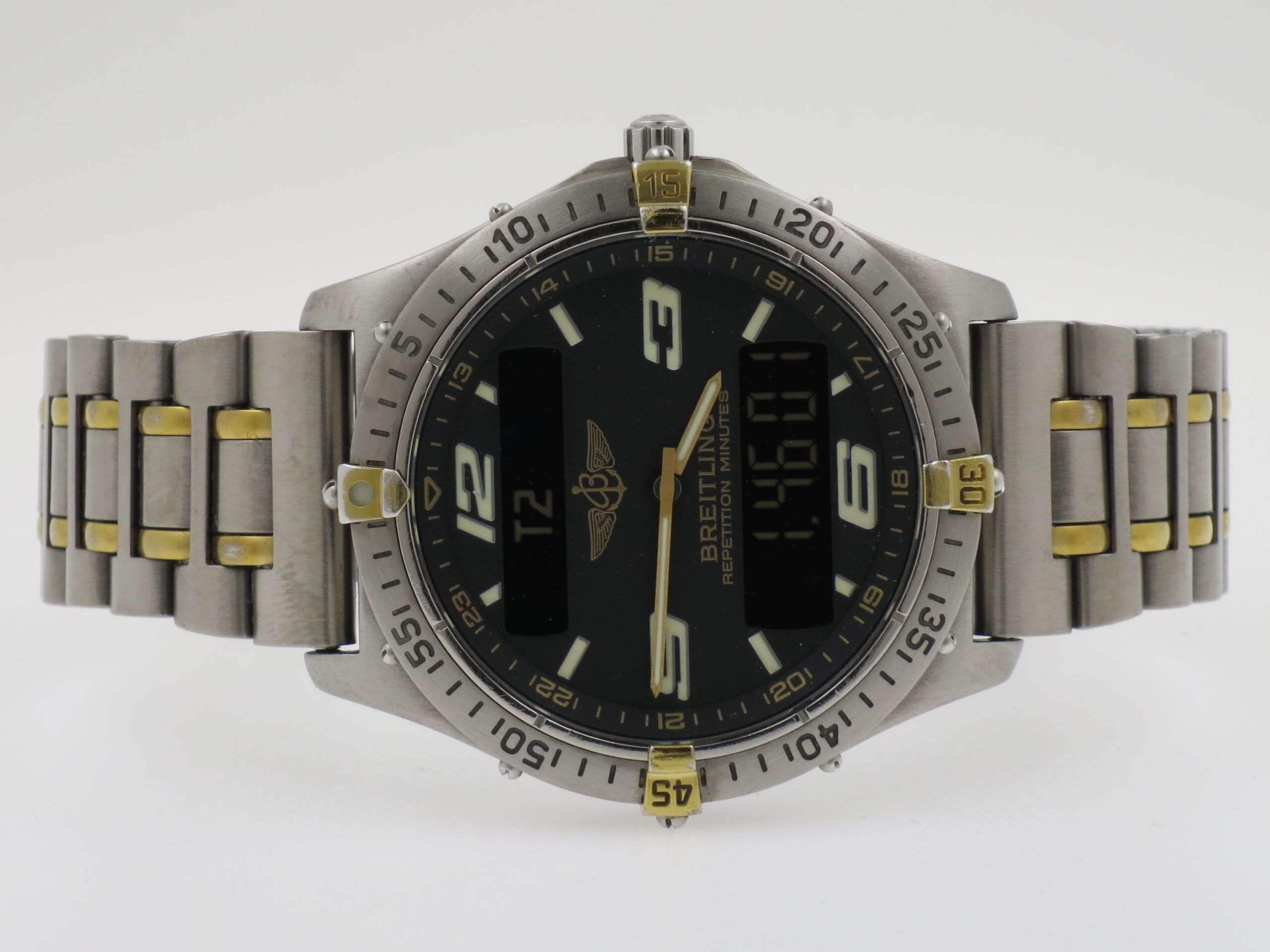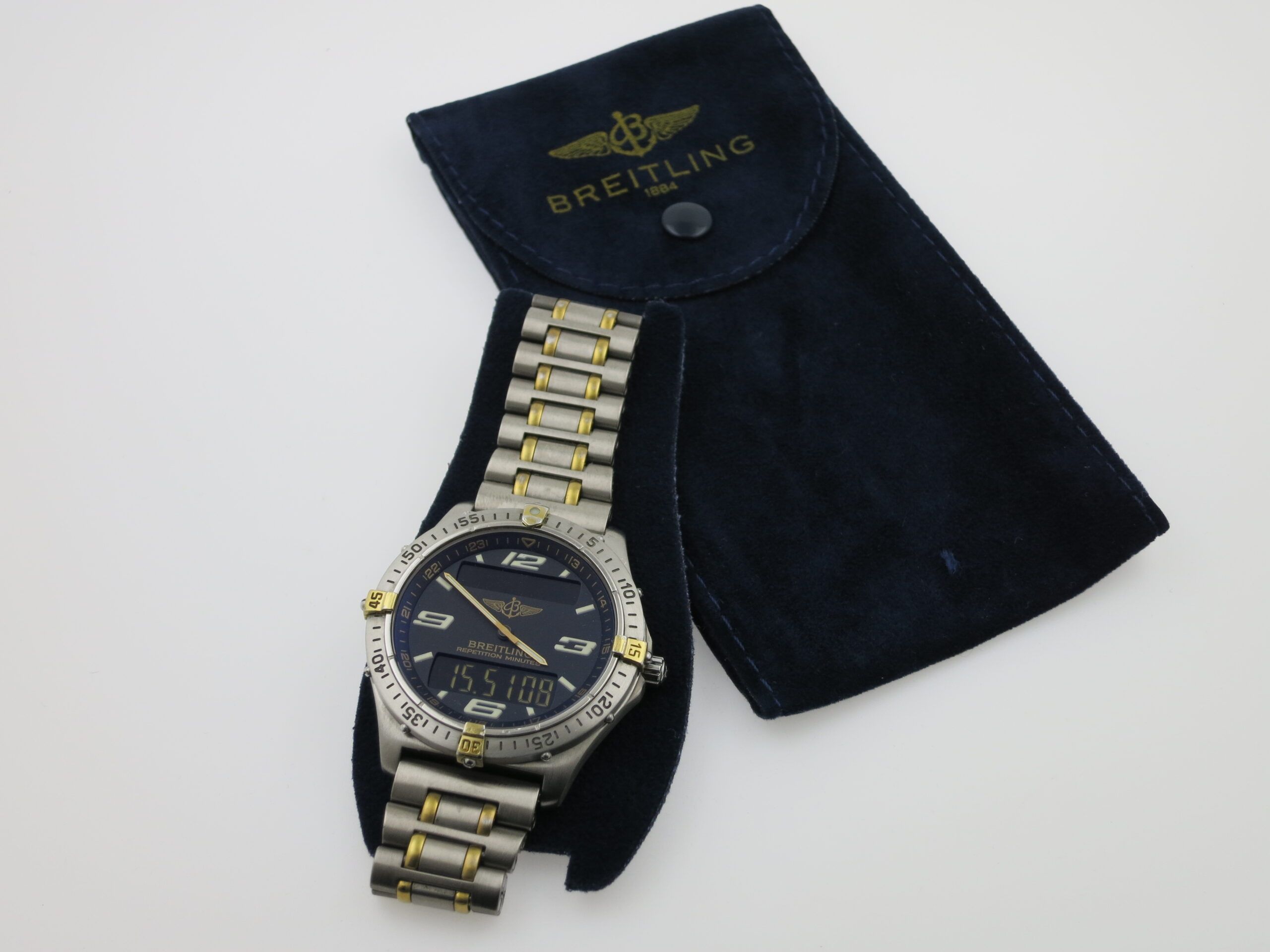 Breitling Aerospace Repetion" 40mm. bicolor titanium and titanium bracelet. Beautiful grey dial in a 40 mm titanium case with titanium bezel. Shipping immediately upon receipt of payment. Our photos are NOT edited! What you see is what you get. Shipped registered and insured with Fedex Priority.