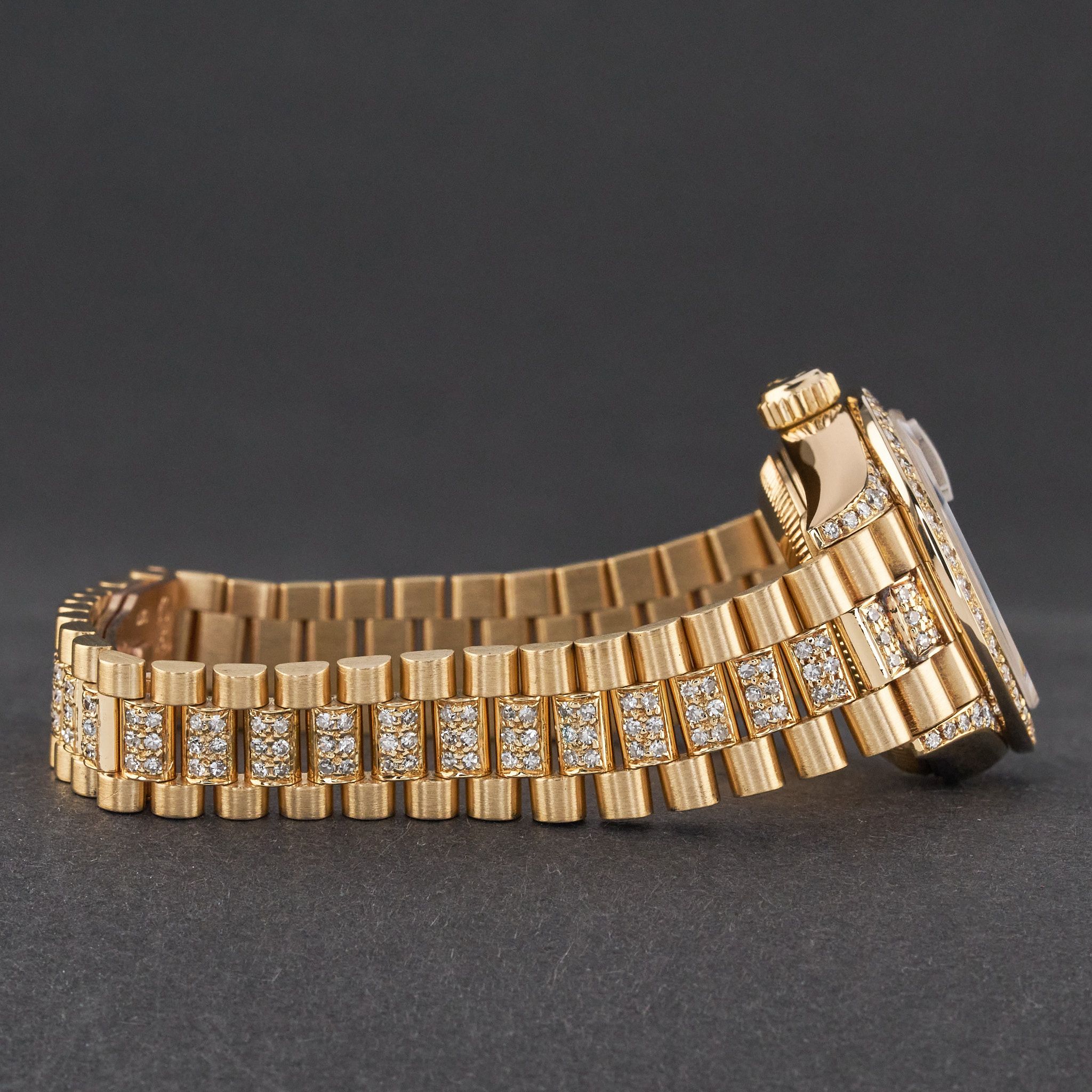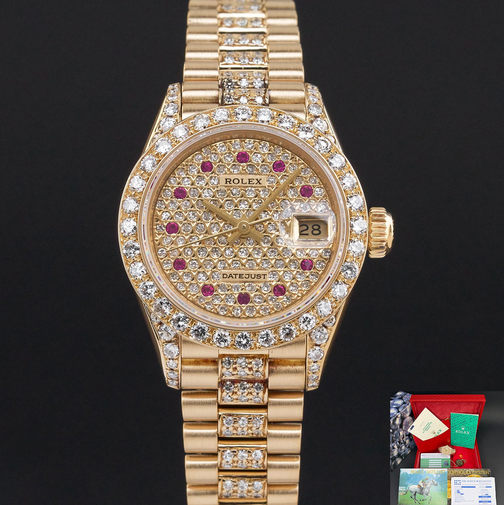 This Rolex Lady-Datejust 69178 features a Pave ruby diamond dial and is crafted from 18K yellow gold, with a production year of 1995. Dial, bezel, case and bracelet are original, but have aftermarket diamond setting.Case No: W27XXXX