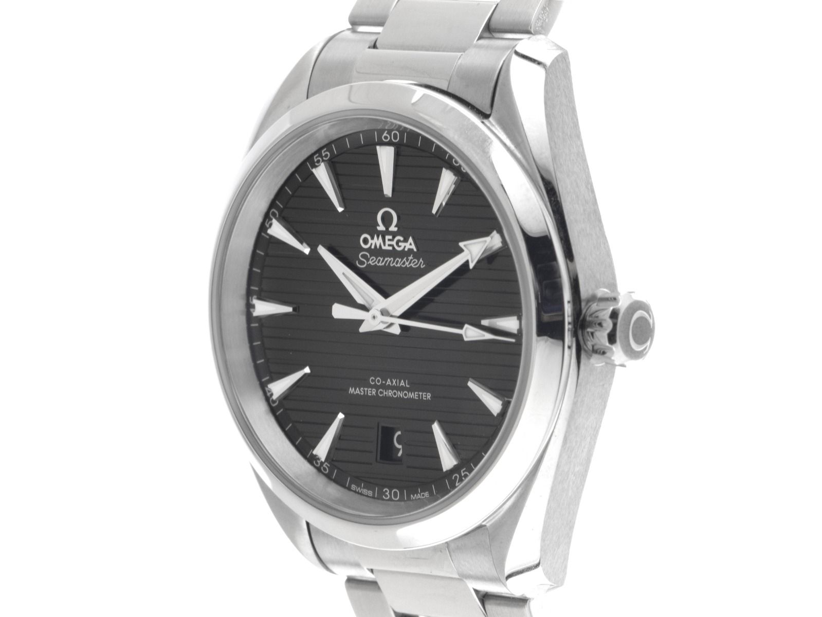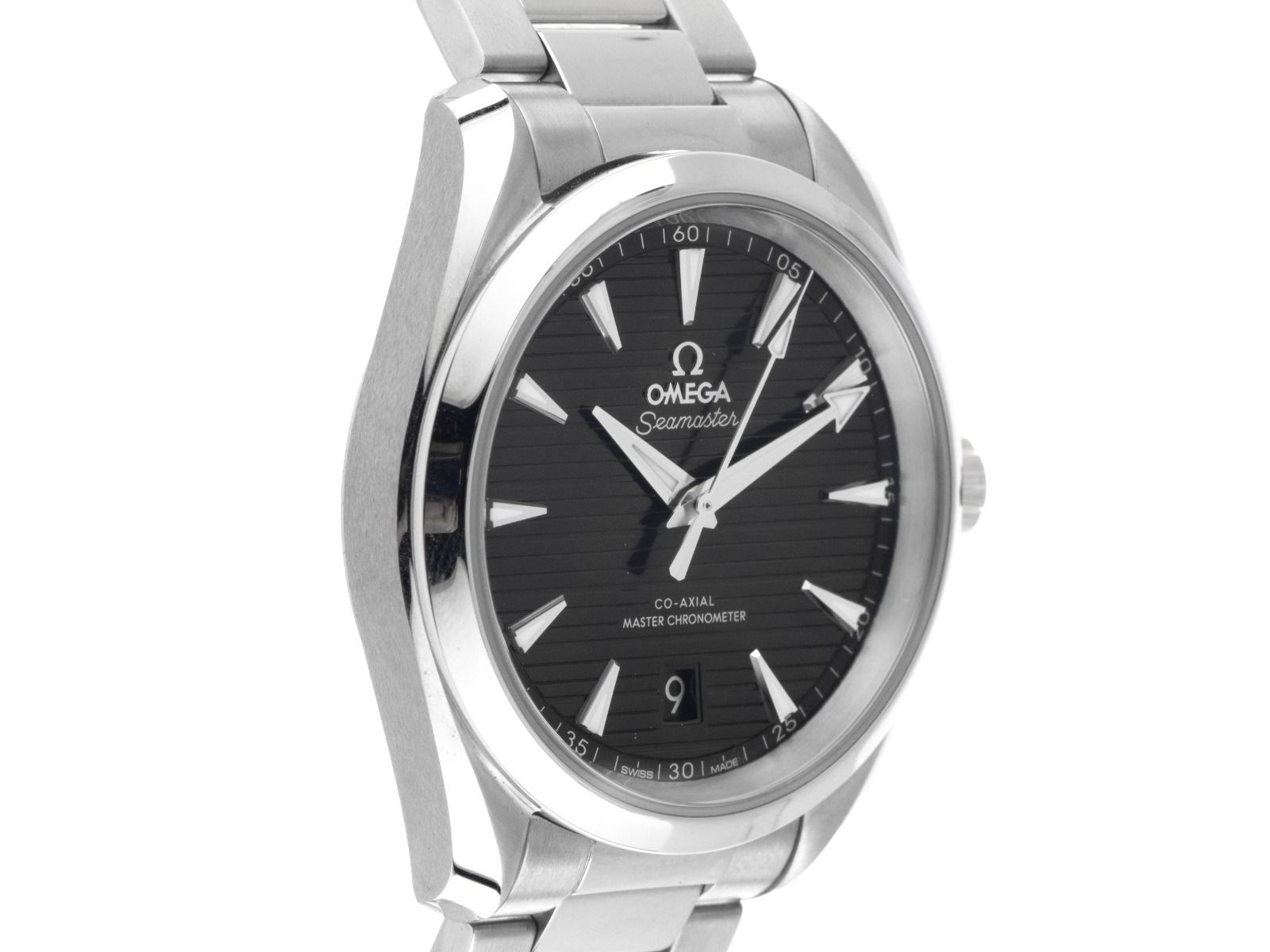 Omega Seamaster Aqua Terra 150M Co-Axial Master Chronometer Stahl Automatik Armband StahlGehäuse Edelstahl poliert und satiniert, Gehäusedurchmesser ohne Krone 38mm, Gehäusehöhe 12,5mm. Lünette Edelstahl glatt und poliert. Armband Edelstahl poliert und satiniert, verdeckte Doppelsicherheitsfaltschließe Edelstahl mit Hersteller-Logo. Zifferblatt schwarz mit Streifen Dekor, aufgesetzten Edelstahl Leuchtindexen und Edelstahl Leuchtzeigern. Uhrwerk Automatik, Master Chronometer mit Zeugnis, Omega Manufakturkaliber 8800 mit 35 Edelsteinen, Co-Axial Hemmung, Freie Unruh-Spiralfeder, 2 Federhäuser, Gangreserve ca. 55 Stunden. Anzeige von Stunde, Minute und Sekunde über Zeiger aus der Mitte mit Sekundenstopp zur sekundengenauen Einstellung der Uhrzeit, Datumsanzeige mit Schnellverstellung bei 6 Uhr. Saphirglas kratzfest, gewölbt und beidseitig entspiegelt. Krone verschraubbar mit Hersteller-Logo. Boden Edelstahl verschraubt und graviert mit Saphirglas Sichtfenster. Gewicht der Uhr inklusive Armband 131g, Länge des Armbandes inklusive Gehäuse 190mm. Wasserdicht bis 15 ATM. Referenznummer: 220.10.38.20.01.001, ID: ST116096620226H-6800, Artikelnummer: 10000084701. Original Omega Box mit Umkarton und Garantie Papiere von Januar 2026 sowie Beschreibung, Full Set. Ungetragen. Lieferzeit sofort.