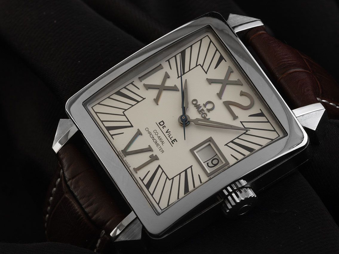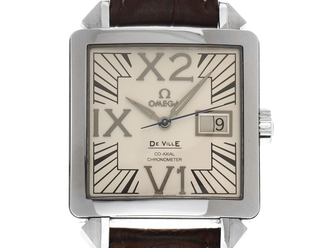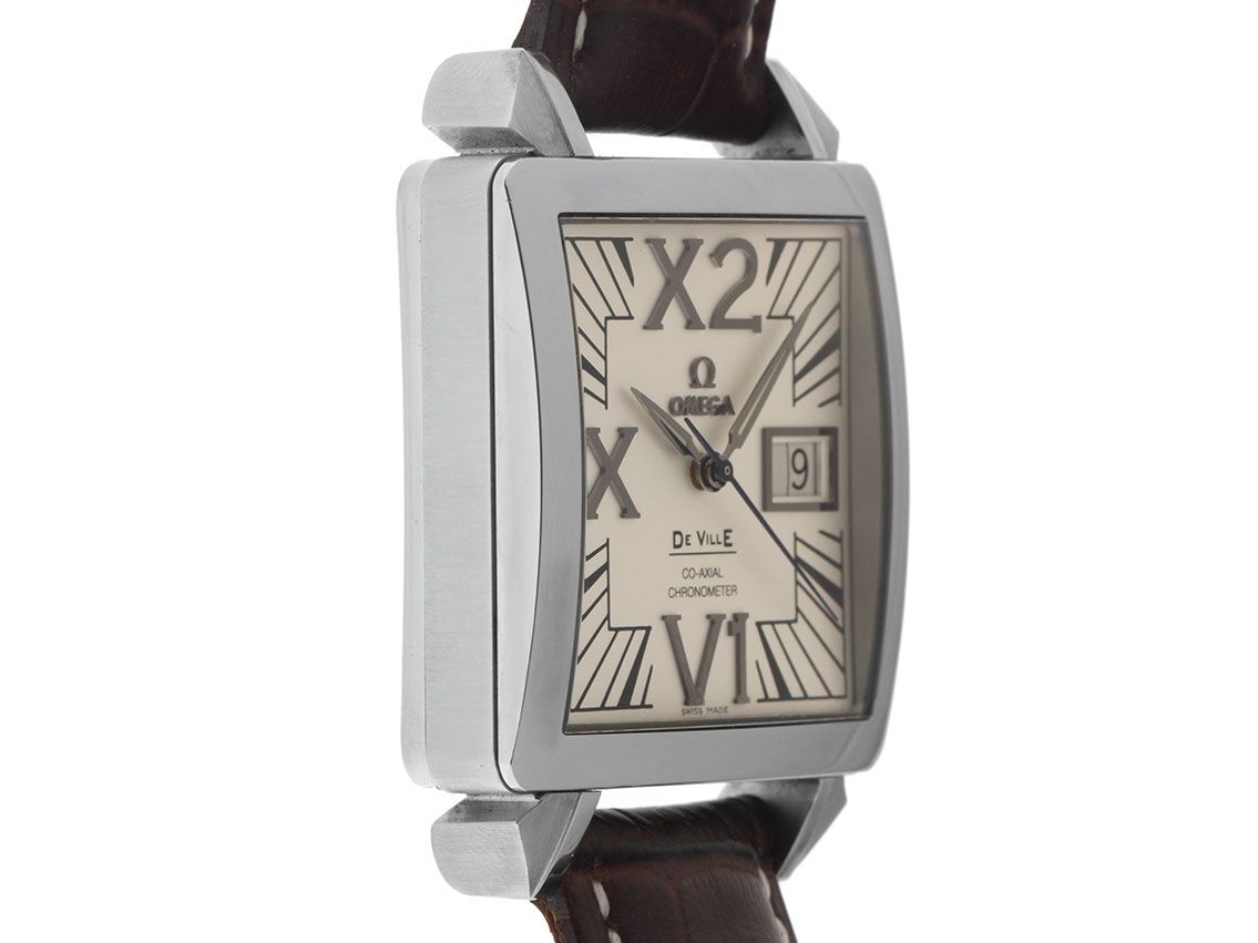 Omega De Ville Stahl Automatik Armband LederGehäuse Edelstahl poliert und satiniert, rechteckig, Gehäusemaße ohne Krone (L x B x H) 35 x 35 x 12,5mm. Lünette Edelstahl glatt und poliert. Armband Leder braun mit Ziernaht, Anstoßbreite 20mm, Stiftschließe Edelstahl. Zifferblatt weiß mit aufgesetzten römische Edelstahl Ziffern, schwarzen Indexen und Edelstahl Zeigern sowie gebläuter Sekundenzeiger. Uhrwerk Automatik, Kaliber Omega. Anzeige von Stunden, Minuten und Sekunde über Zeiger aus der Mitte mit Sekundenstopp zur sekundengenauen Einstellung der Uhrzeit, Datumsanzeige mit Schnellverstellung bei 3 Uhr - Saphirglas kratzfest. Krone geriffelt mit Hersteller-Logo. Boden Edelstahl 4-fach verschraubt und graviert. Gewicht der Uhr inklusive Armband 40g, Referenznummer: 4800.31.01, Gehäusenummer: 80042XXX, ID: P268234000326H-5900, Artikelnummer: 10000085103. Mit Gangkontrolle und kompletter äußerlicher Aufarbeitung von Februar 2026. Original Omega Box mit Umkarton und Garantie Papiere von Februar 2001 sowie Beschreibung, Ledermäppchen und Watchregister Auszug von Februar 2026, The Watch Register Zertifikat / ohne Eintrag (Internationale Datenbank für verlorene oder gestohlene Uhren), Full Set. Superschnäppchen, sehr seltenes Sammlerstück, aus erster Hand. Sehr guter Zustand. Lieferzeit sofort.