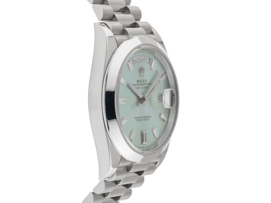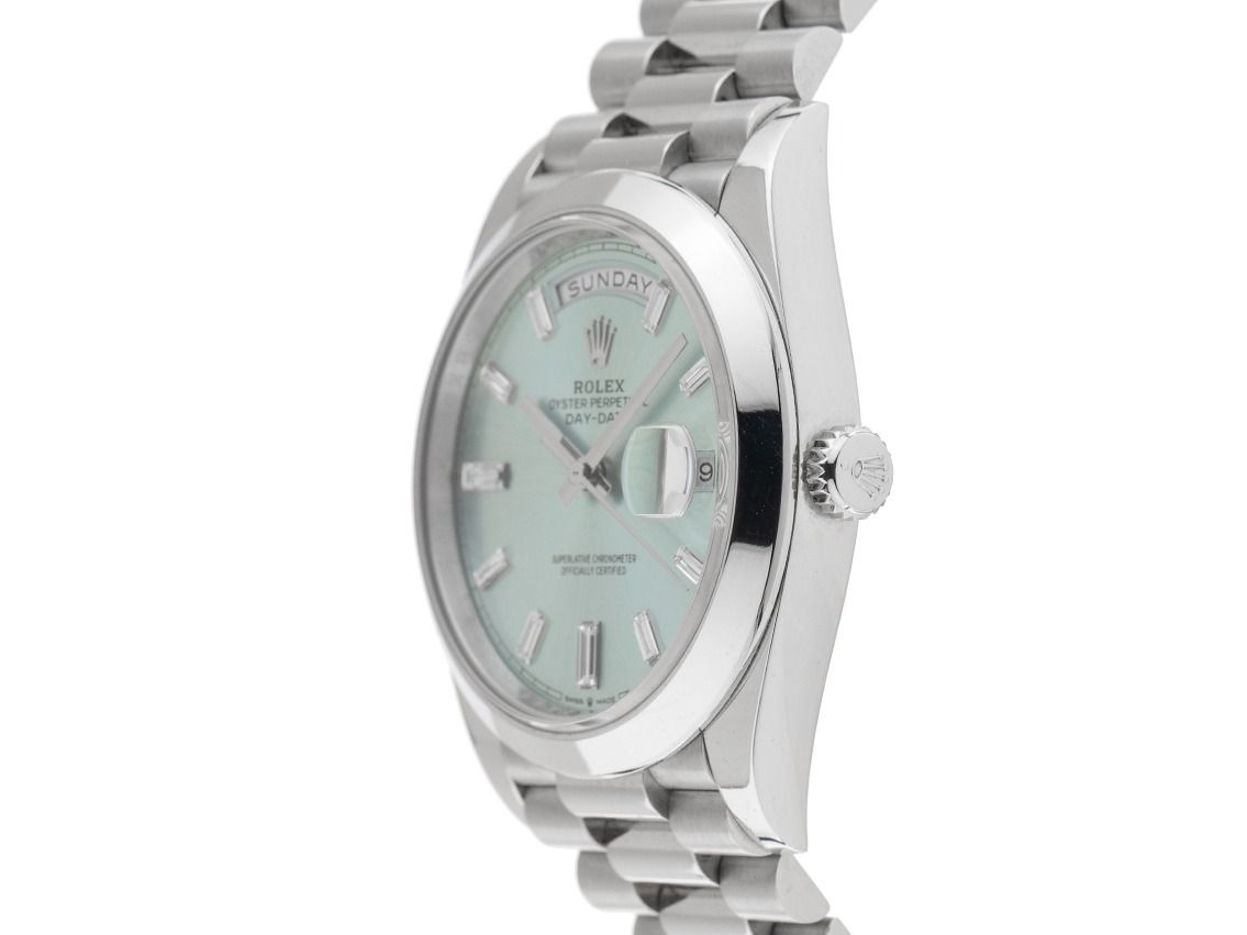 Behuizing 950 platina gepolijst en gesatineerd, behuizingsdiameter zonder kroon 40mm, behuizingshoogte 12,2mm. Lunette 950 platina glad en gepolijst. President armband 950 platina gepolijst en gesatineerd, verborgen Rolex Crownclasp-vouwsluiting van 950 platina met fabrikantlogo. Wijzerplaat ijsblauw met 10 opgezette in witgoud gefacetteerde diamantindexen in baguetteslijp en witgouden wijzers. Uurwerk automatisch, chronometer met certificaat, Rolex manufactuurkaliber 3255 met 31 edelstenen. Weergave van uur, minuut en seconde via centrale wijzers met seconde-stop voor nauwkeurige tijdinstelling, datumaanduiding met snelle aanpassing onder vergrootglas bij 3 uur, weekdagweergave in het Engels bij 12 uur. Saffierglas krasbestendig. Kroon schroefbaar met fabrikantlogo. Achterkant 950 platina geschroefd. Gewicht van het horloge inclusief armband 259g, lengte van de armband inclusief behuizing 175mm. Waterdicht tot 10 ATM. Referentienummer: 228206, ID: KS18181300000326HW-95000/70850, artikelnummer: 10000085090. Originele Rolex Jumbo Box met omdoos en garantiepapieren van juni 2021, nieuwe Rolex garantiekaart zonder landcode evenals beschrijving, lederen etui, lunettebescherming, Rolex chronometerzegel en datum, evenals de eerste aankoopfactuur en uittreksel van het horloge-register van maart 2026, The Watch Register certificaat / zonder vermelding (Internationale database voor verloren of gestolen horloges), Full Set. Investering met waardevermeerderingspotentieel, zeer zeldzaam verzamelobject. Als nieuw. Leveringstijd direct.