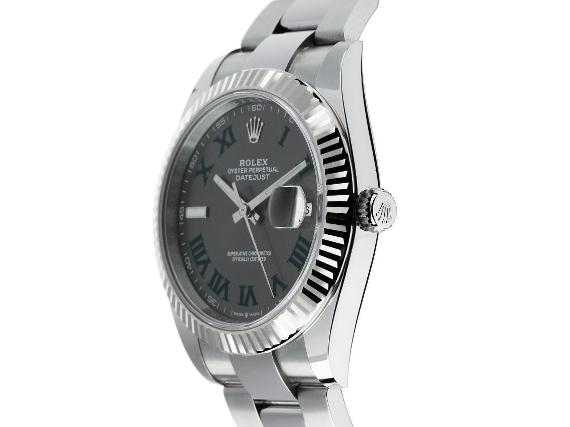 Gehuiste van gepolijst en satijn afgewerkt roestvrij staal, behuizingsdiameter zonder kroon 41mm, behuizingshoogte 11,6mm. Lünette van 18kt witgoud, geribbeld en gepolijst. Oyster armband van gepolijst en satijn afgewerkt roestvrij staal, vouwsluiting van roestvrij staal met fabrikantlogo. Wijzerplaat Wimbledon leisteengrijs met opgezette luminescerende index, donkergroene Romeinse cijfers en witgouden luminescerende wijzers. Automatisch uurwerk, chronometer met certificaat, Rolex manufactuurkaliber 3235 met 31 edelstenen, gangreserve van ongeveer 70 uur. Weergave van uur, minuut en seconde via centrale wijzers met seconde-stop voor nauwkeurige tijdinstelling, datumweergave met snelle instelling onder vergrootglas bij 3 uur. Krasbestendig saffierglas. Schroefkroon met fabrikantlogo. Achterkant van roestvrij staal, geschroefd. Gewicht van het horloge inclusief armband 141g, lengte van de armband inclusief behuizing 185mm. Waterdicht tot 10 ATM. Referentienummer: 126334, behuizingsnummer: 6H286XXX, ID: P2688226000326HW-16200/11250, artikelnummer: 10000085112. Originele Rolex doos met omdoos en garantiepapieren van februari 2022, nieuwe Rolex garantiekaart zonder landcode, evenals beschrijving, lederen etui, Rolex chronometerzegel en uittreksel van het horlogeregister van maart 2026, The Watch Register certificaat / zonder vermelding (Internationale database voor verloren of gestolen horloges), Full Set. Investering met waardestijgingspotentieel. Als nieuw. Leveringstijd direct.