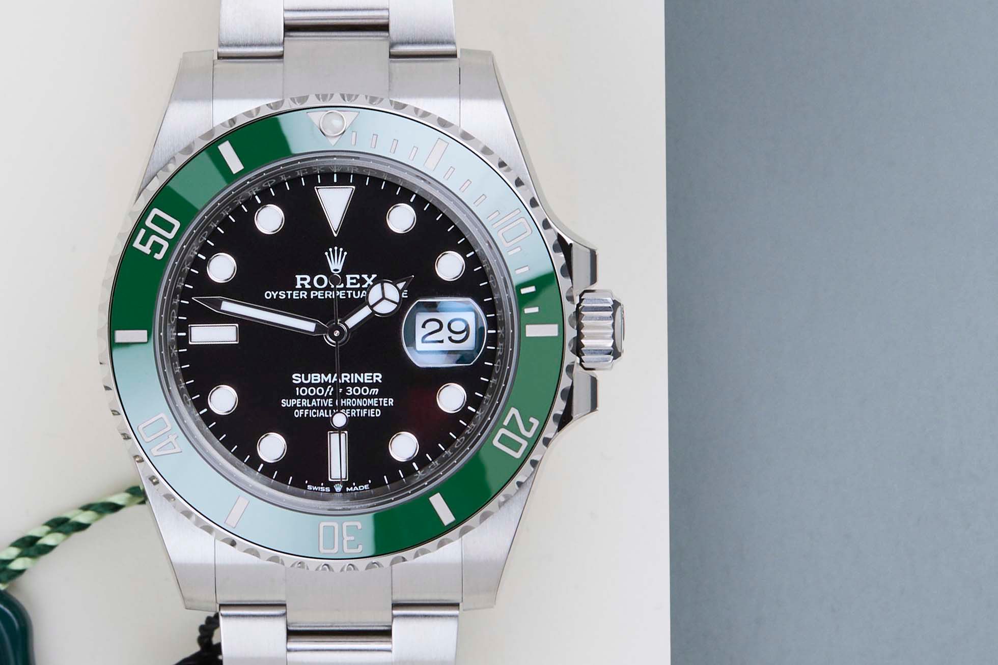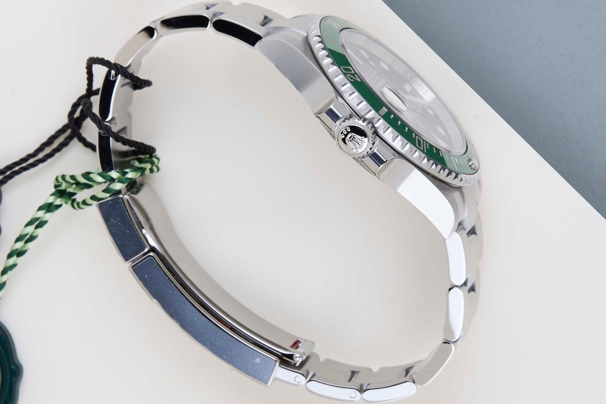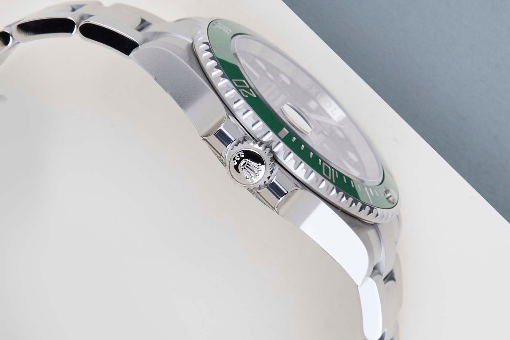 Het horloge is volledig gemaakt van roestvrij staal. Rolex gebruikt 904L in zijn stalen horloges, wat een extreem resistente en hoog polijstbare superlegering is. Deze generatie van de Submariner is uitgerust met een Chromalight wijzerplaat die te herkennen is aan de blauwe luminescentie. Deze Submariner Date komt met een zwarte wijzerplaat en groene bezel, wat kan worden afgeleid van de referentie 126610LV, Lunette Verte.