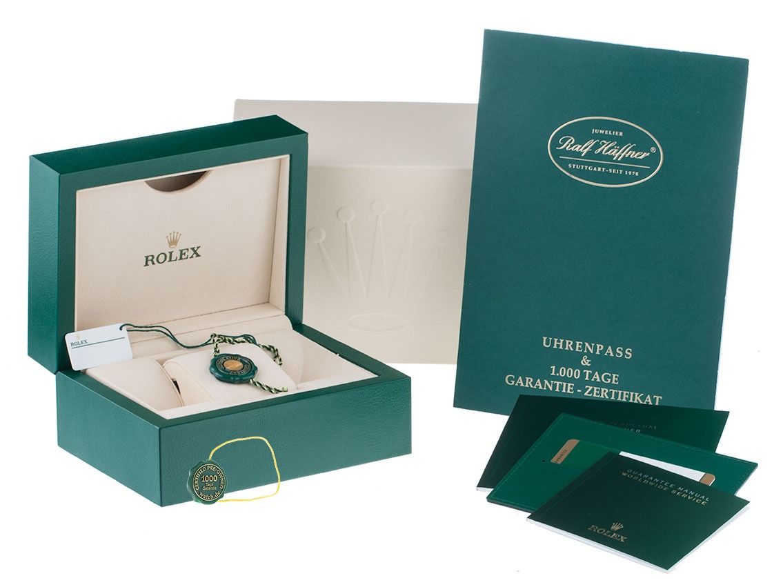 Inklusive certified pre owned Siegel / Uhrenpass mit einem Farbbild, der genauen Beschreibung sowie dem Wiederbeschaffungswert der Uhr über 20200,-€ und 1000 Tage Garantie ab Kaufdatum.