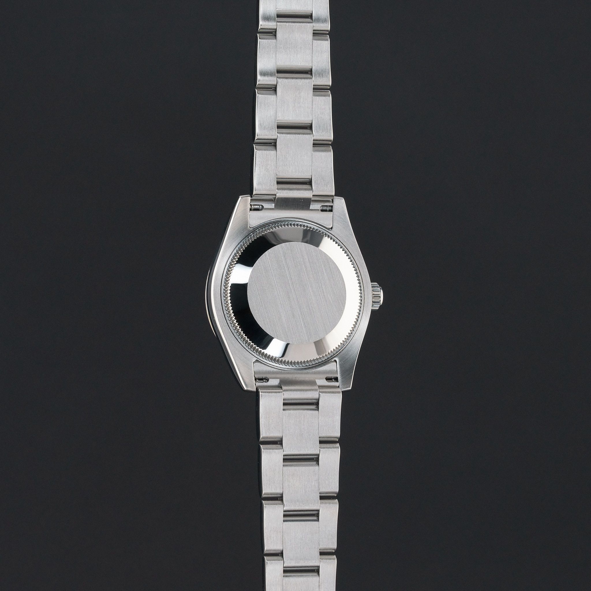 Deze Rolex Oyster Perpetual 177234 heeft een roze Romeinse diamanten wijzerplaat en is gemaakt van roestvrij staal, met een productiejaar van 2008.