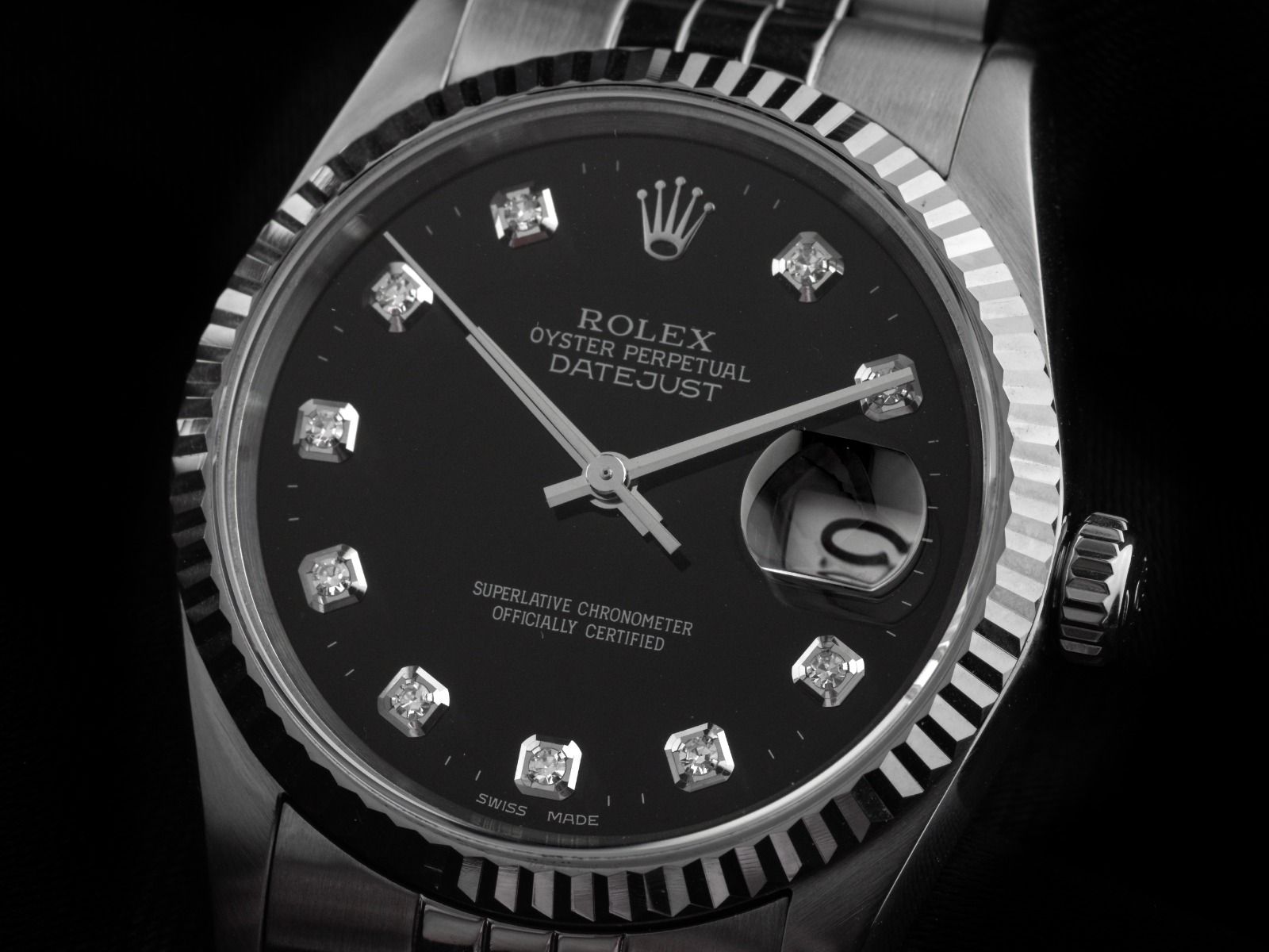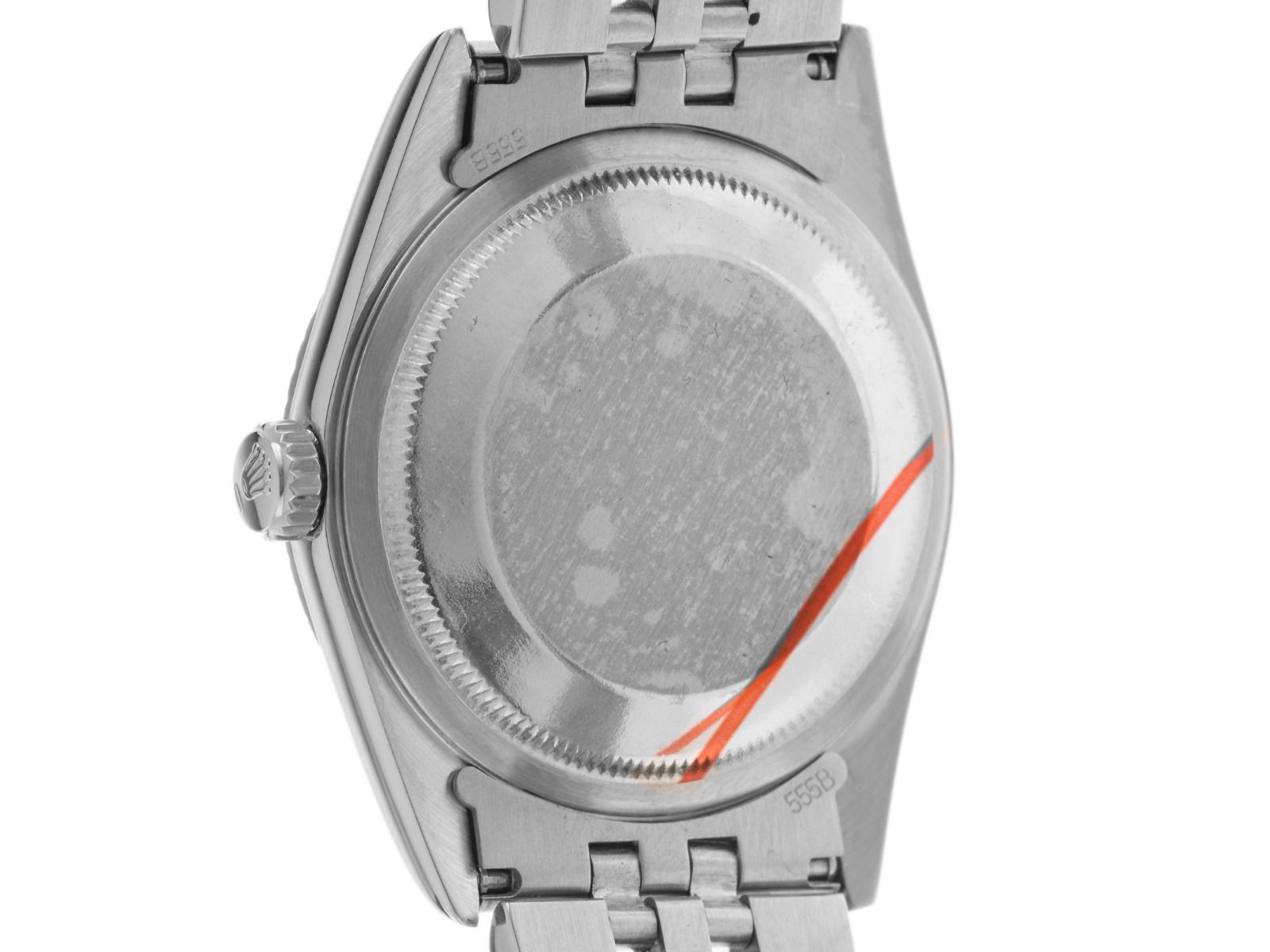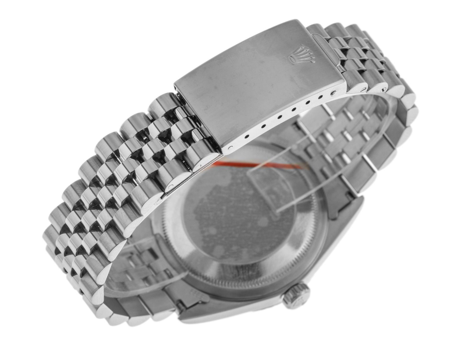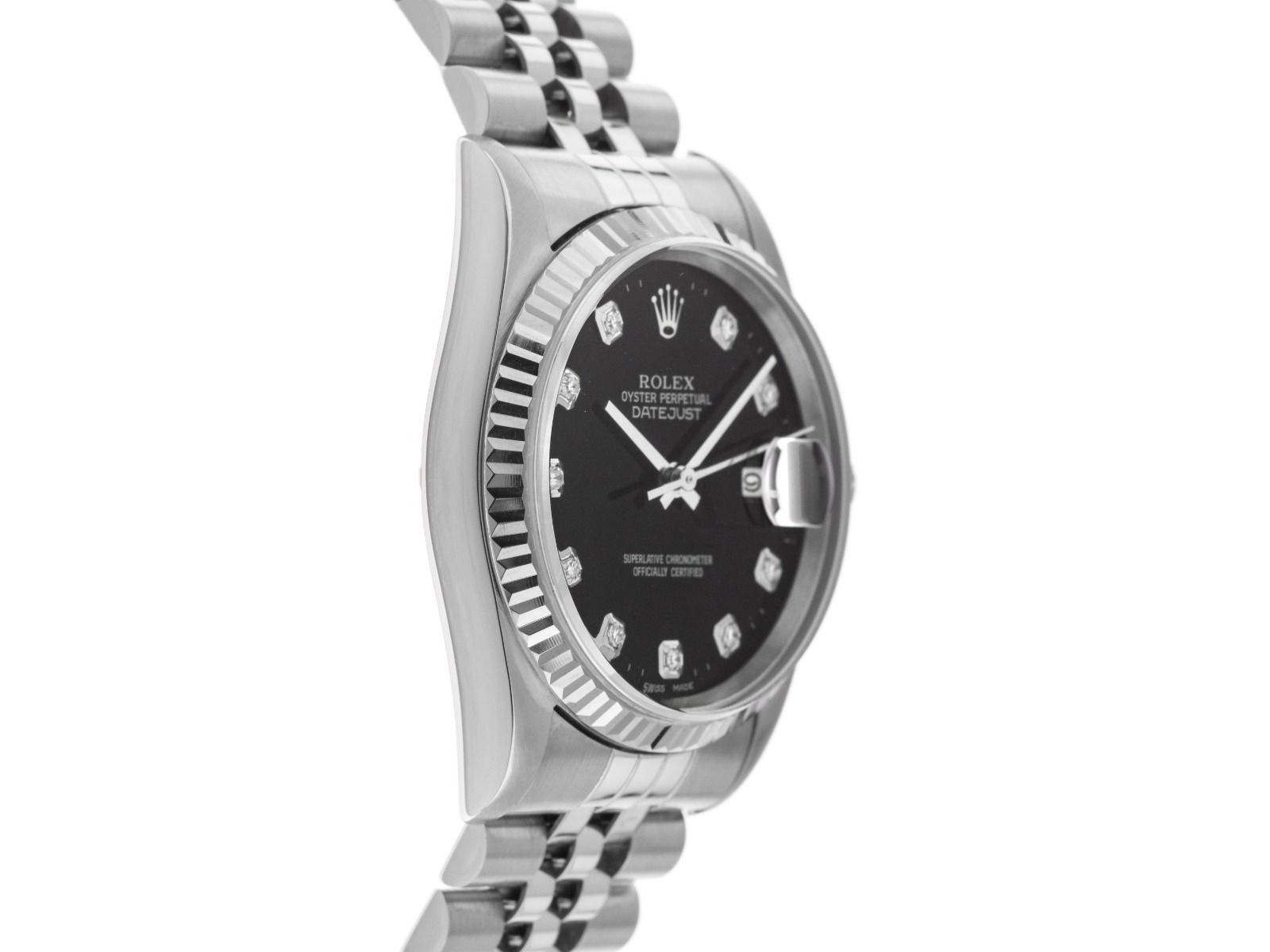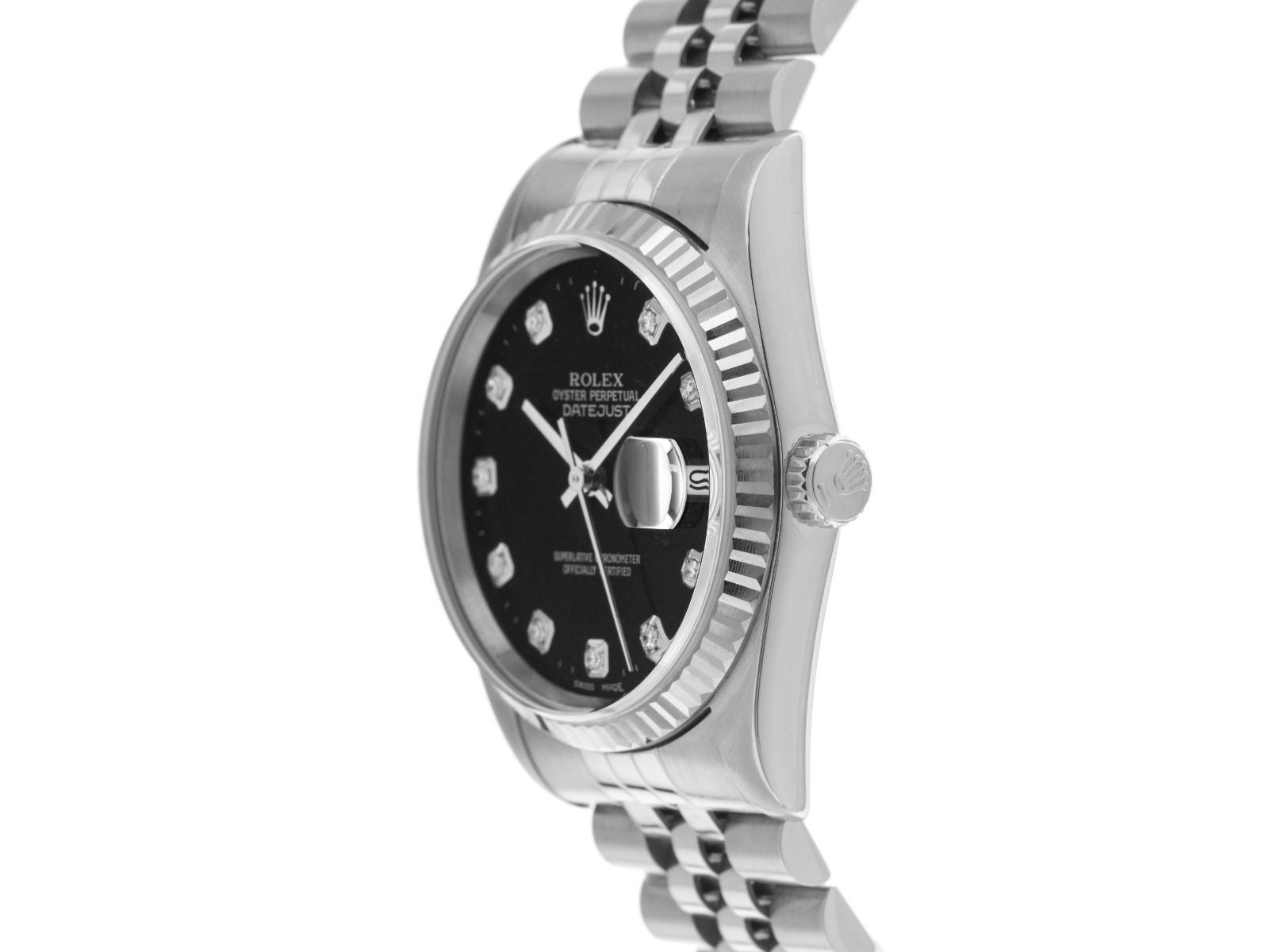 Gehuis van gepolijst en gesatineerd roestvrij staal, behuizingsdiameter zonder kroon 36mm, behuizingshoogte 11,6mm. Lunette van 18kt witgoud, geribbeld en gepolijst. Jubileearmband van gepolijst en gesatineerd roestvrij staal, vouwsluiting van roestvrij staal met fabrikantlogo. Wijzerplaat zwart met opgezette in witgoud gefacetteerde diamantindexen en witgouden wijzers. Uurwerk automaat, chronometer met certificaat, Rolex manufactuurkaliber 3135 met 31 edelstenen. Weergave van uur, minuut en seconde via centrale wijzers met seconde-stop voor nauwkeurige tijdinstelling, datumweergave met snelverstelling onder vergrootglas bij 3 uur, open 6/9 (open 6 en 9 in de datumweergave). Saffierglas krasbestendig. Kroon met schroefdraad en fabrikantlogo. Achterkant van roestvrij staal, geschroefd. Gewicht van het horloge inclusief armband 91g, lengte van de armband inclusief behuizing 170mm. Referentienummer: 16234, behuizingsnummer: W142XXX, bouwjaar: 1995, ID: KA1820152520326H-11200, artikelnummer: 10000085095. Met gangcontrole en volledige uiterlijke opfrissing van maart 2026. Originele Rolex doos met omdoos en garantiepapieren zonder datumvermelding, evenals beschrijving, leren etui, vertaalboekje, Rolex chronometerzegel en uittreksel van het Watch Register van maart 2026, The Watch Register certificaat / zonder vermelding (internationale database voor verloren of gestolen horloges), Full Set. Superdeal, investering met waardestijgingspotentieel, zeer zeldzaam verzamelobject. Zeer goede staat. Leveringstijd direct.