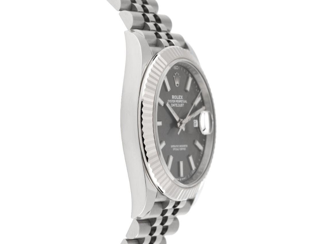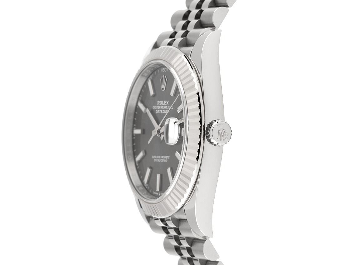 Kast van gepolijst en gesatineerd staal, kastdiameter zonder kroon 41mm, kasthoogte 11,6mm. Lunette van 18kt witgoud, geribbeld en gepolijst. Jubileearmband van gepolijst en gesatineerd staal, Rolex vouwsluiting van staal met fabrikantlogo. Wijzerplaat van rhodium met opgezette, in witgoud gefacetteerde luminescente indexen en witgouden luminescente wijzers. Uurwerk automatisch, chronometer met certificaat, Rolex manufactuurkaliber 3235 met 31 edelstenen. Gangreserve van ongeveer 70 uur. Weergave van uur, minuut en seconde via centrale wijzers met seconde-stop voor nauwkeurige tijdinstelling, datumaanduiding met snelle instelling onder vergrootglas op 3 uur. Saffierglas krasbestendig. Schroefkroon met fabrikantlogo. Achterkant van staal. Gewicht van het horloge inclusief armband 130g, lengte van de armband inclusief kast 175mm. Waterdicht tot 10 ATM. Referentienummer: 126334, kastnummer: 76J1LXXX, ID: P2697170000326HW-15800/11450, artikelnummer: 10000085168. Met gangcontrole en volledige uiterlijke opfrissing van maart 2026. Originele Rolex doos en garantiepapieren van november 2021, nieuwe Rolex garantiebewijs zonder landcode, evenals beschrijving, leren etui, Rolex chronometerzegel en Watchregister uittreksel van maart 2026, The Watch Register certificaat / zonder vermelding (Internationale database voor verloren of gestolen horloges), inclusief eerste aankoopfactuur van Wempe, Full Set. Investering met waardevermeerderingspotentieel. Als nieuw. Leveringstijd direct.