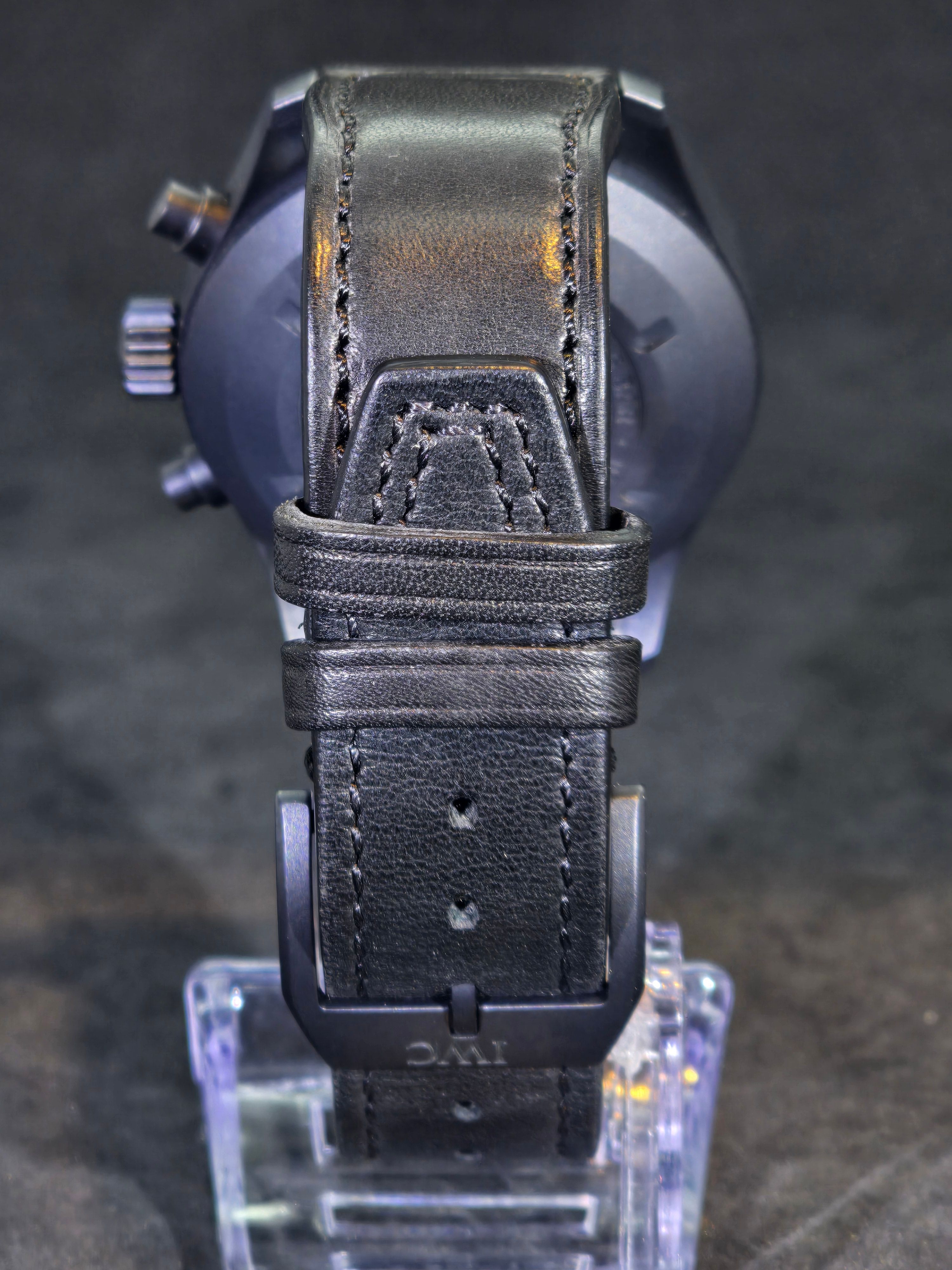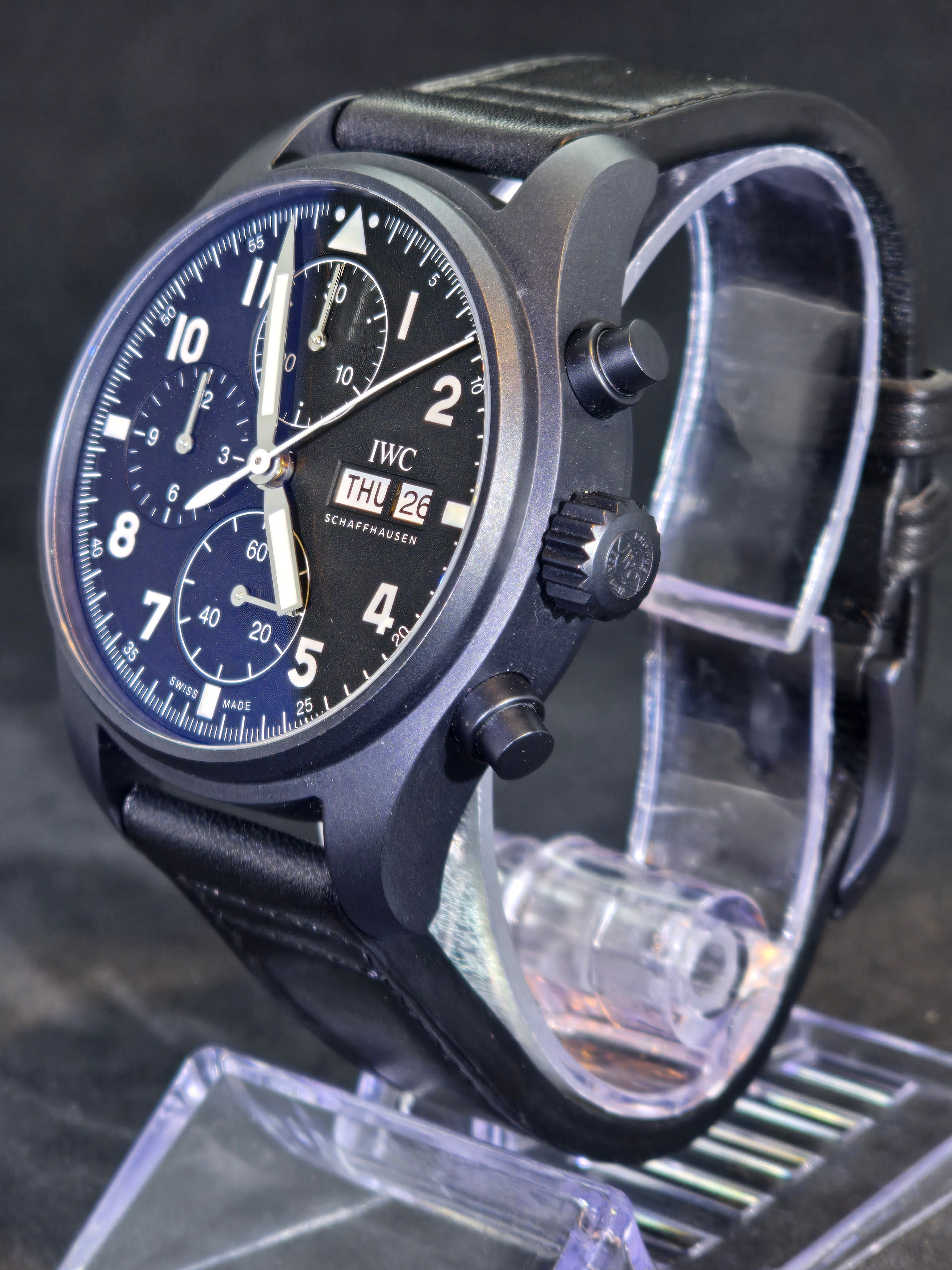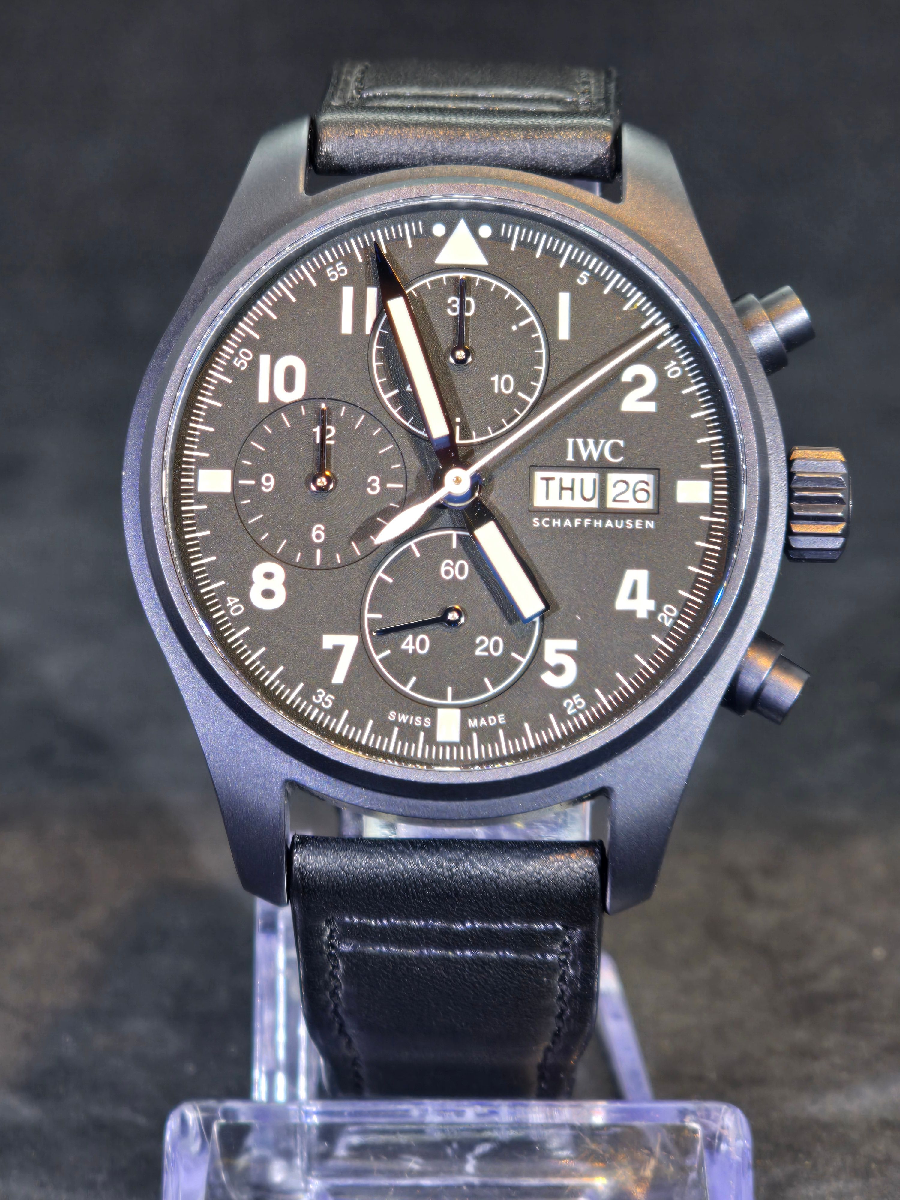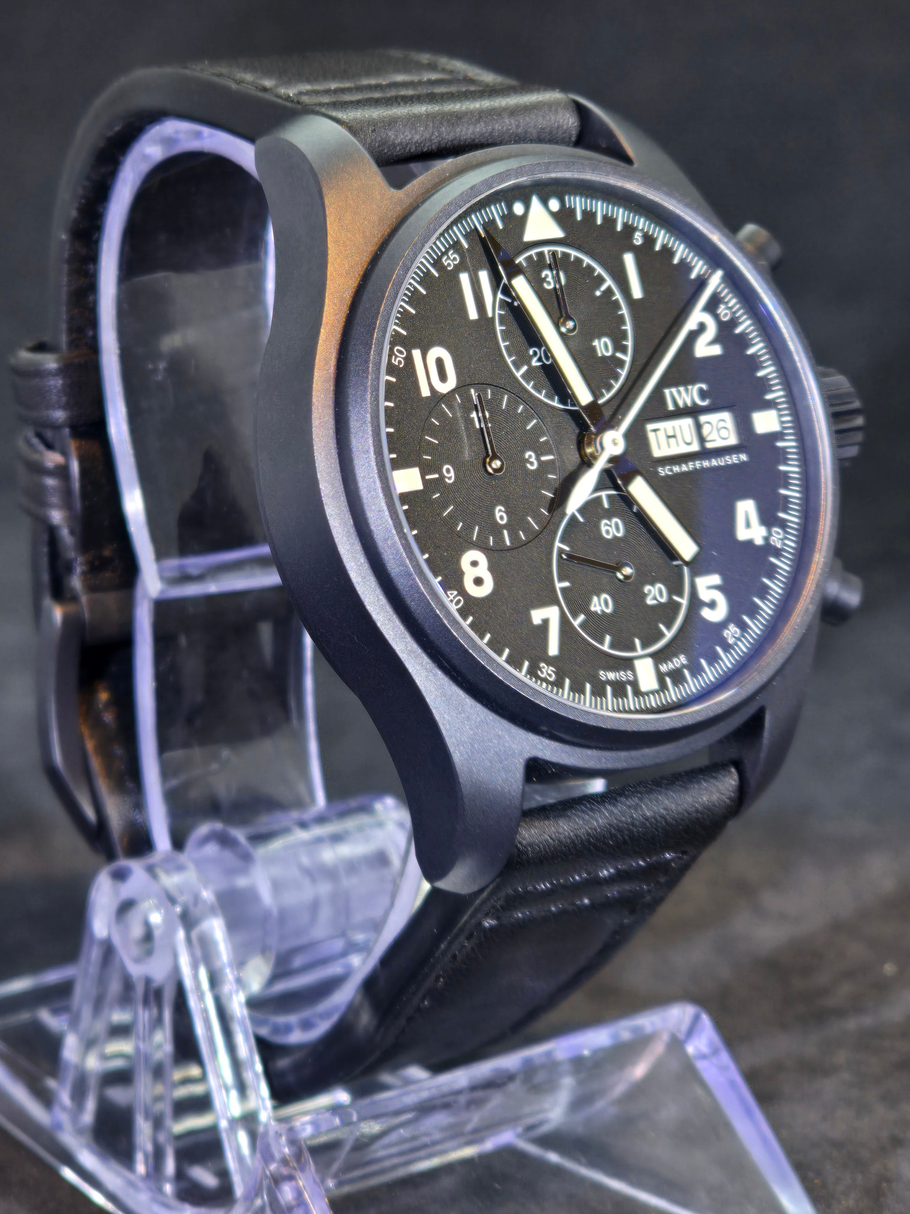 This contemporary tribute faithfully recreates the spirit of the original model while incorporating modern watchmaking standards. The watch features a black ceramic case paired with a matte black pilot-style dial, maintaining the utilitarian aviation aesthetic that defines IWC’s pilot watches. Large luminous Arabic numerals, bold hands, and clear chronograph registers ensure excellent legibility—an essential characteristic of traditional pilot instruments.