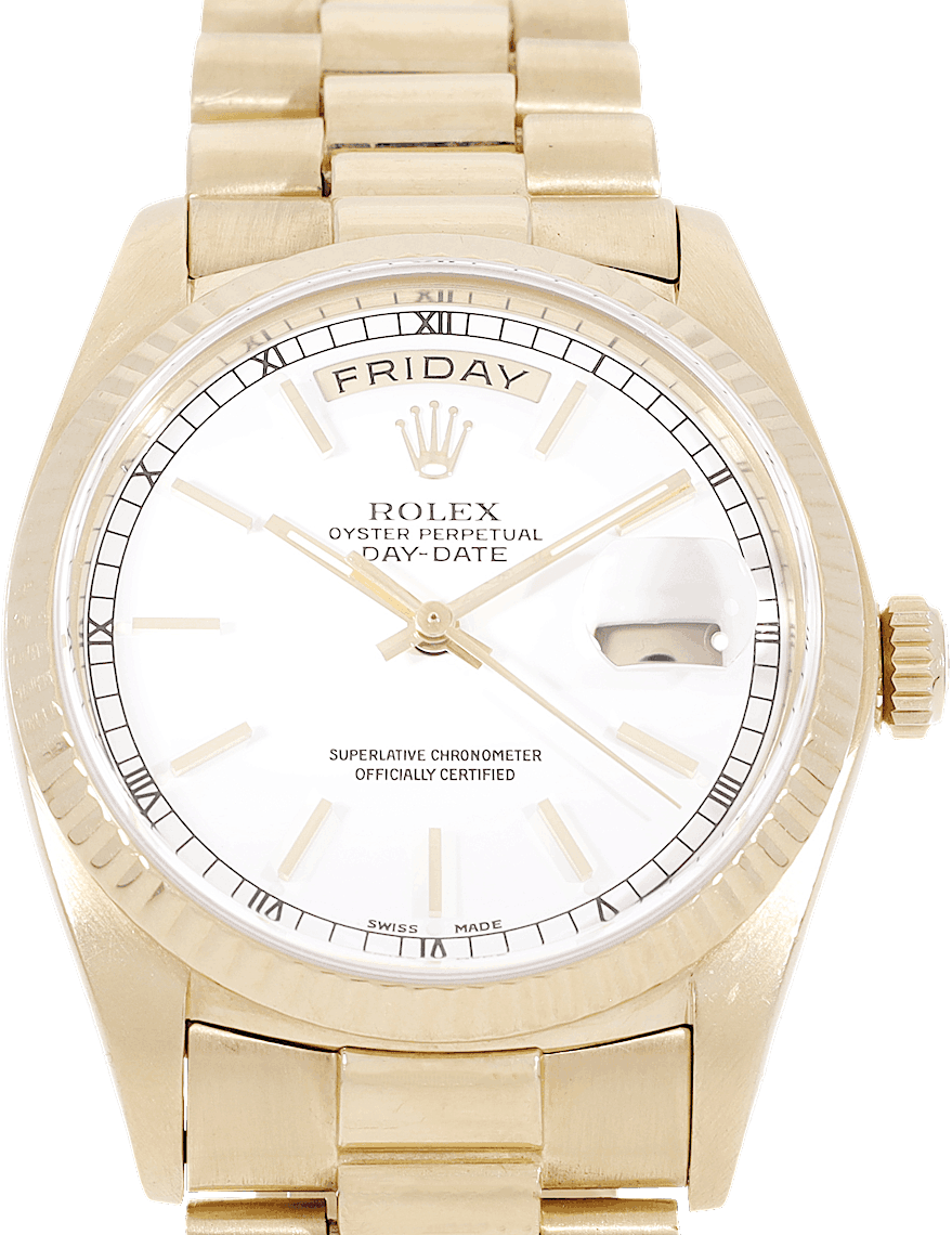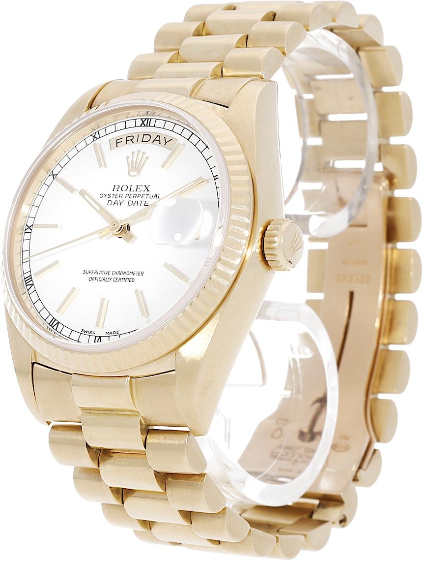 Rolex Day-Date 36, Reference: 18238, Gender: Unisex, Size: 36mm, Dial color: White, Strap material: Yellow Gold, Movement: Automatic, Condition: Pre-owned watch in original condition. Has been inspected, regulated and authenticated by certified CHRONEXT watchmakers., Documents: Chronext Certificate