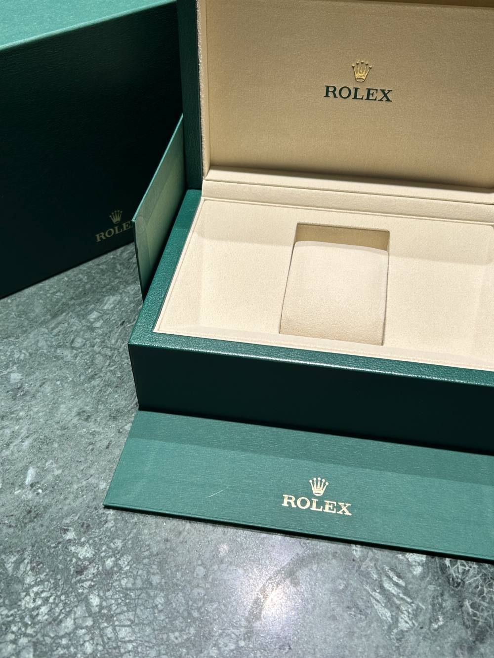 Horloge is nooit gedragen. Volledige set. Met originele Rolex doos, boekjes en garantie. Garantie is geactiveerd door de officiële dealer in 2025.