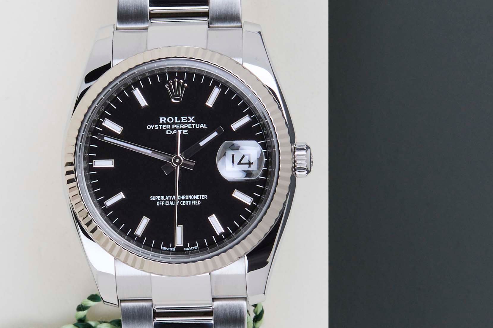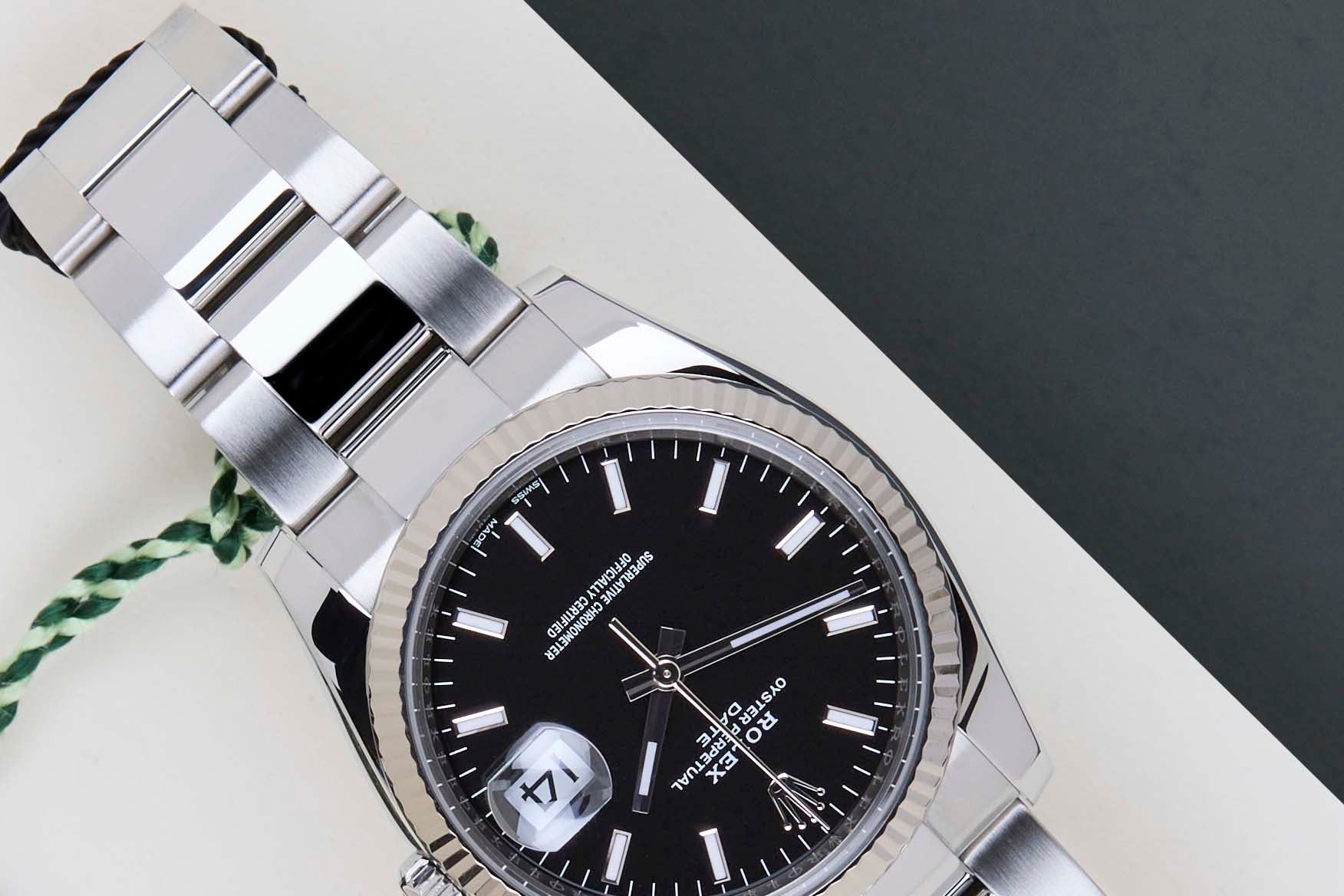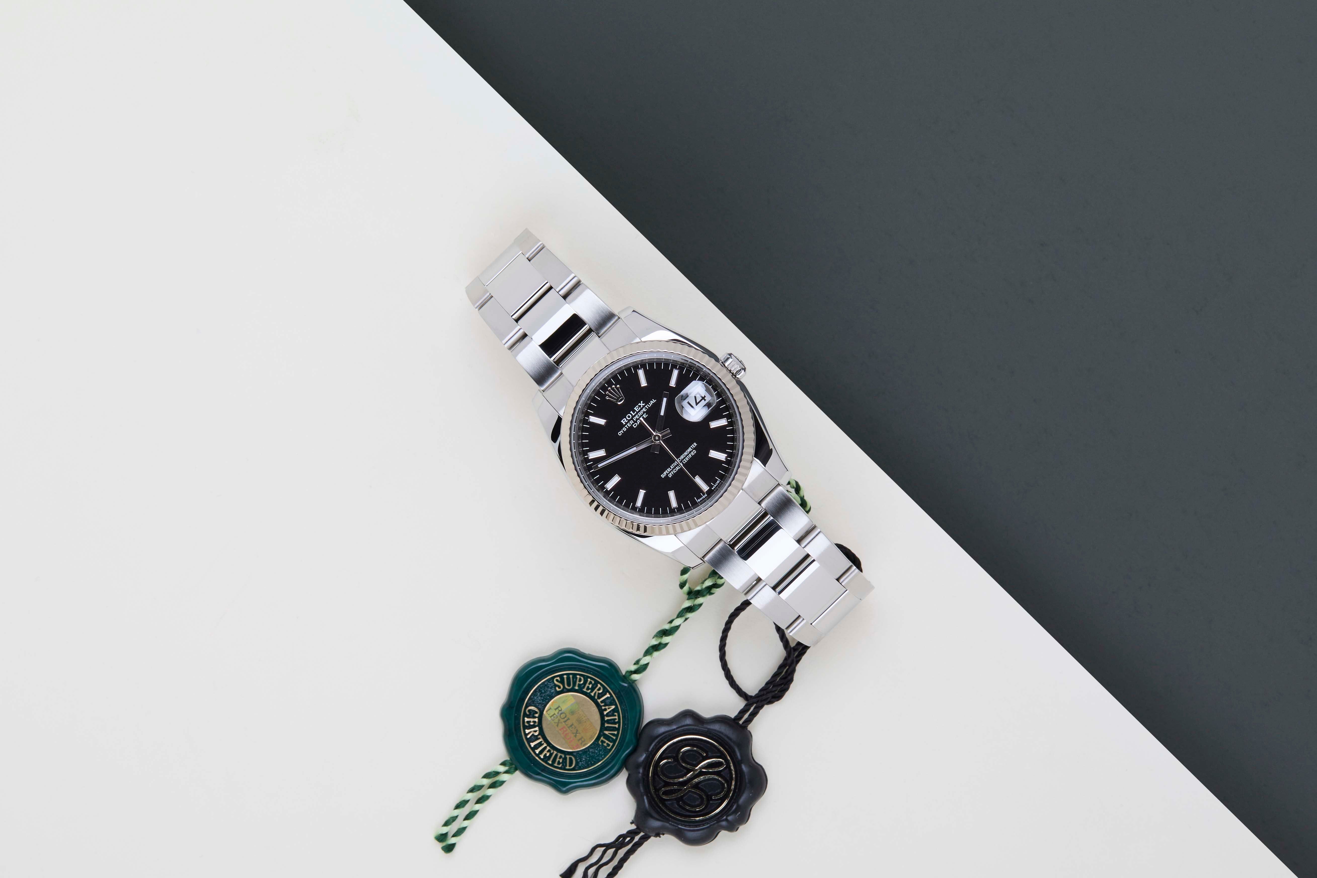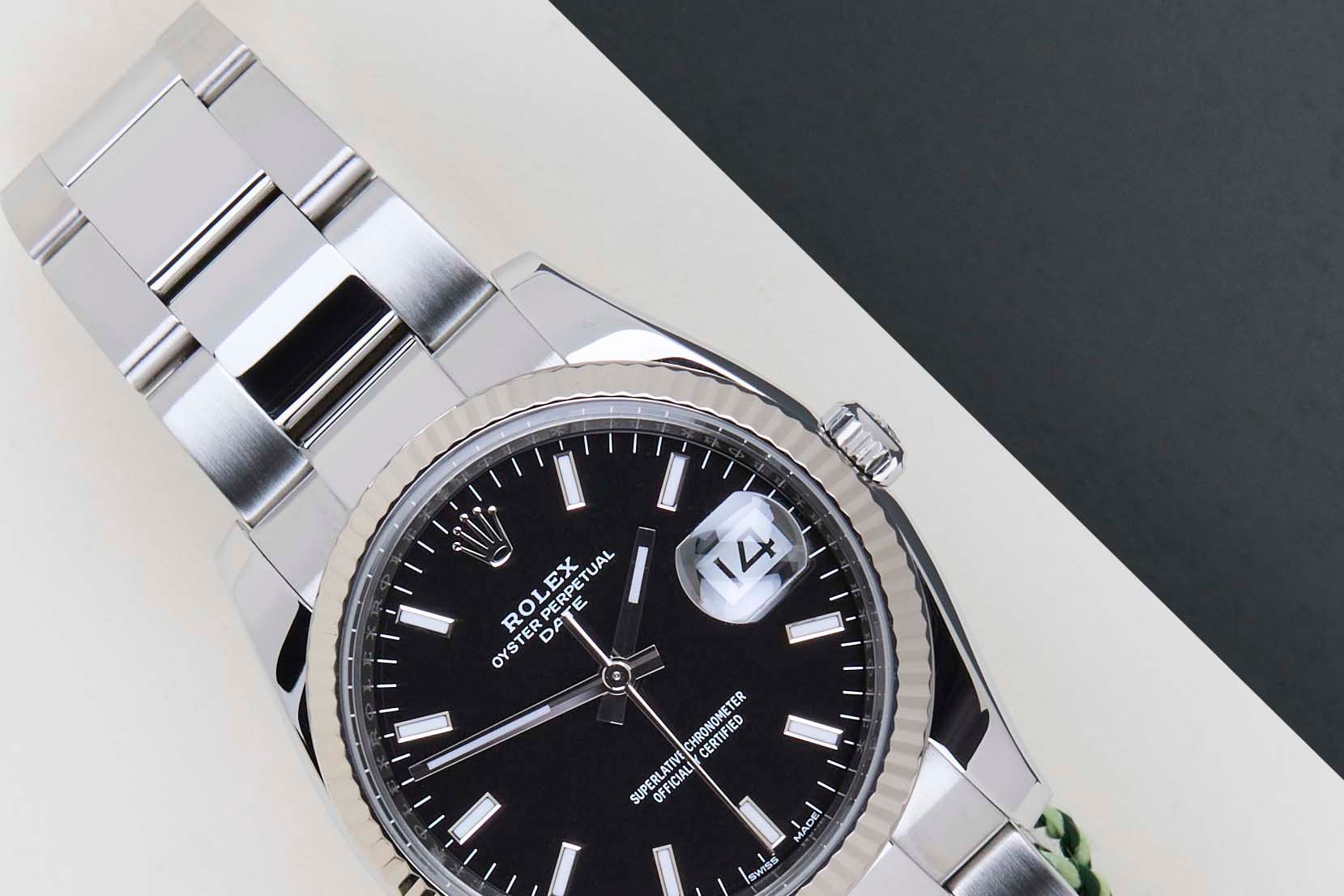 Full Set | International Rolex warranty until August 2026The Rolex Oyster Perpetual was first introduced by Rolex in the 1930s. It is characterized by its water-resistant Oyster case and self-winding Perpetual movement. The Rolex Oyster Perpetual a simple, yet elegant timepiece that is suitable for both casual and formal wear.This Rolex Oyster Perpetual Date 'Black Dial' was sold for the first time in August 2021The watch is fully made out of stainless steel and White Gold. Rolex uses 904L in its steel watches, which is an extremely resistant and highly polishable superalloy. The watch is equipped with a classic 'Black Dial'.This Rolex Date 34 is in Mint Condition and comes with the original Rolex Warranty Card and box. Furthermore, the watch has been serviced by our watchmaker, and therefore it comes with one year of warranty.
