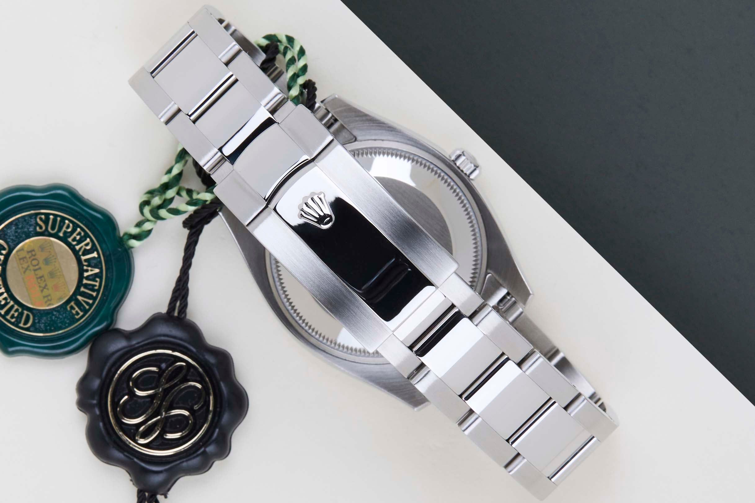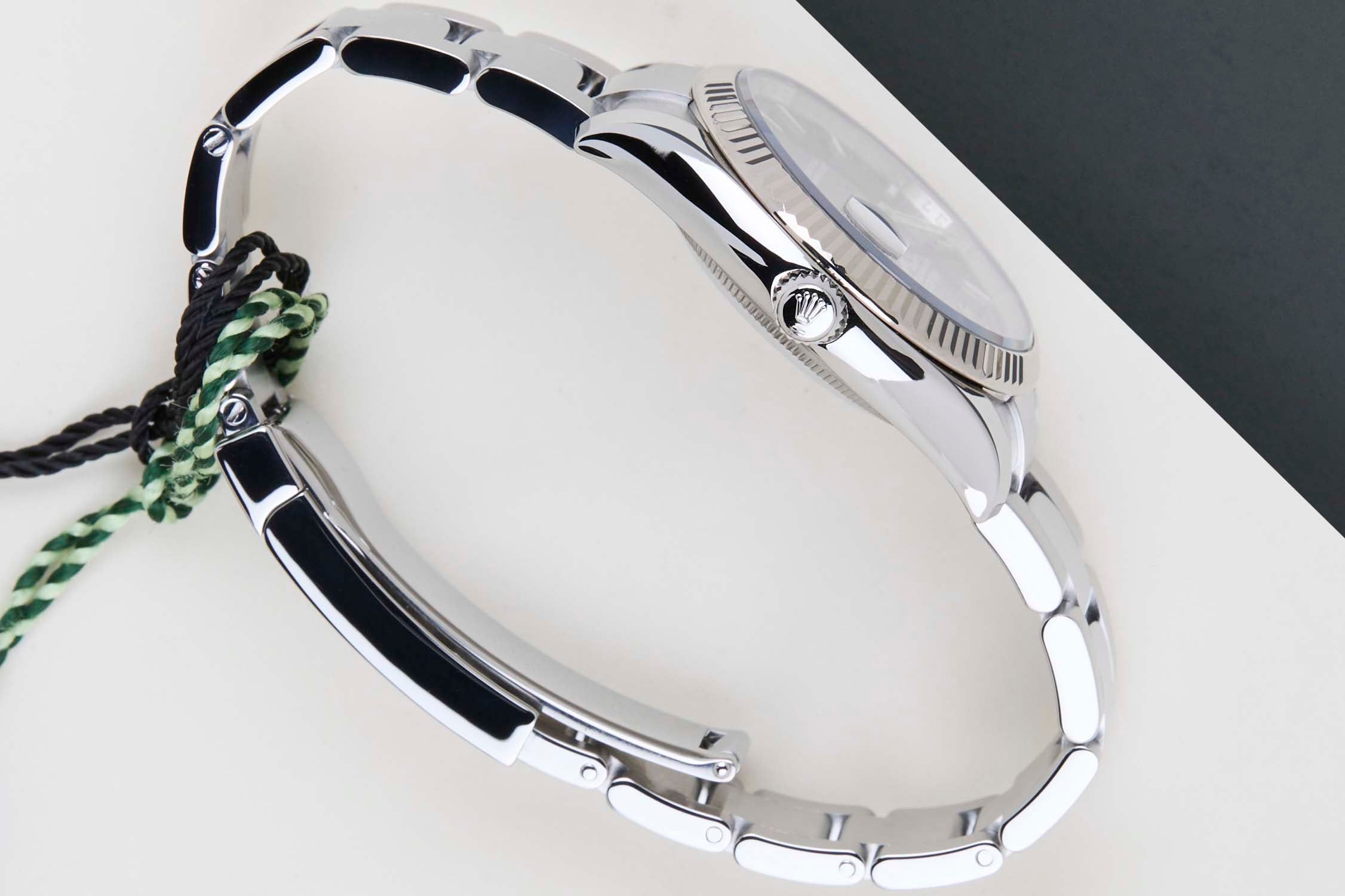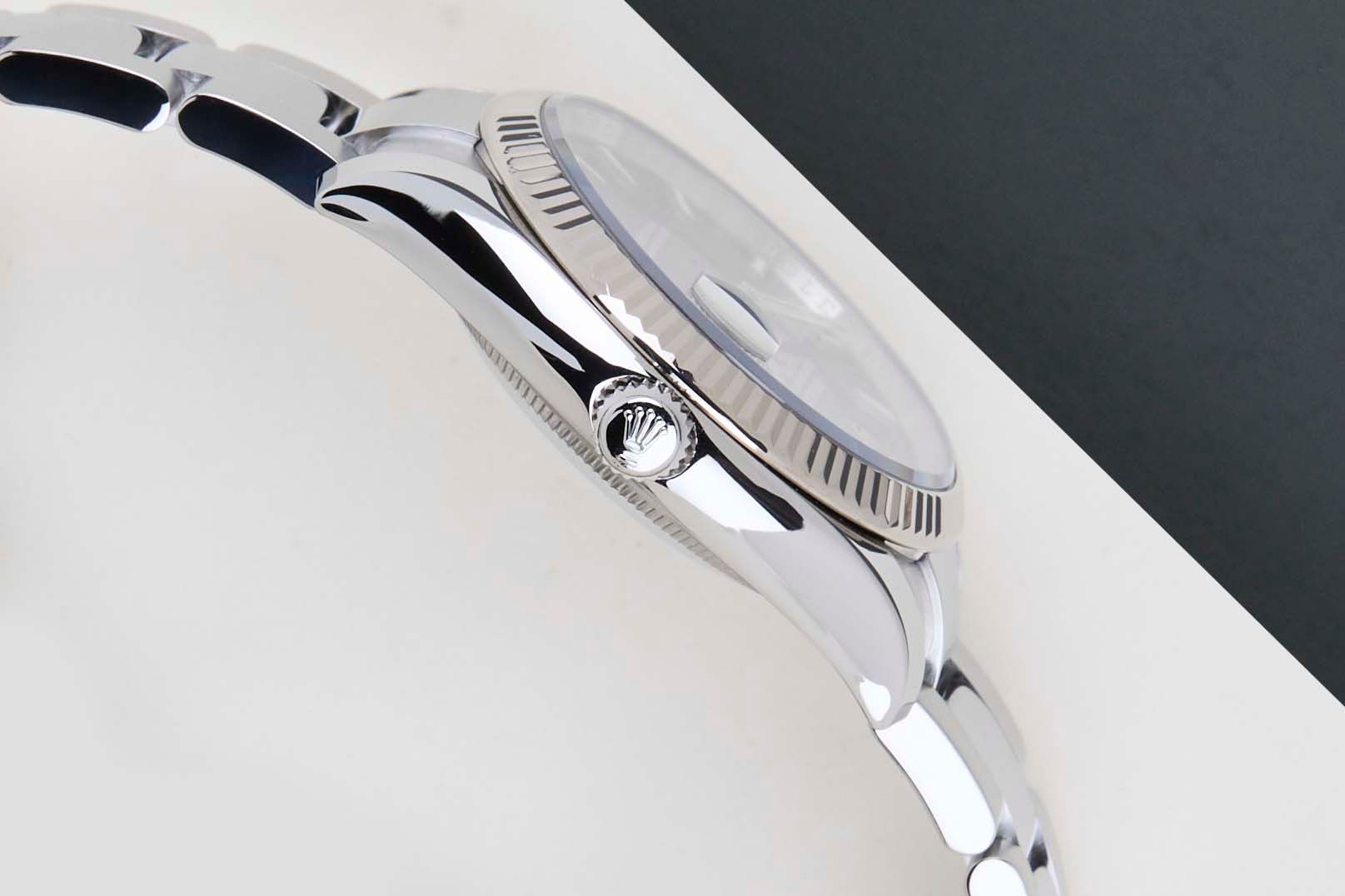 Deze Rolex Date 34 is in mint conditie en wordt geleverd met de originele Rolex Garantiekaart en doos. Bovendien is het horloge onderhouden door onze horlogemaker, en daarom komt het met een jaar garantie.
